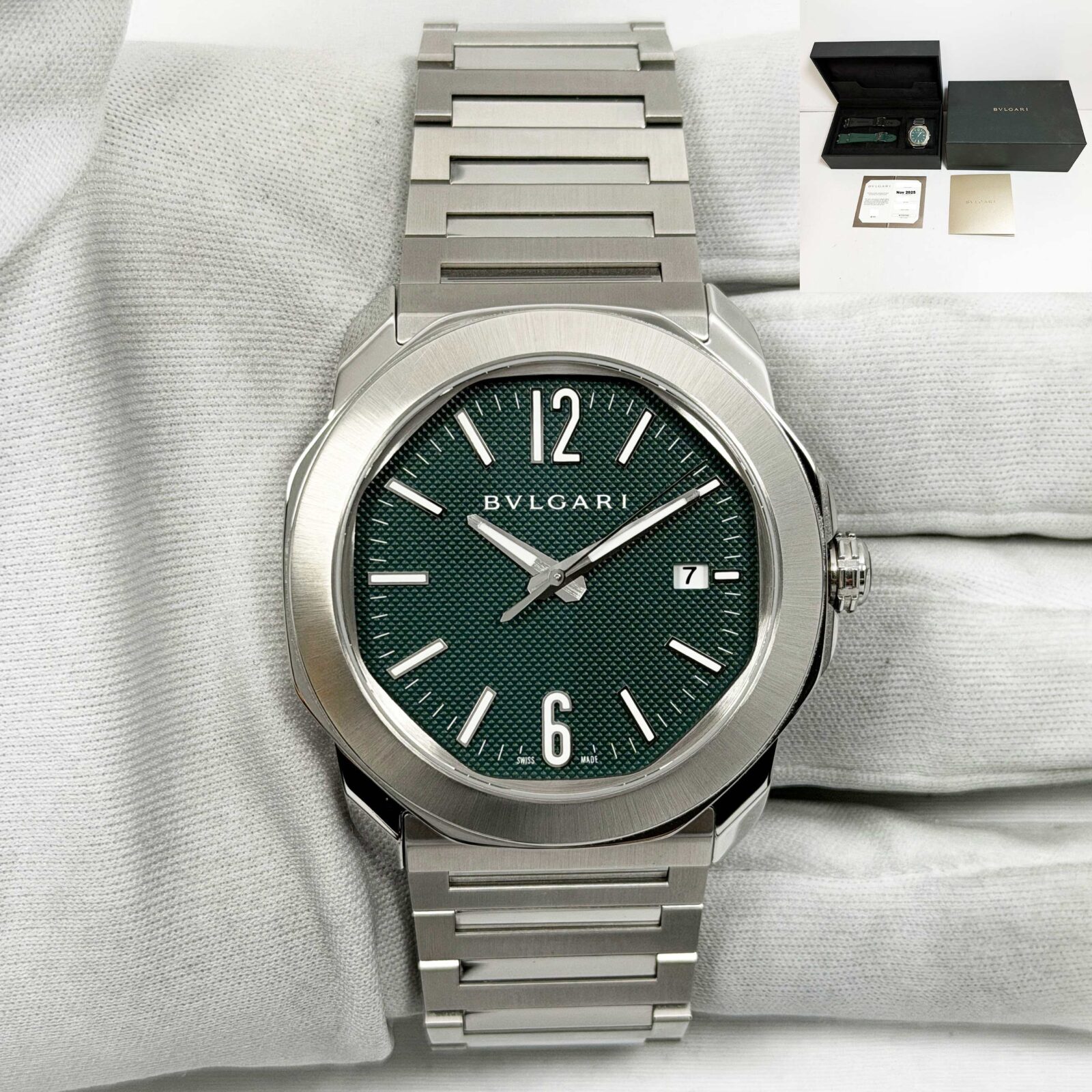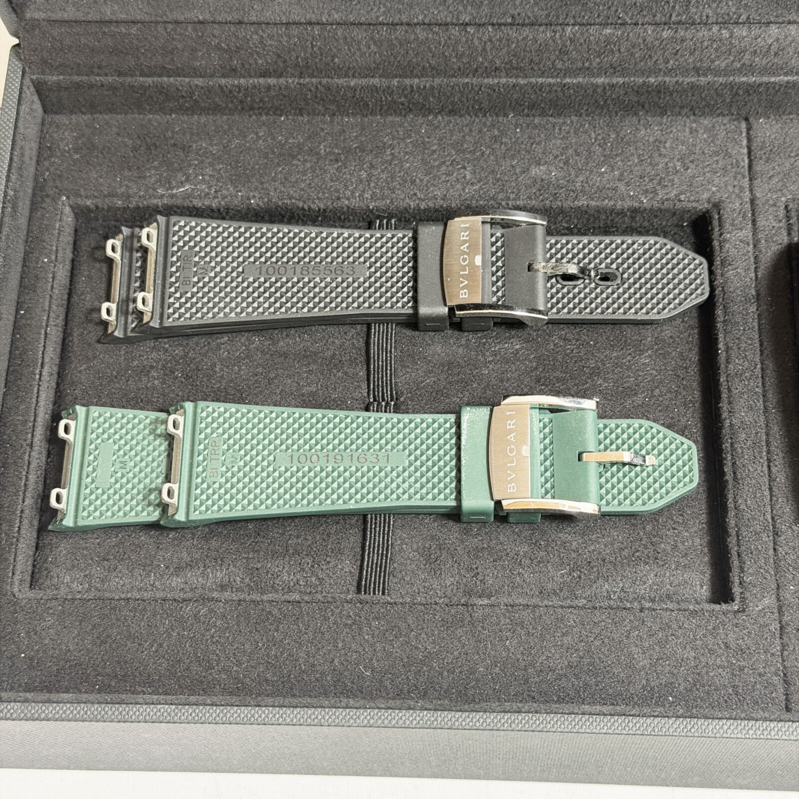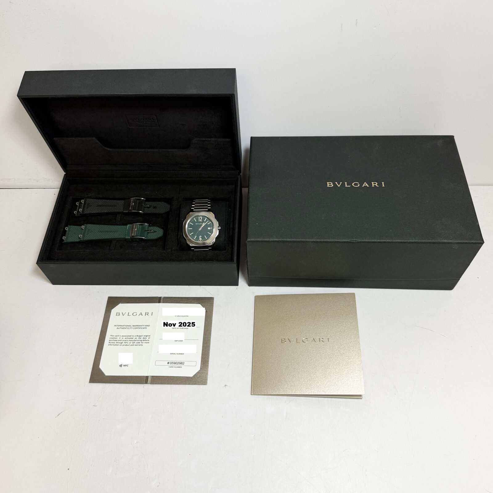 this bulgari octo watch comes with its box, extra straps, and warranty paper dated november, 2025. The photos shown are of the exact watch being sold and accurately represent its condition. This watch is in stock and ready to ship immediately!