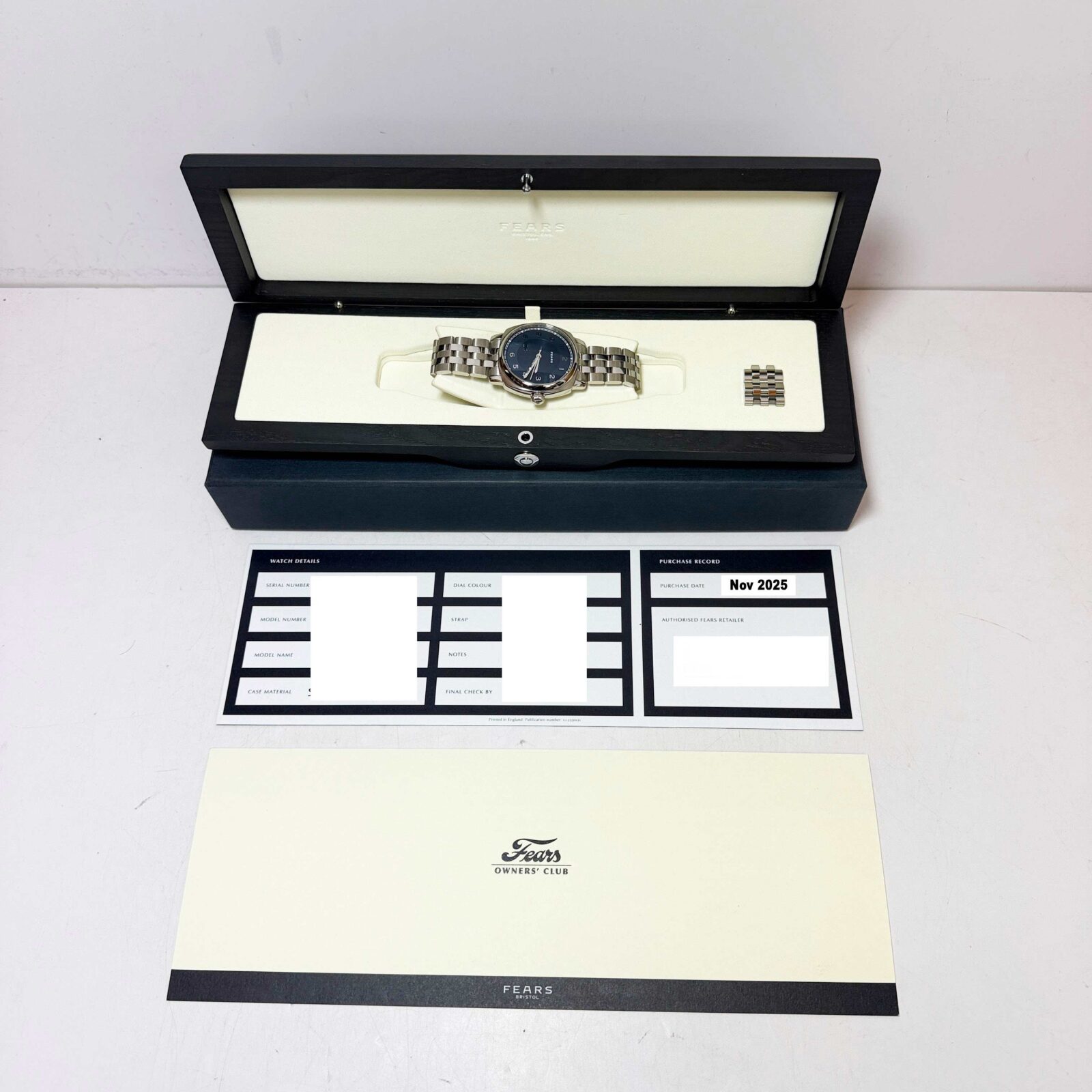 This Fears watch comes with its box, papers, and warranty card dated November, 2025. The photos shown are of the exact watch being sold and accurately represent its condition. This watch is in stock and ready to ship immediately!
