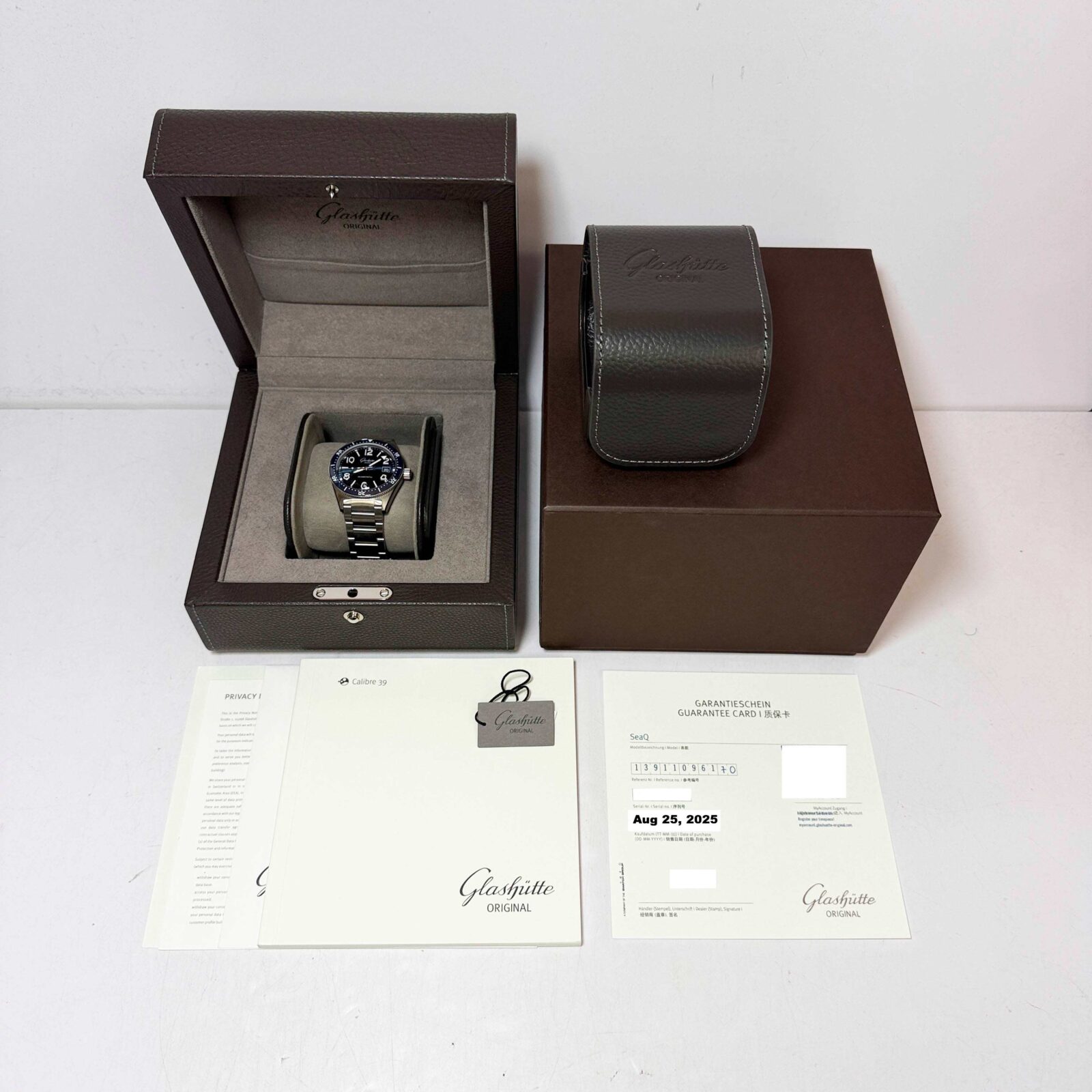 this glashütte original seaq watch comes with its box, booklets, hangtag, and warranty paper dated august 25th, 2025. The photos shown are of the exact watch being sold and accurately represent its condition. This watch is in stock and ready to ship immediately!