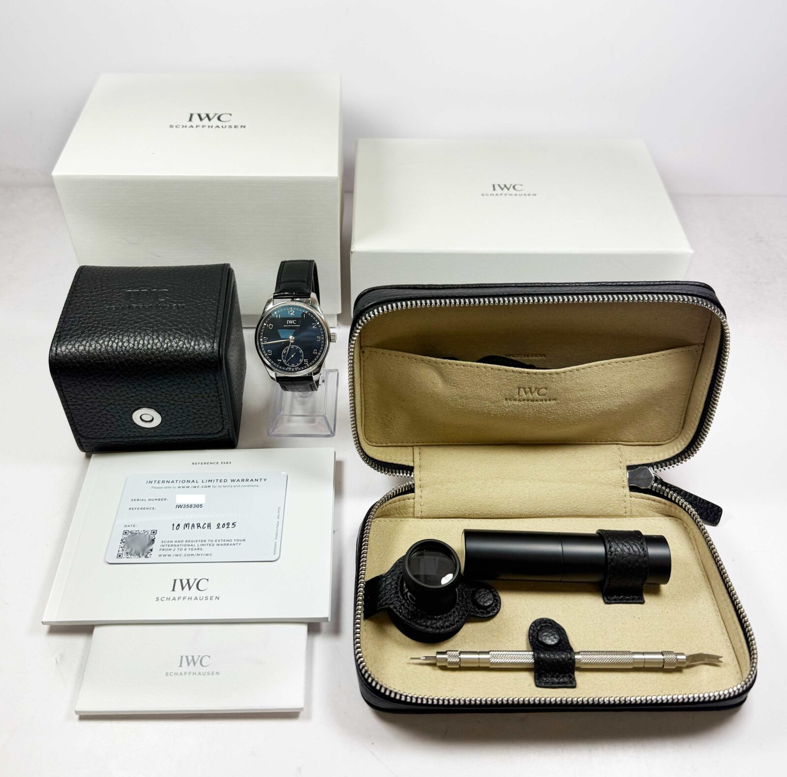 this iwc watch is in excellent condition and comes with its box, booklets, iwc tools, and warranty card dated march 10th, 2025 as shown in the pictures attached. This watch is in stock and available to ship immediately!