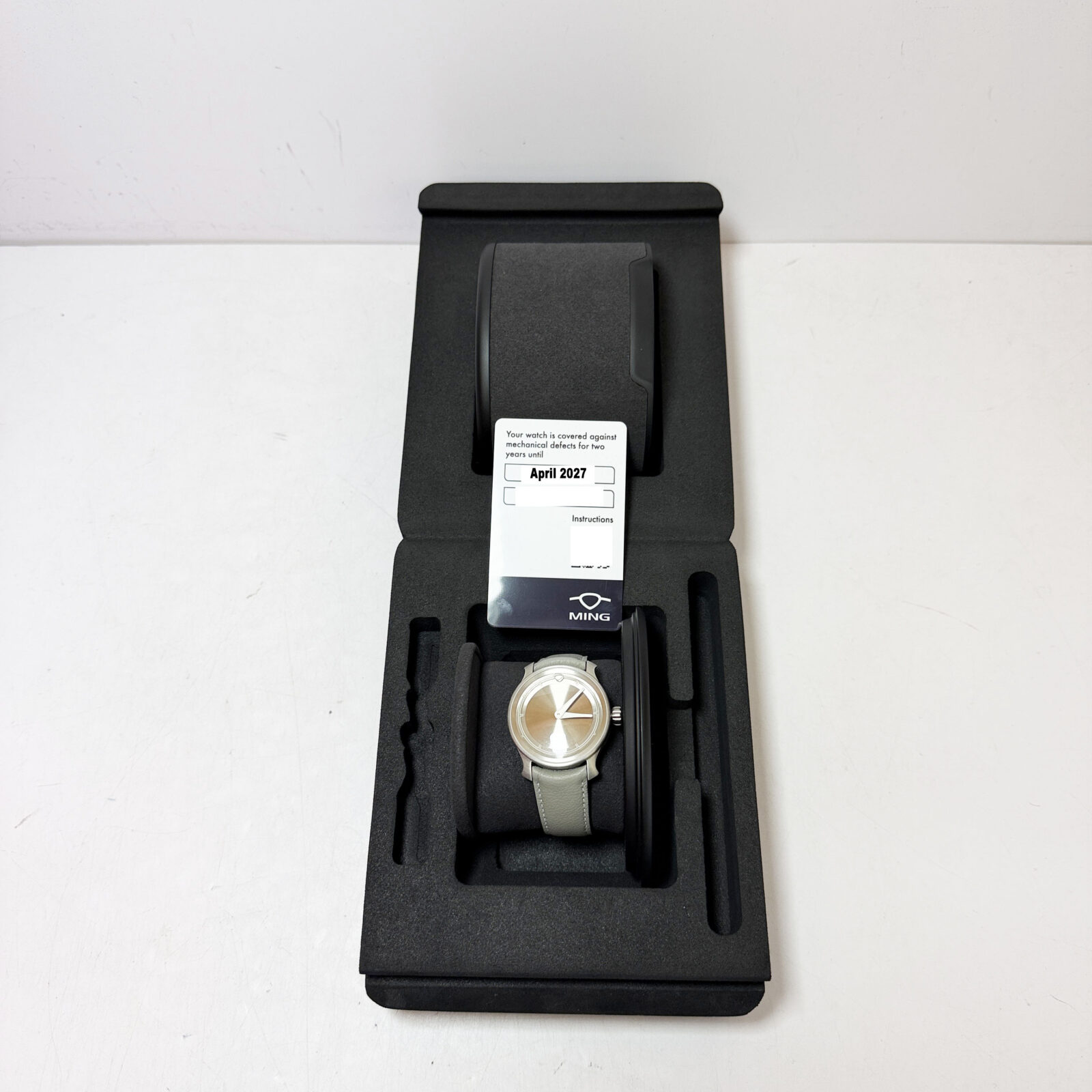 this ming watch comes with its box and warranty card dated april, 2025. The photos shown are of the exact watch being sold and accurately represent its condition. This watch is in stock and ready to ship immediately!