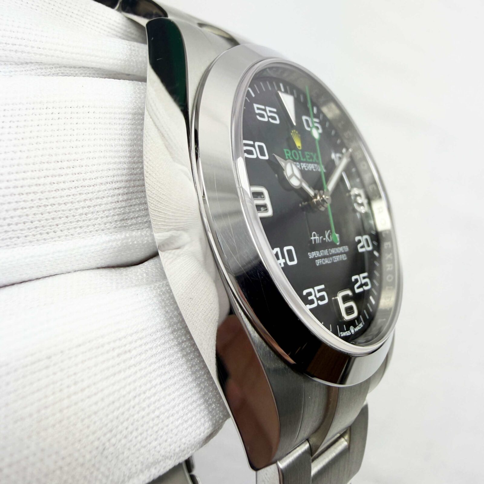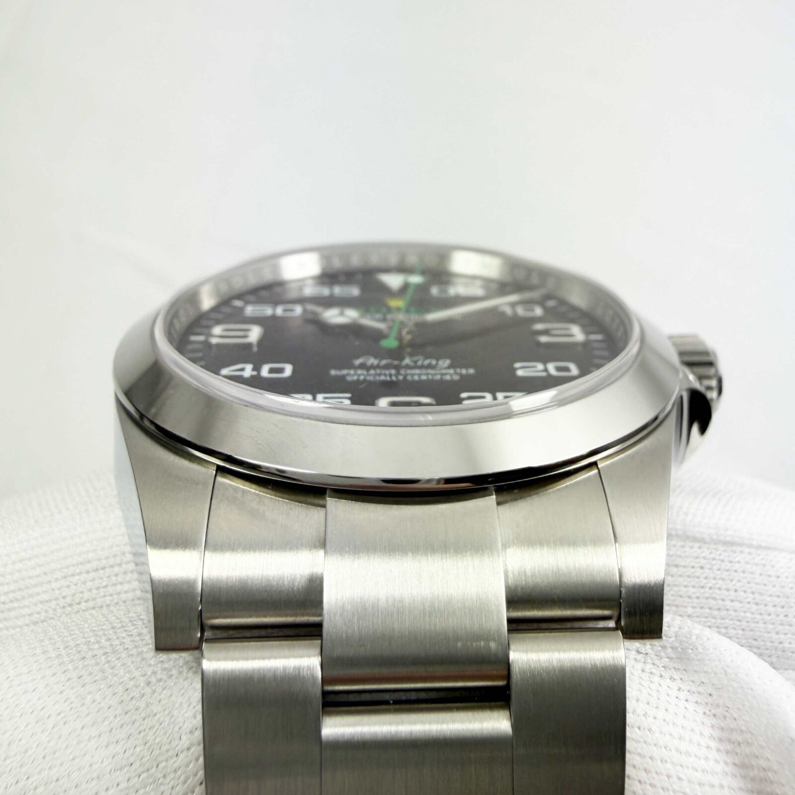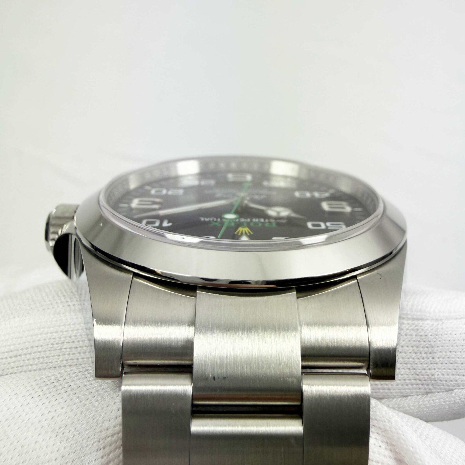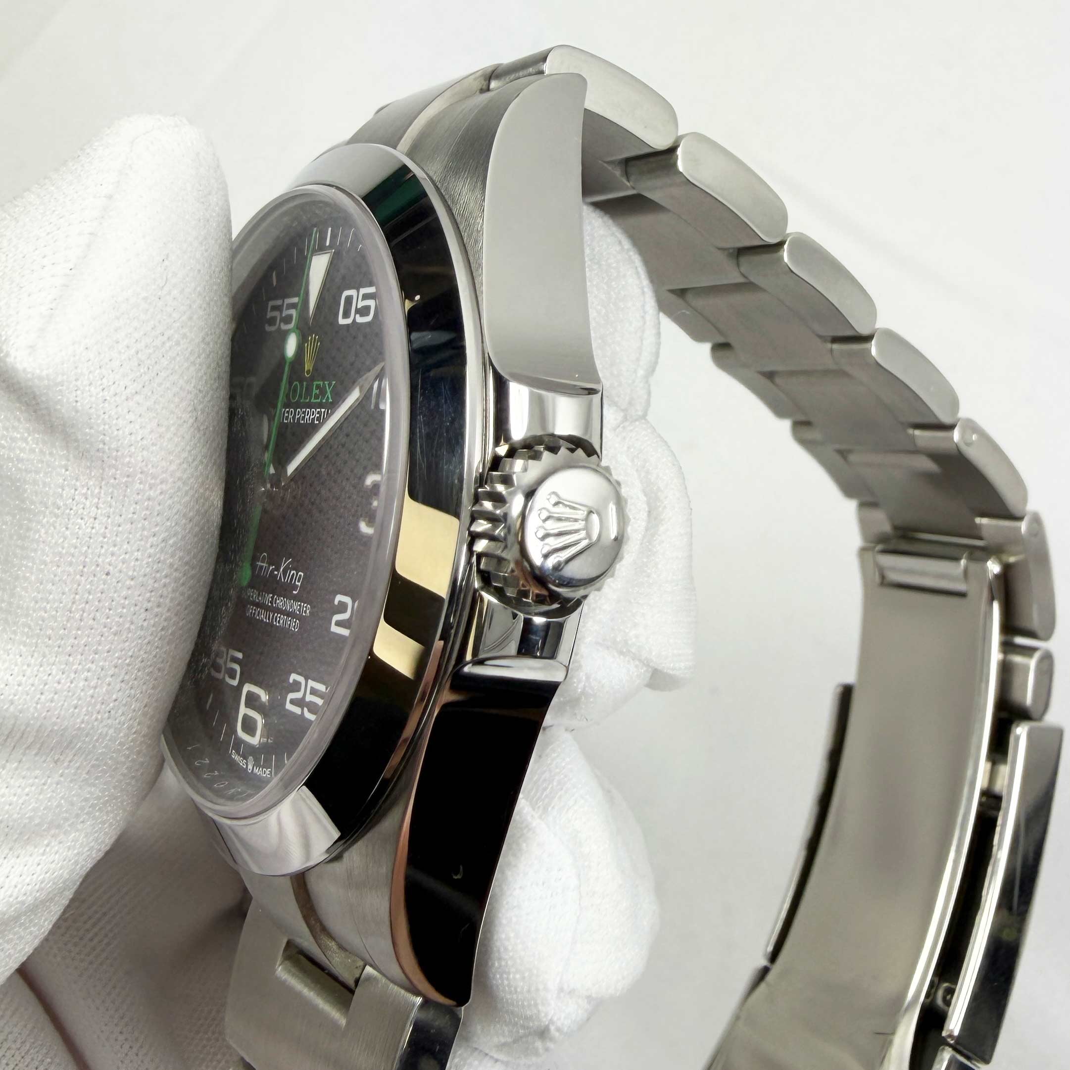 this rolex air king watch is in excellent overall condition and it comes with its box, hang tags, booklets, and warranty card dated january 18th, 2025 as shown in the pictures. Please note this bracelet comes short 1 link. This watch is in stock and ready to ship immediately!