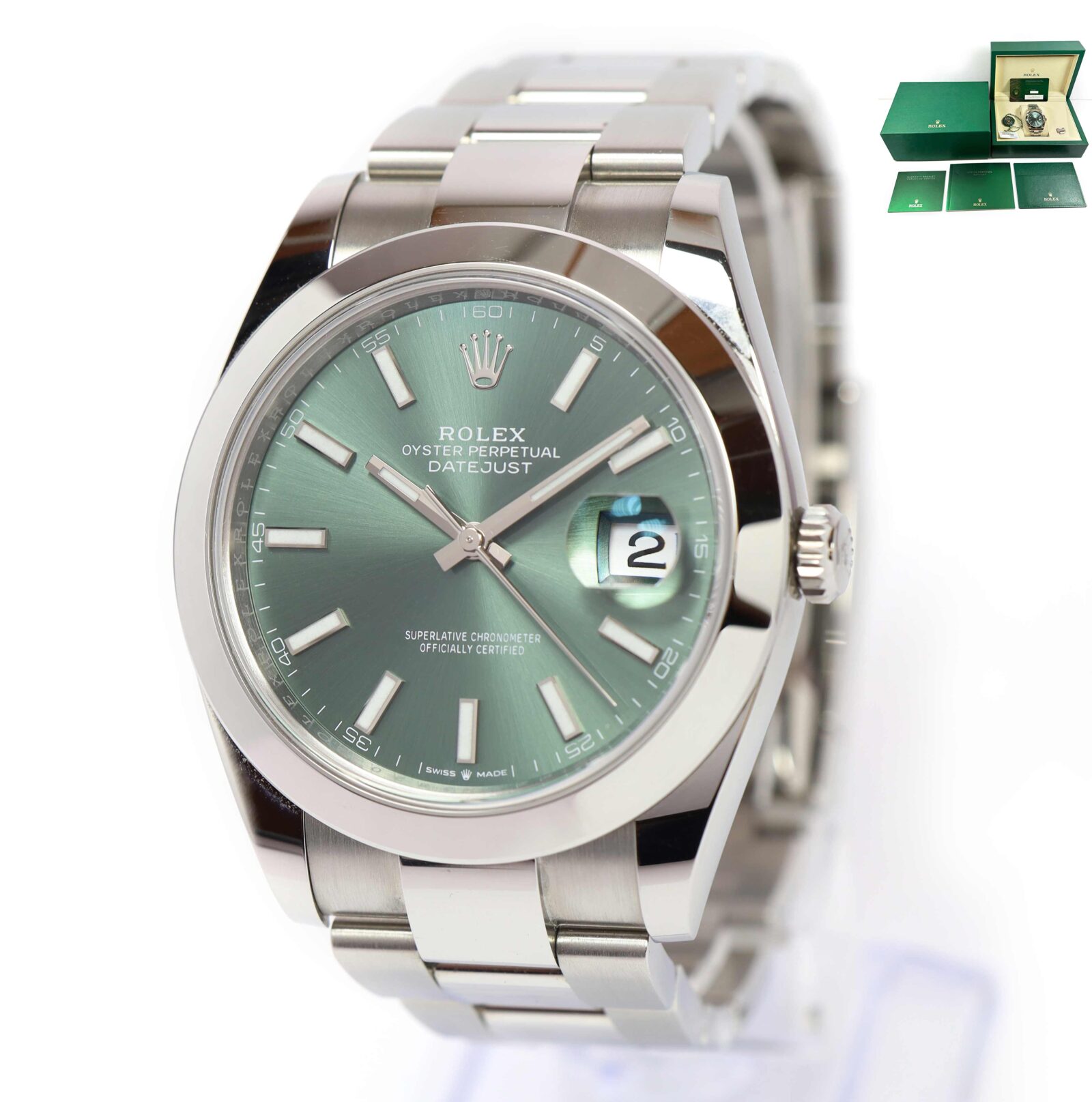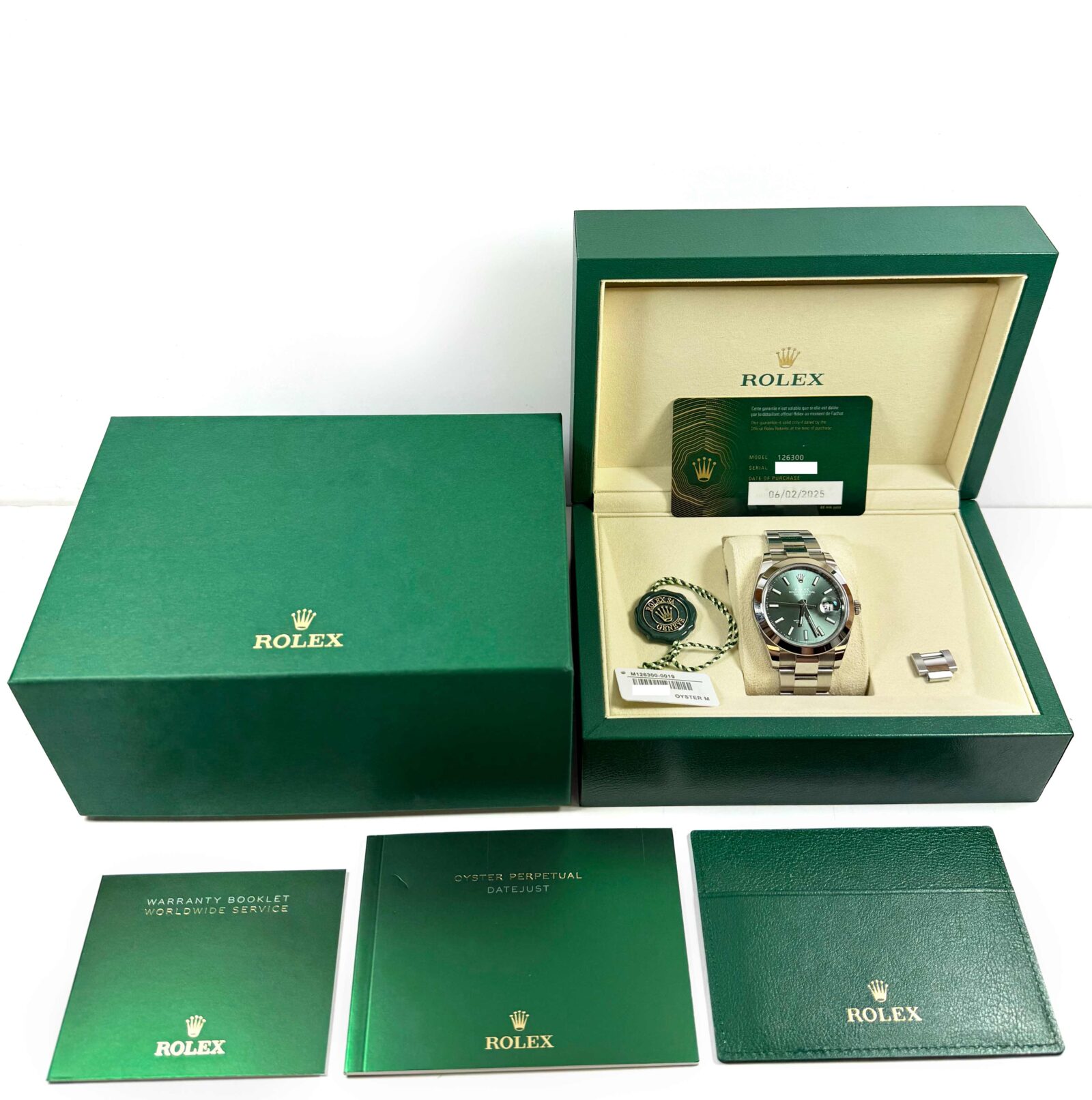 this rolex is in excellent condition and comes with its box, booklets, both hang tags, spare link, and warranty card dated february 6th, 2025 as shown in the pictures attached. This watch is in stock and available to ship immediately!