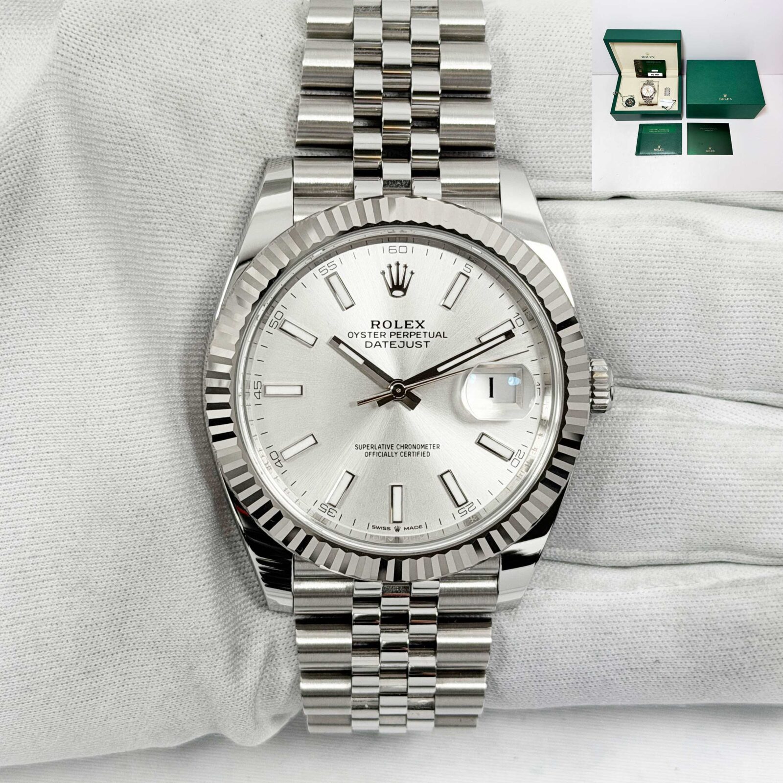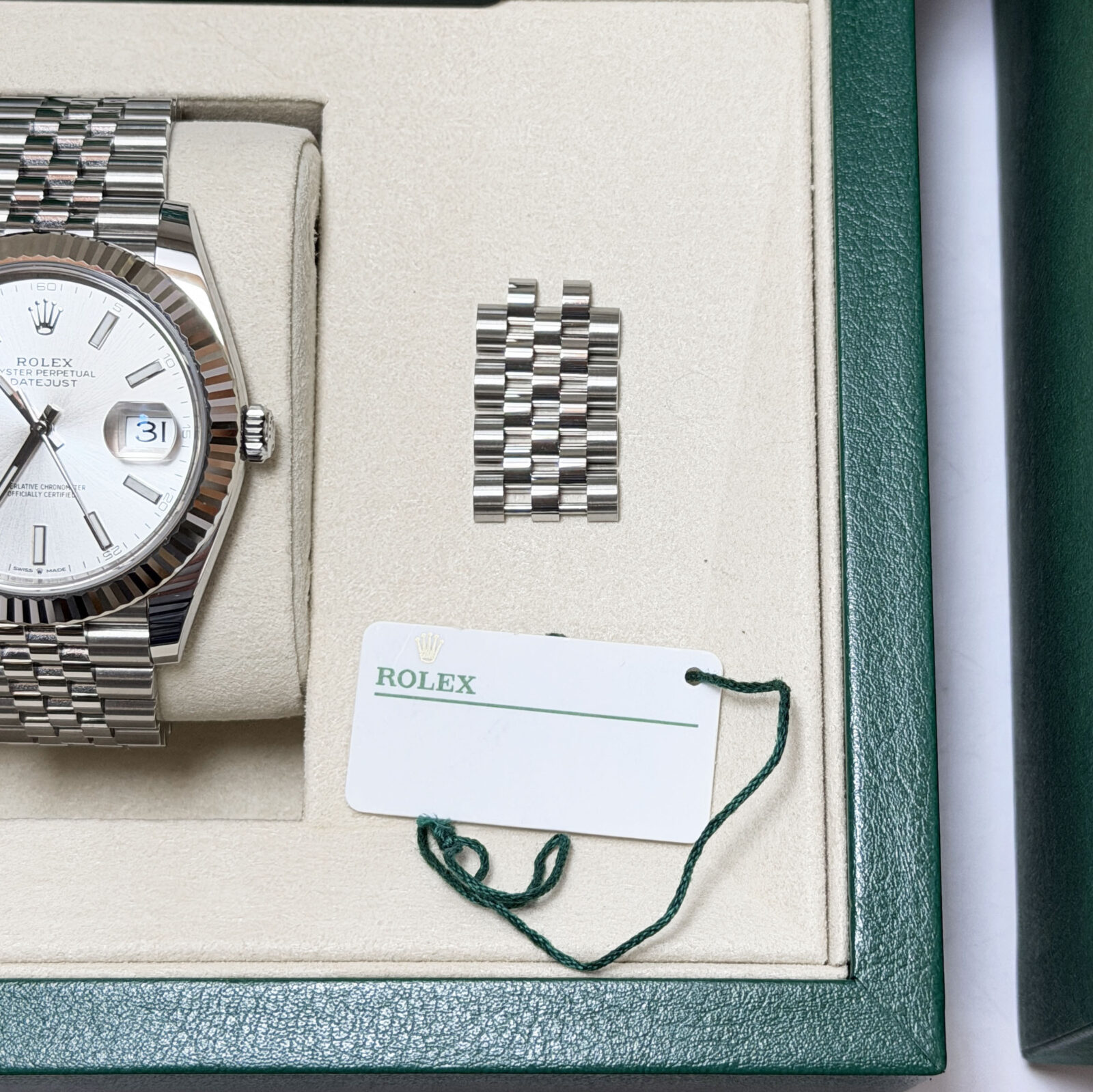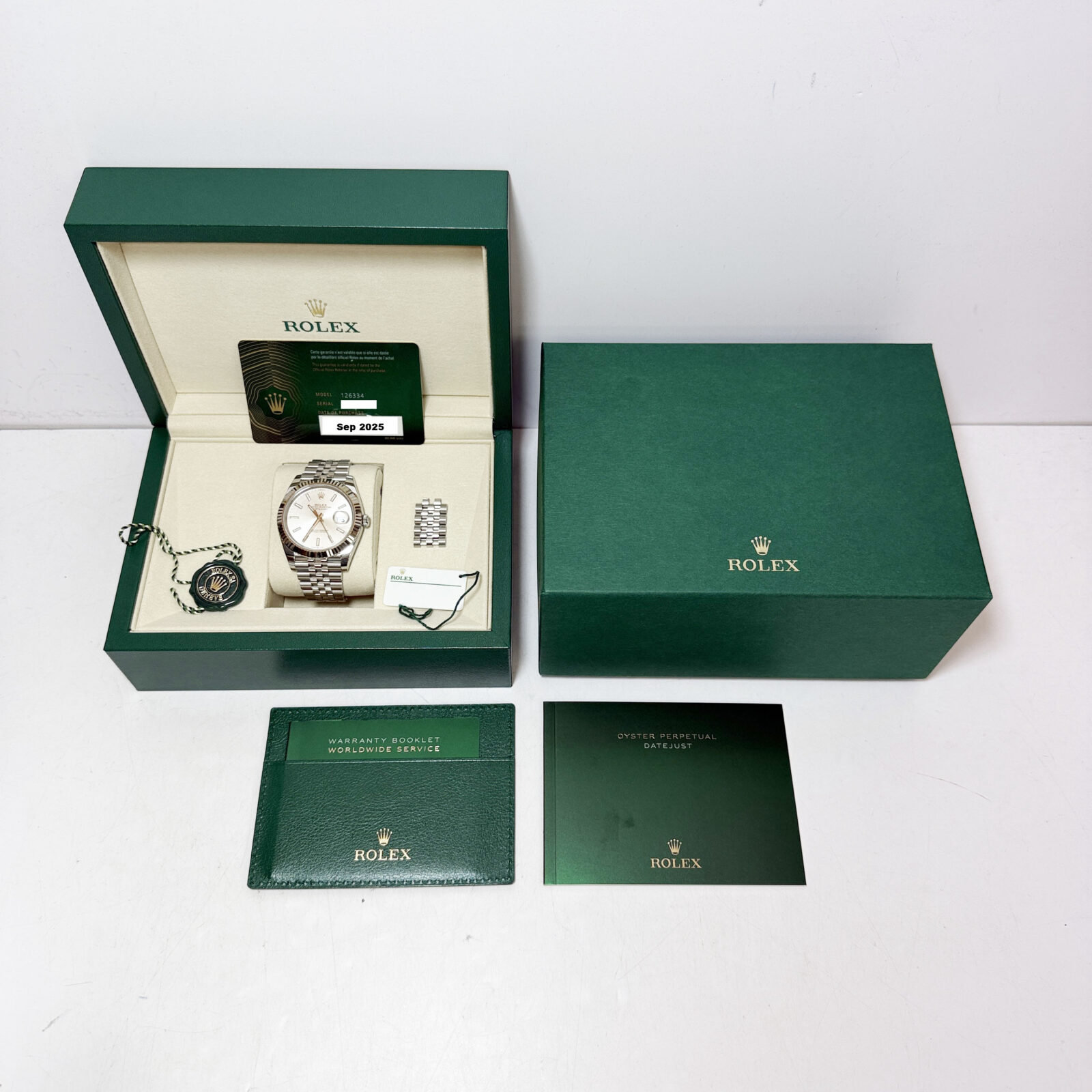 this rolex datejust watch comes with its box, hangtags, booklets, extra links, and warranty card dated september, 2025. The photos shown are of the exact watch being sold and accurately represent its condition. This watch is in stock and ready to ship immediately!