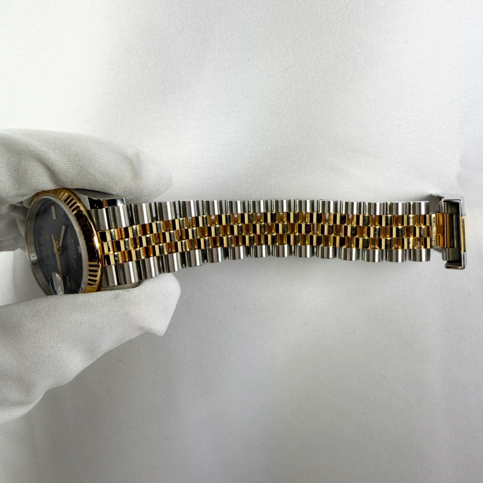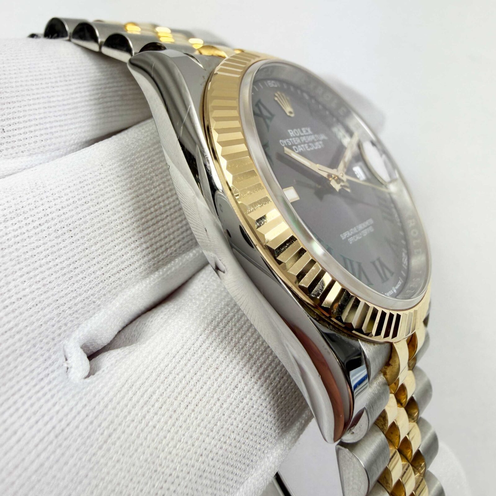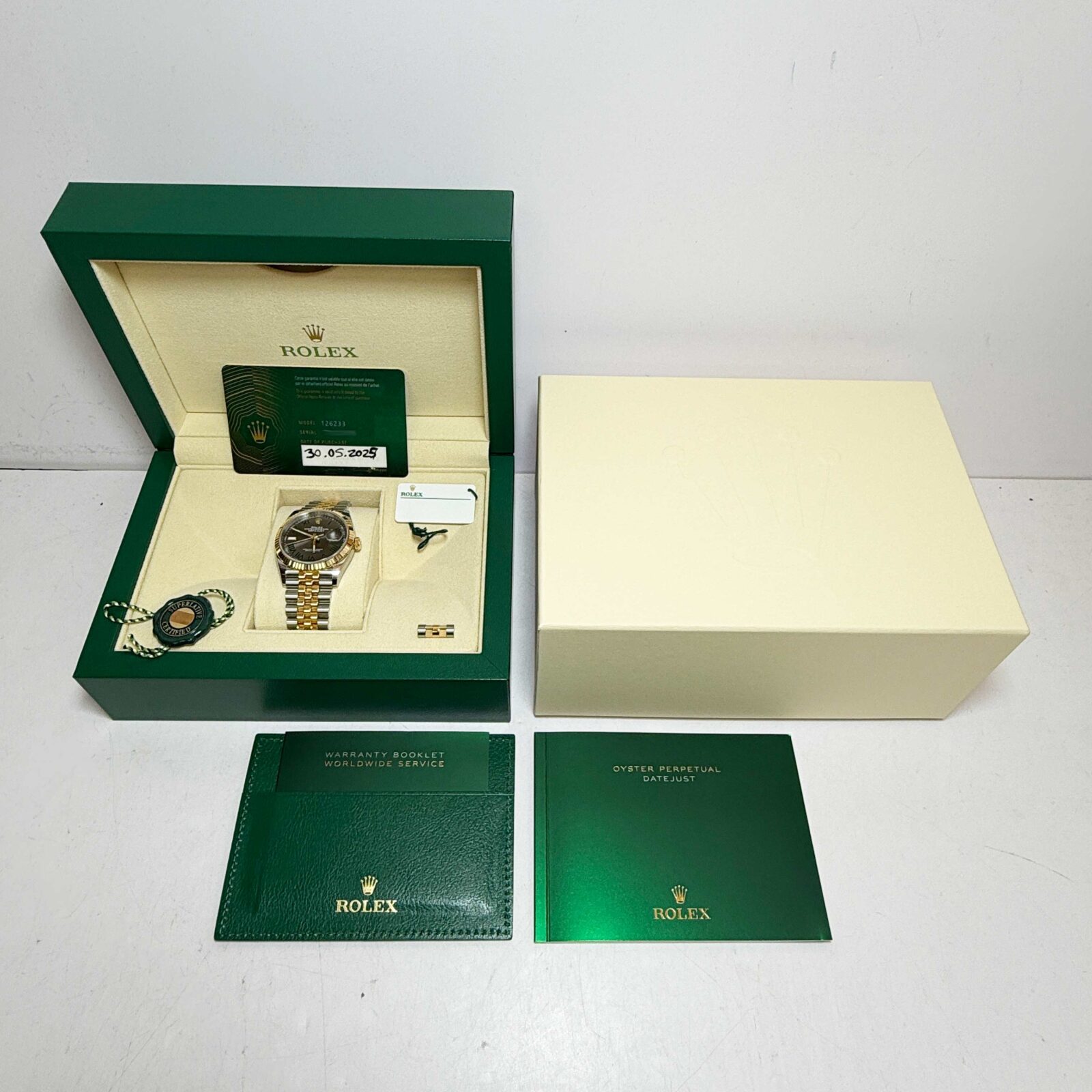this rolex datejust watch comes with its box, booklets, hangtags, extra link, and warranty card dated may 30th, 2025. The photos shown are of the exact watch being sold and accurately represent its condition. This watch is in stock and ready to ship immediately!
