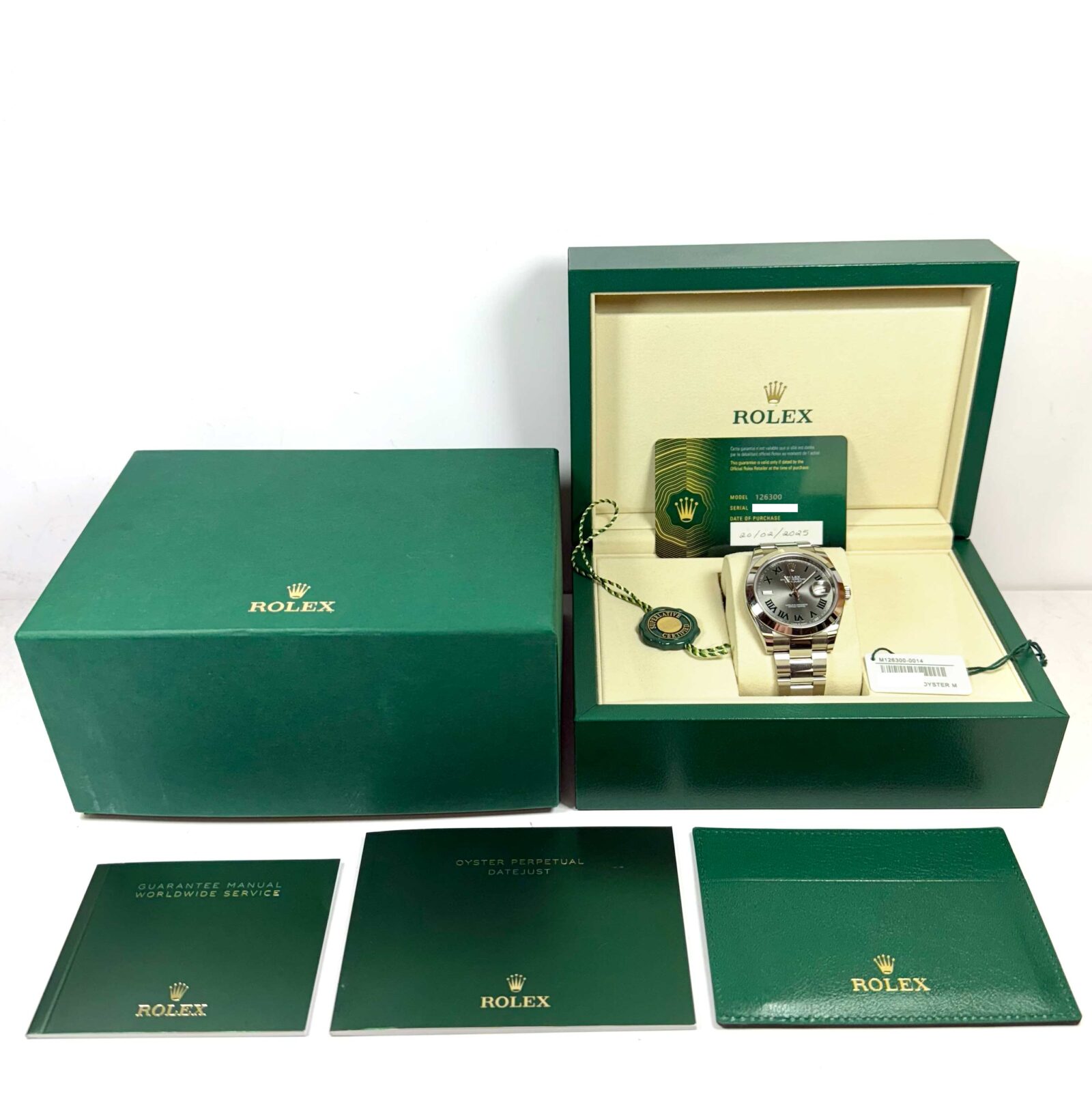 this rolex watch is in amazing overall condition showing some light signs of surface wear consistent with preowned watches. This comes with its box, booklets, hang tags, and warranty card dated february 20th, 2025 as shown in the pictures attached. This watch is in stock and available to ship immediately!