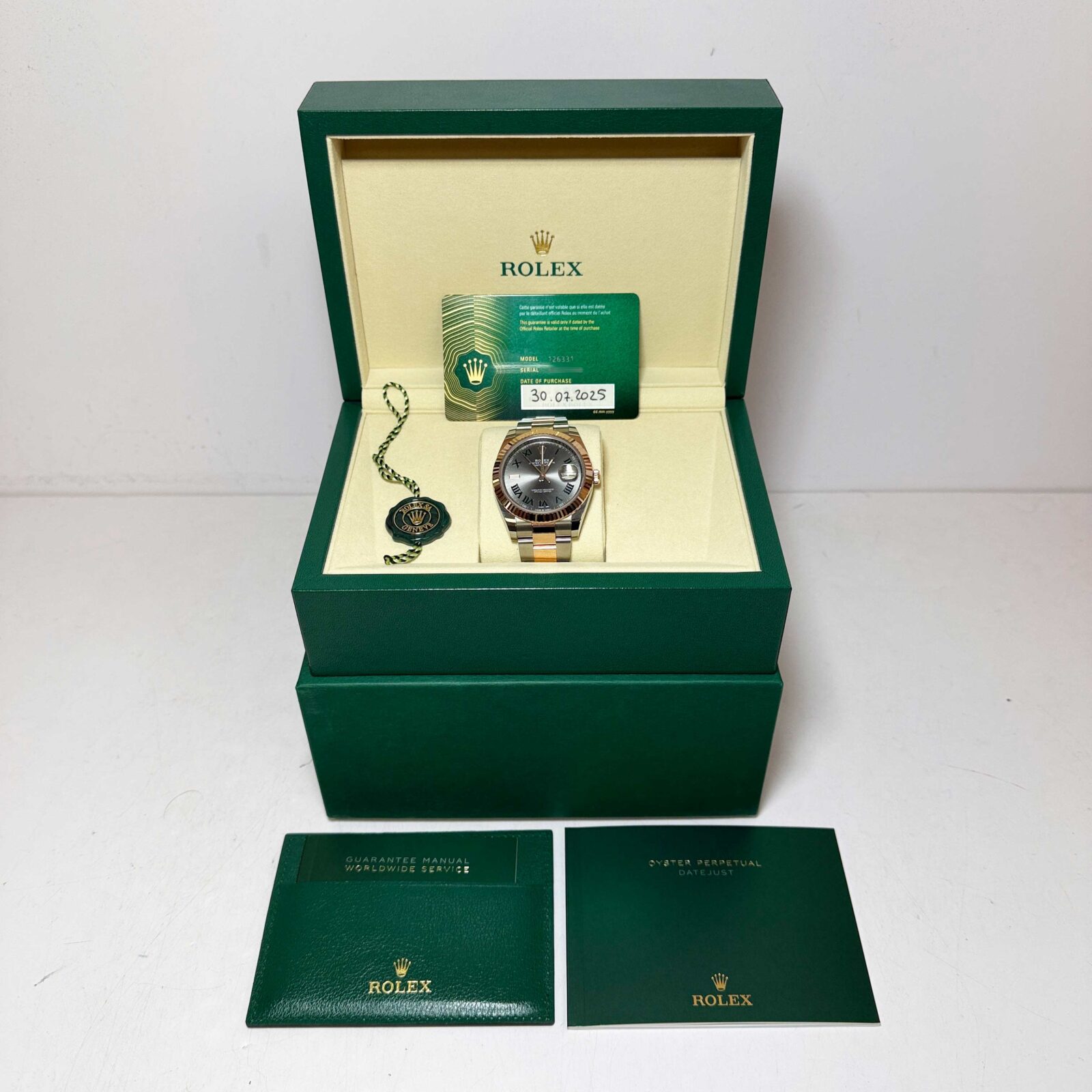 this rolex datejust is in like new unpolished condition and it comes with its box, booklets, hang tag, and warranty card dated march 3rd, 2025 as shown in the pictures. This watch is in stock and ready to ship immediately!