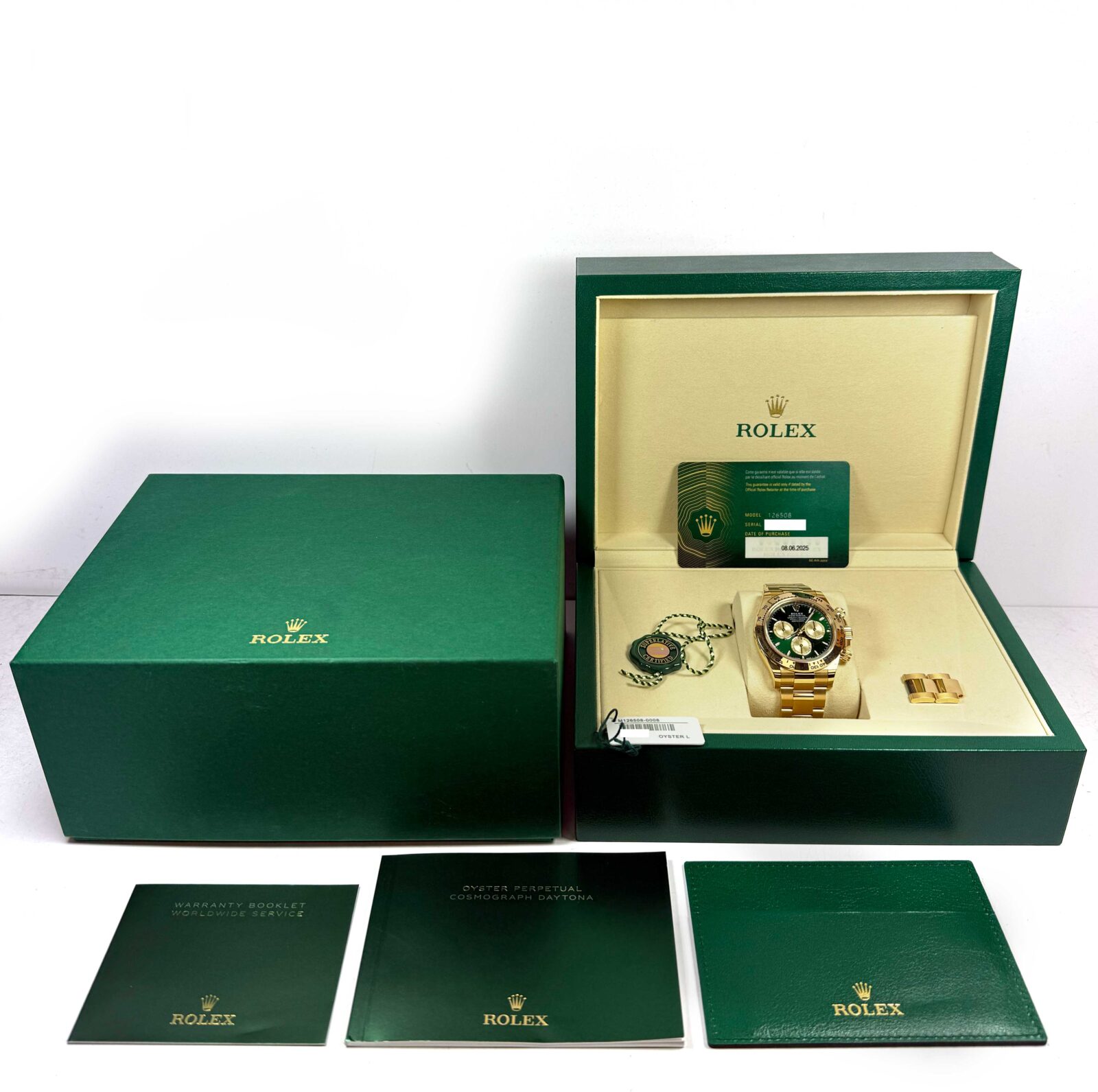 this rolex is in amazing condition and comes with its box, booklets, hang tags, spare links, and warranty card dated june 8th, 2025 as shown in the pictures attached. This watch is in stock and available to ship immediately!
