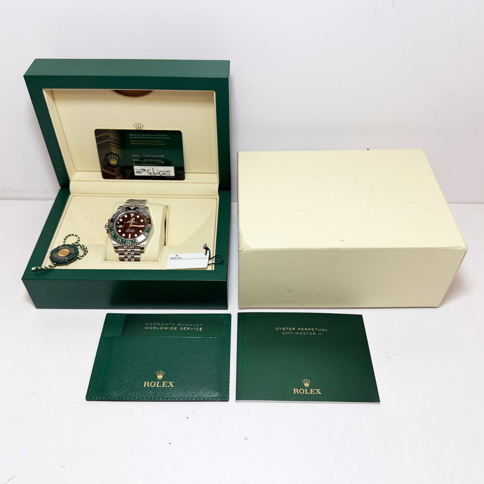 this rolex watch is in excellent condition showing some light signs of surface wear consistent with preowned watches. This comes with its box, hang tags, booklets, and warranty card dated february 26th, 2025 as shown in the pictures. This watch is in stock and ready to ship immediately!