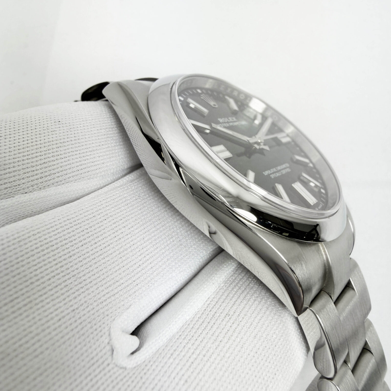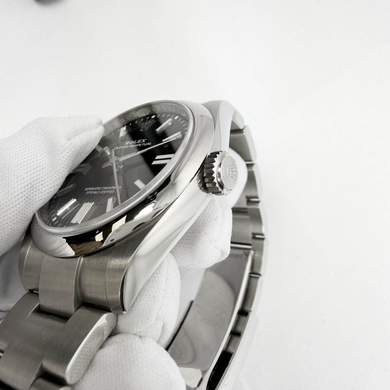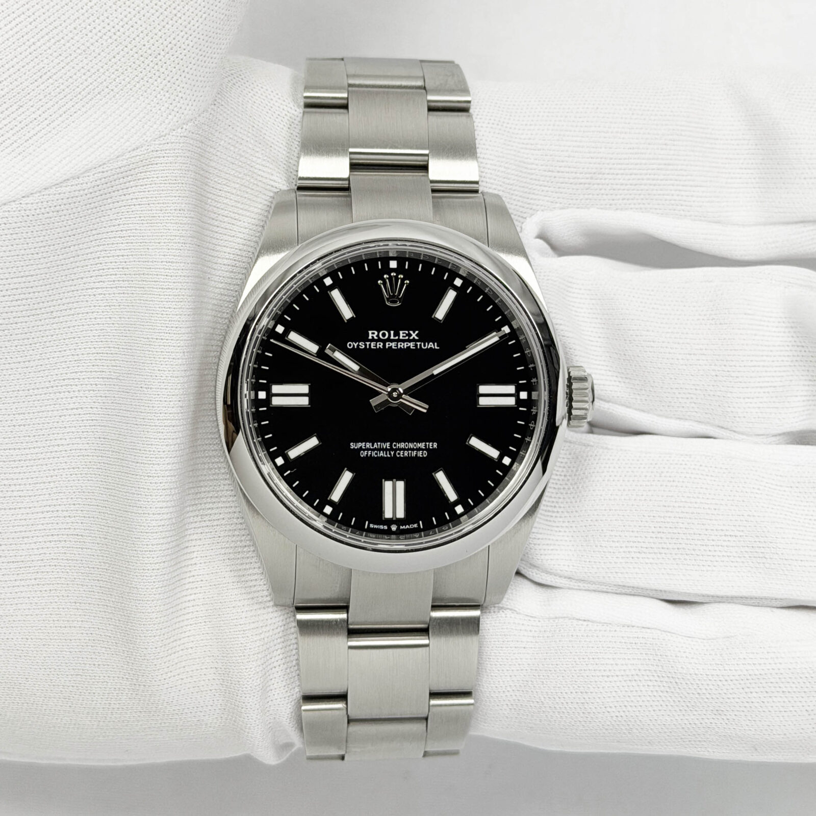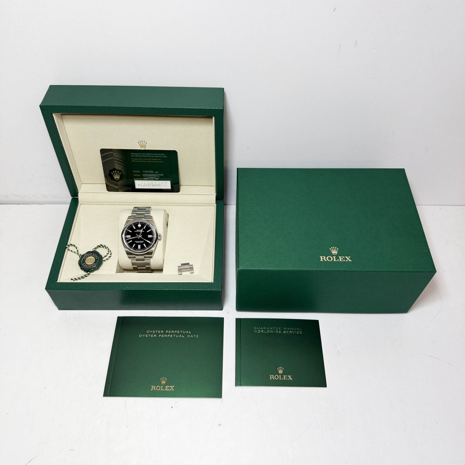 this rolex oyster perpetual watch comes with its box, booklets, hangtag, extra link, and warranty card dated july 1st, 2025. The photos shown are of the exact watch being sold and accurately represent its condition. This watch is in stock and ready to ship immediately!