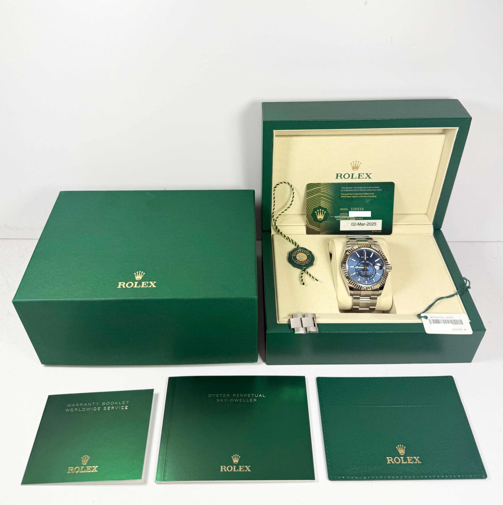 this rolex is in like new condition and comes with its box, booklets, both hang tags, spare links, and warranty card dated march 2nd, 2025 as shown in the pictures attached. This watch is in stock and available to ship immediately!