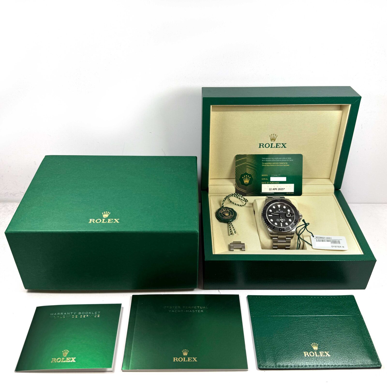 this rolex is in amazing condition and comes with its box, booklets, hang tags, spare link, and warranty card dated april 23rd, 2025 as shown in the pictures attached. This watch is in stock and available to ship immediately!