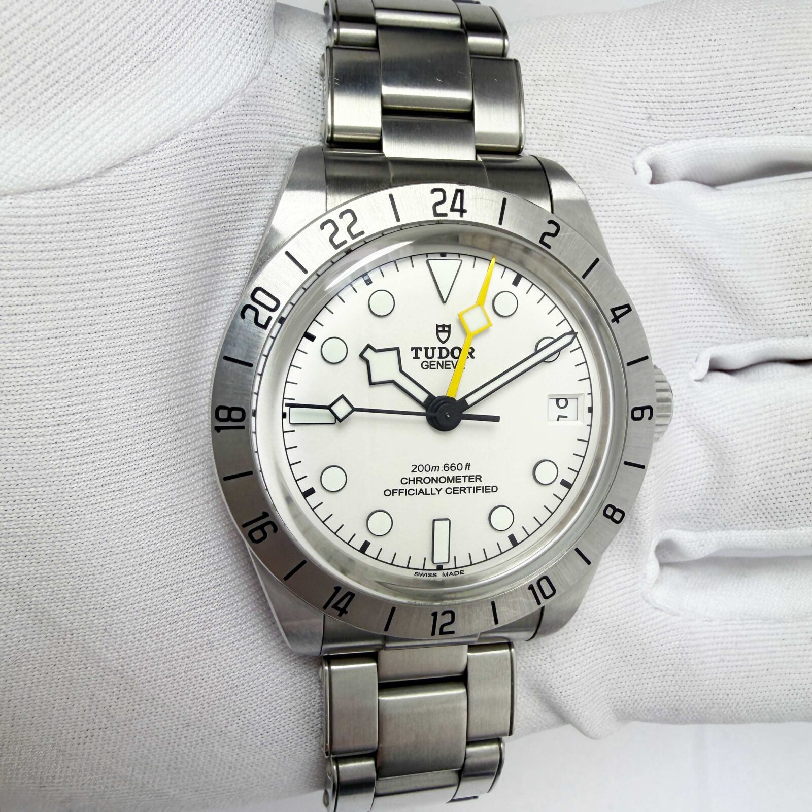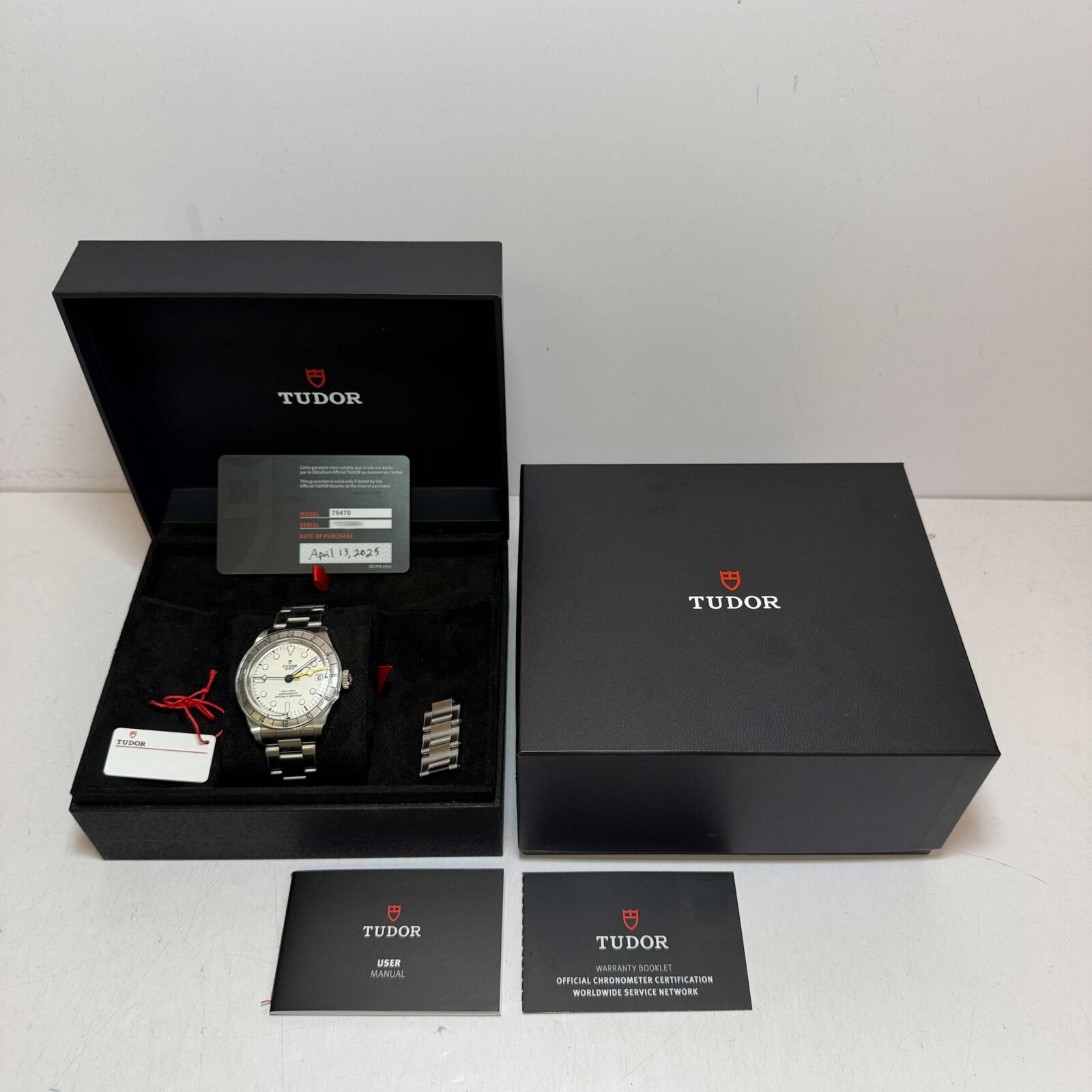 this tudor black bay pro watch comes with its box, booklets, hangtag, extra links, and warranty card dated april 13th, 2025. The photos shown are of the exact watch being sold and accurately represent its condition. This watch is in stock and ready to ship immediately!