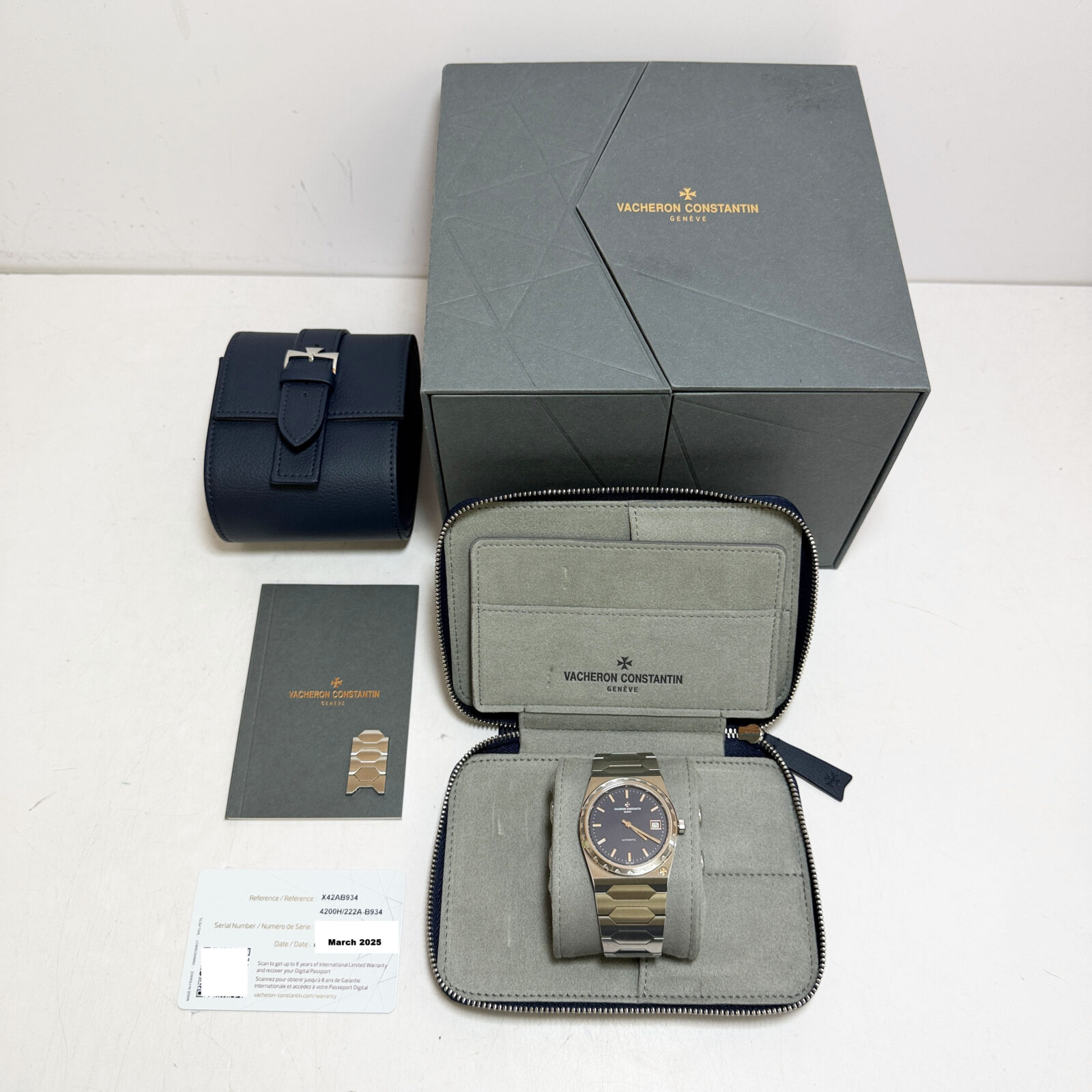 this vacheron constantin watch comes with its box, travel case, booklet, extra links, and warranty card dated march, 2025. The photos shown are of the exact watch being sold and accurately represent its condition. This watch is in stock and ready to ship immediately!