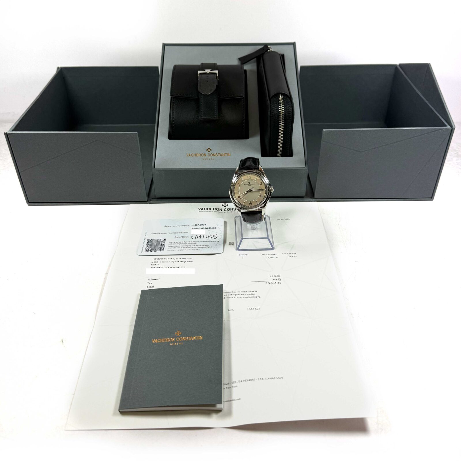 this vacheron watch is in excellent overall condition showing some light signs of surface wear consistent with preowned watches. This comes with its box, booklet, original purchase receipt, and warranty card dated june 14th, 2025 as shown in the pictures attached. This watch is in stock and available to ship immediately!