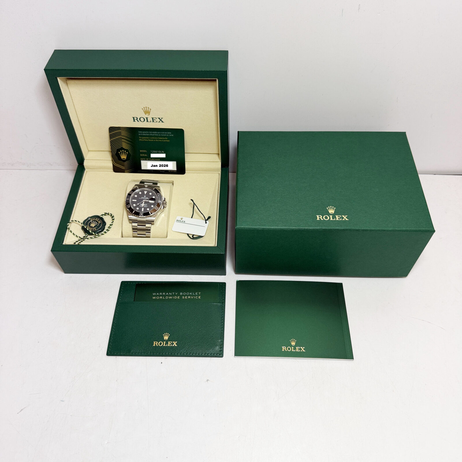 this rolex submariner date watch comes with its box, booklets, hangtags, and warranty card dated january, 2026. The photos shown are of the exact watch being sold and accurately represent its condition. This watch is in stock and ready to ship immediately!