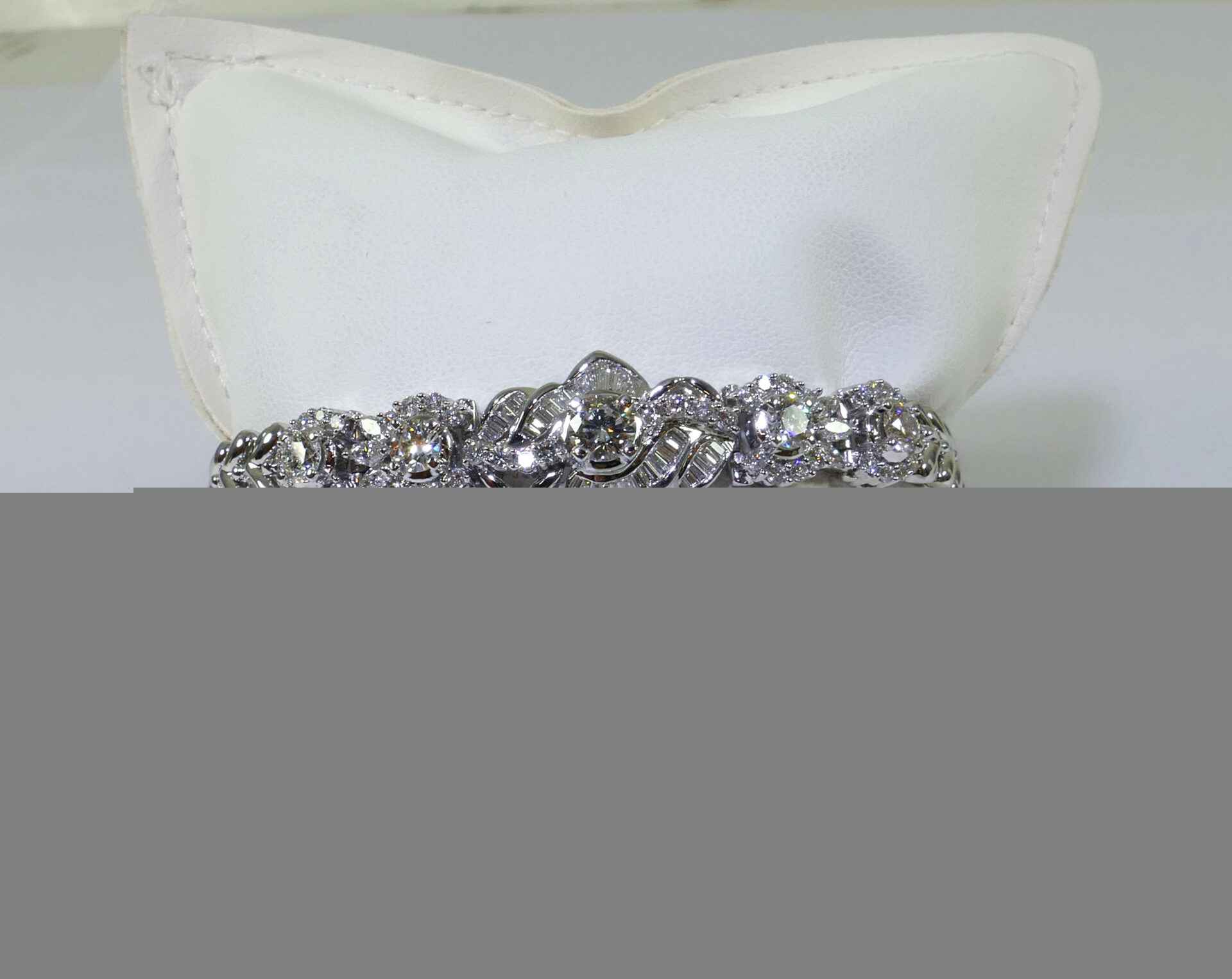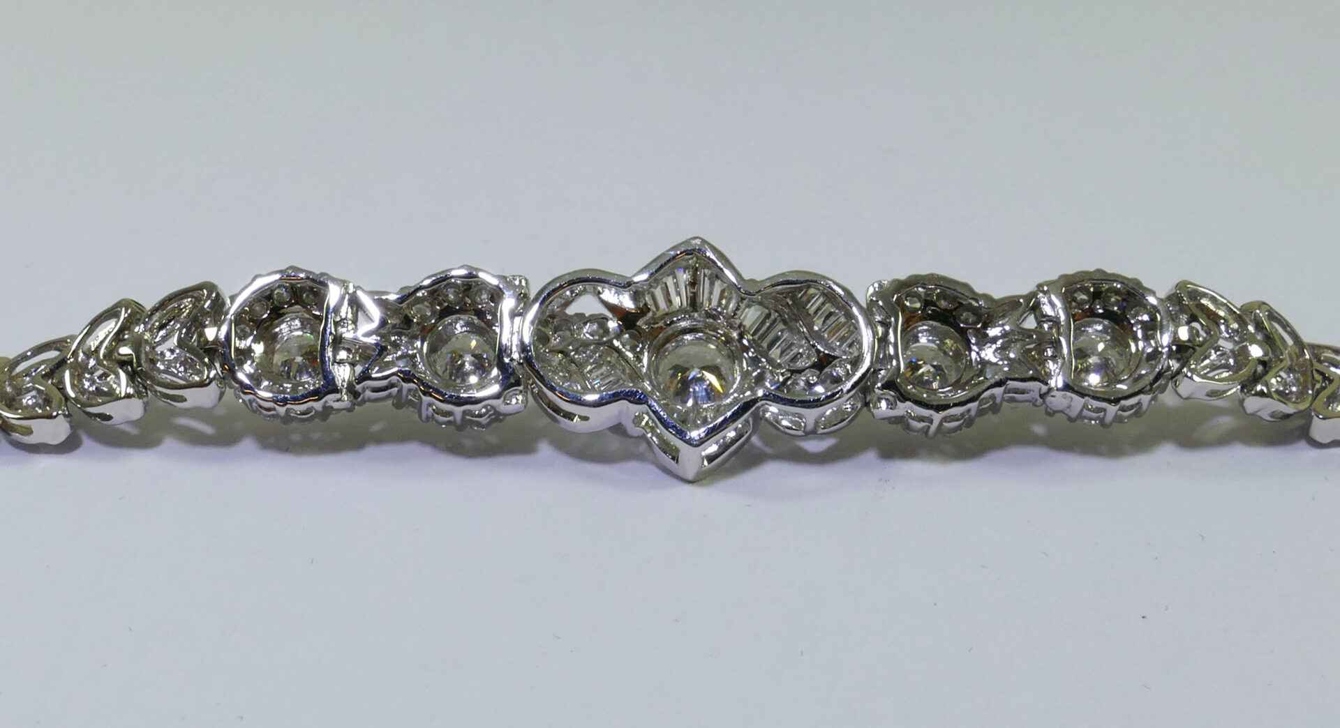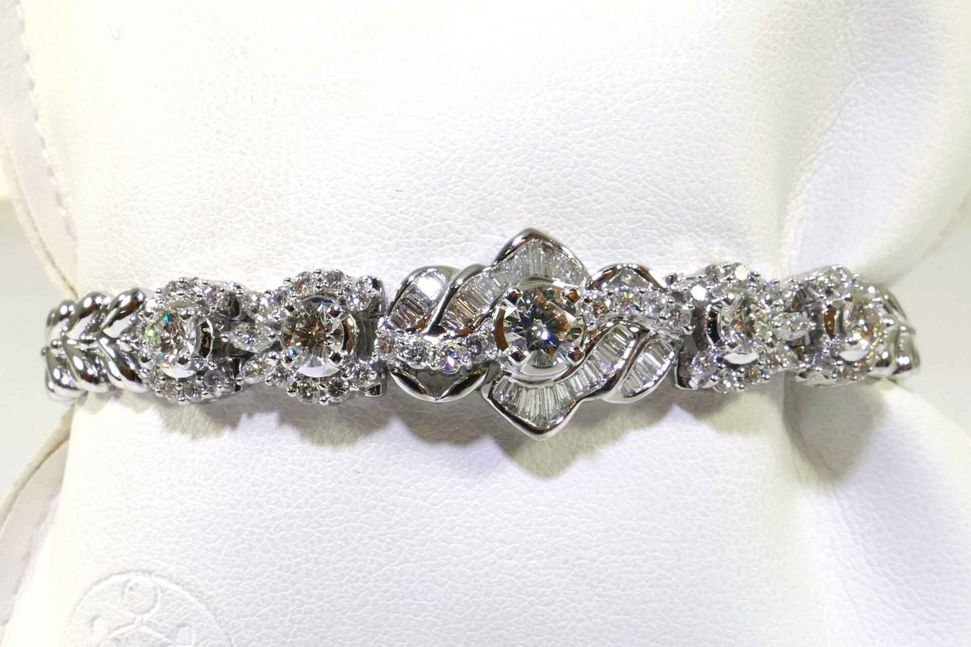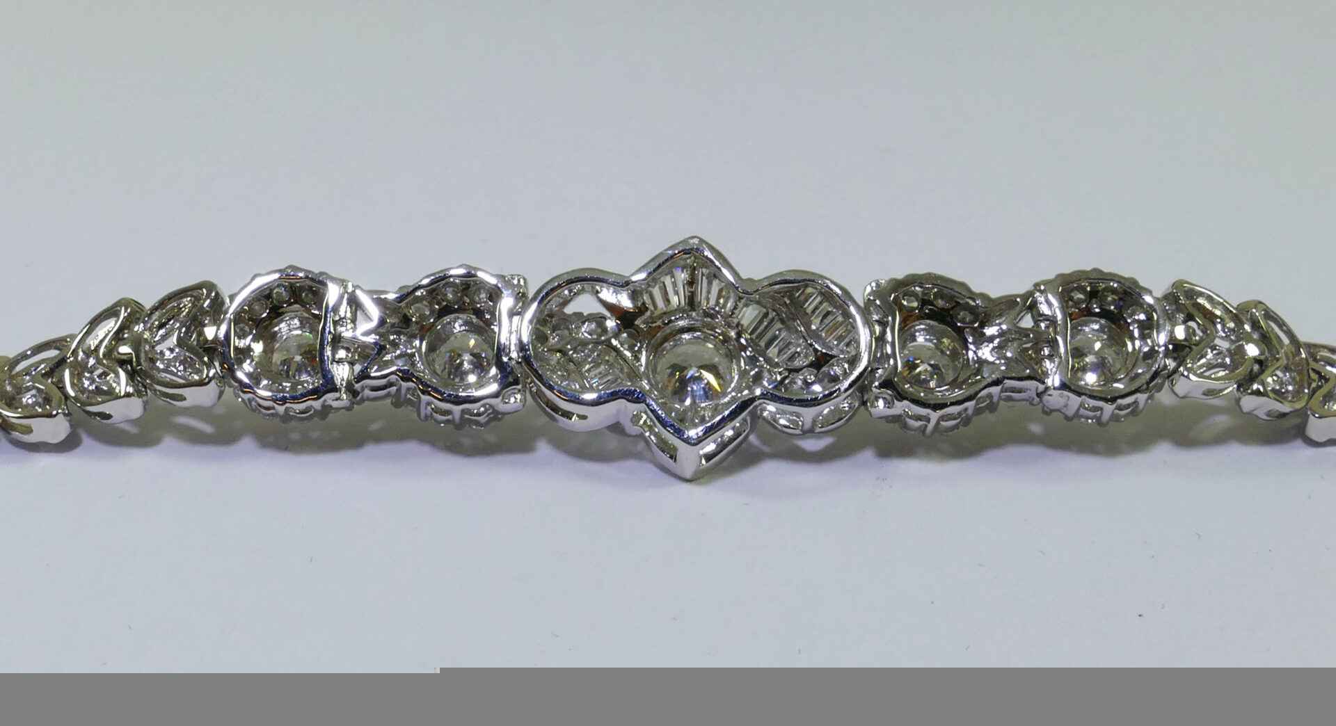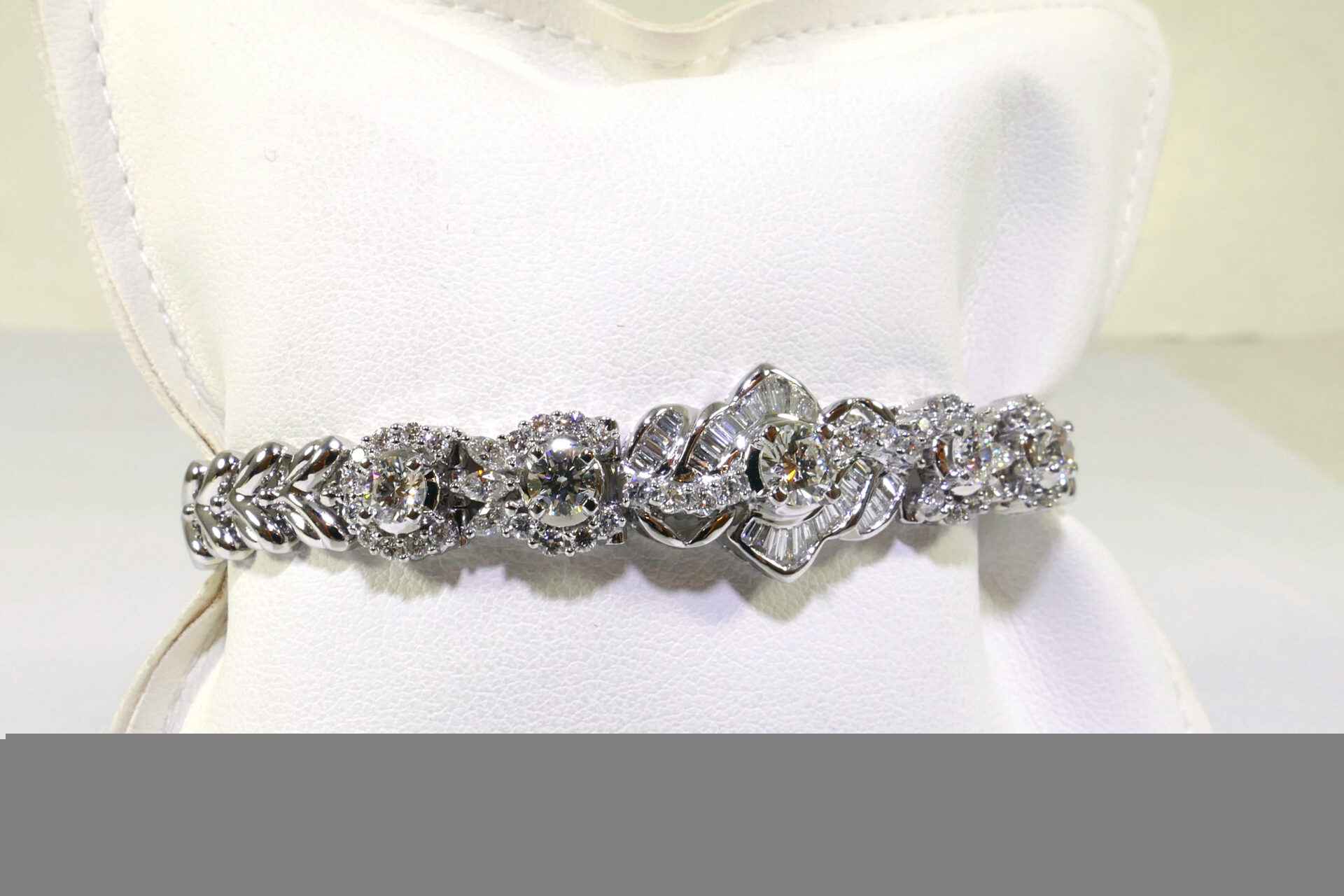 This is a bracelet with a wow-factor. These beautiful blinging diamonds are colorless and bright! This bracelet holds round diamonds surrounded by baguettes to create a flower-like look. The main center stone is .5 carat and the ...