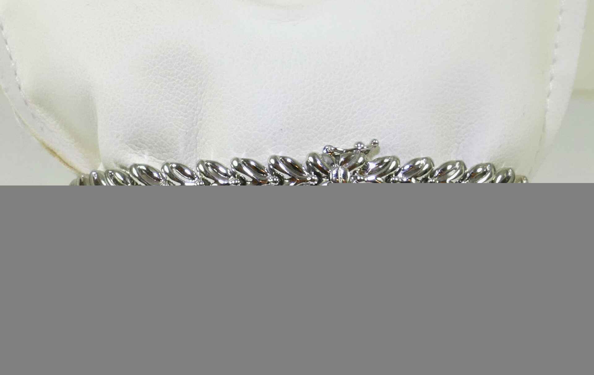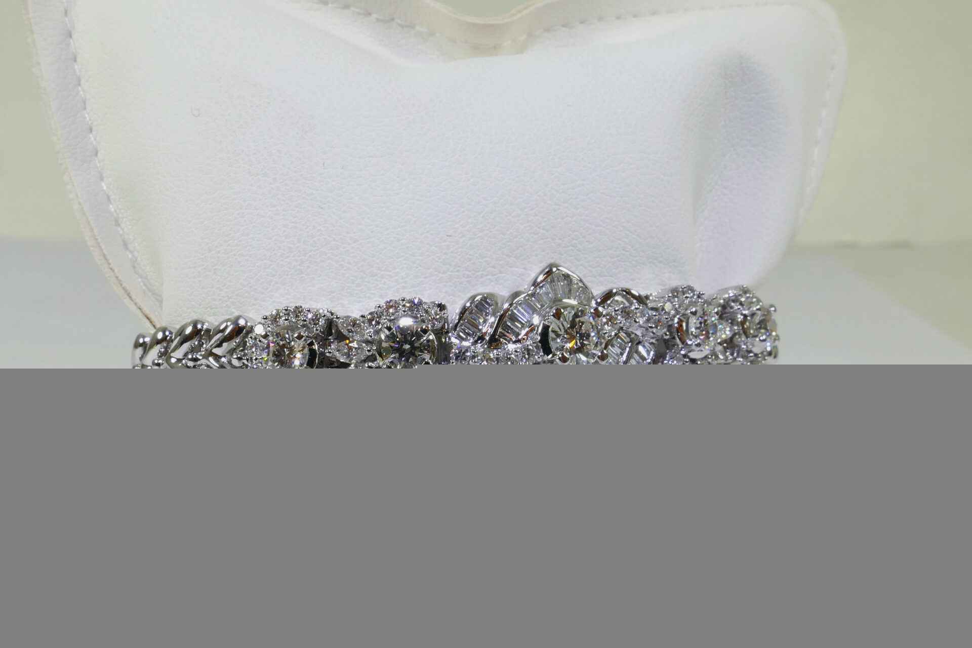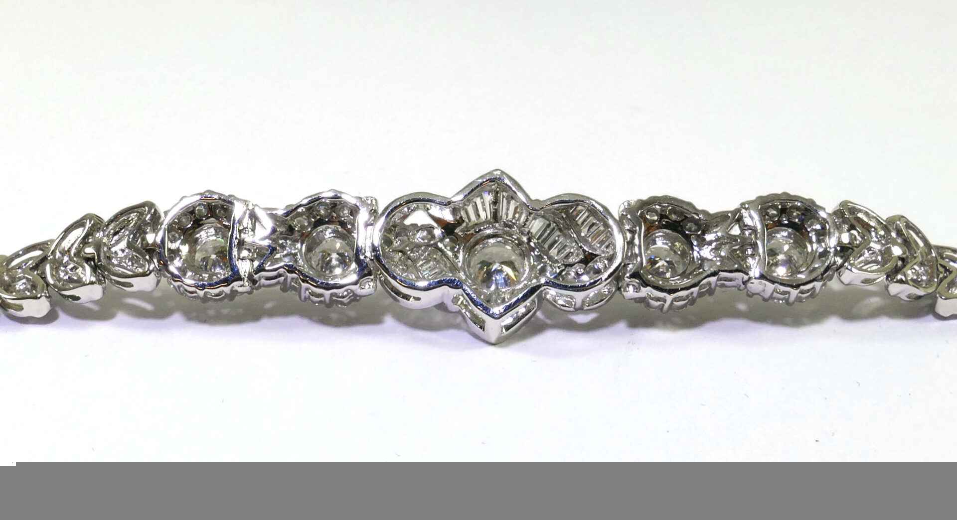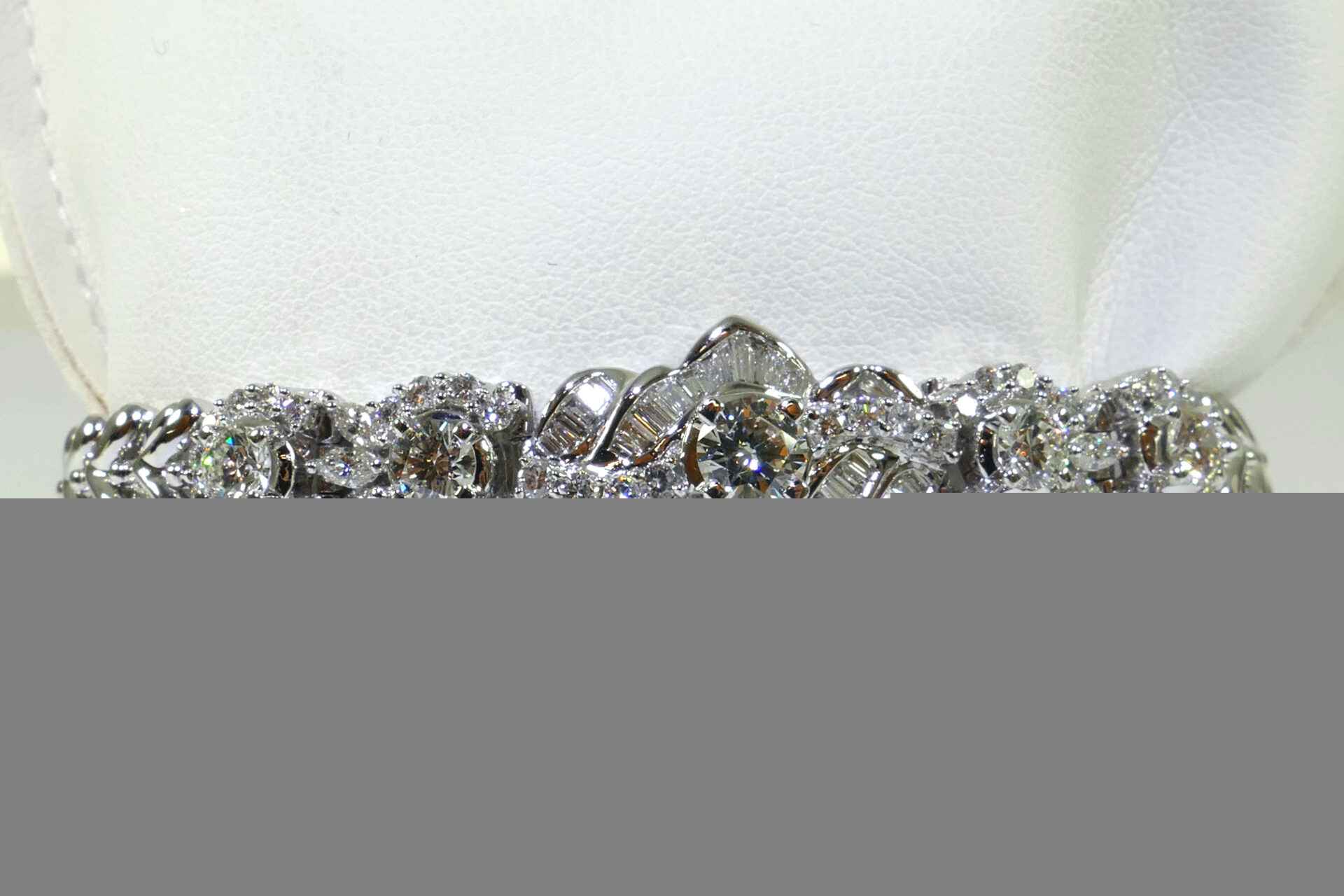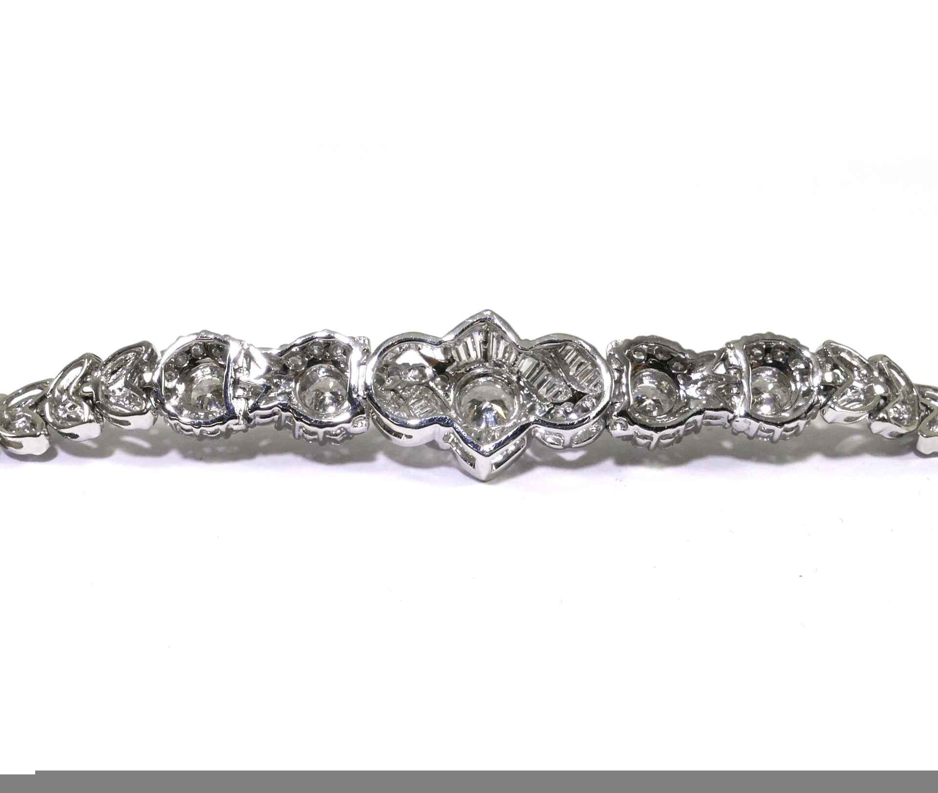 This is a bracelet with a wow-factor. These beautiful blinging diamonds are colorless and bright! This bracelet holds round diamonds surrounded by baguettes to create a flower-like look. The main center stone is .5 carat and the ...