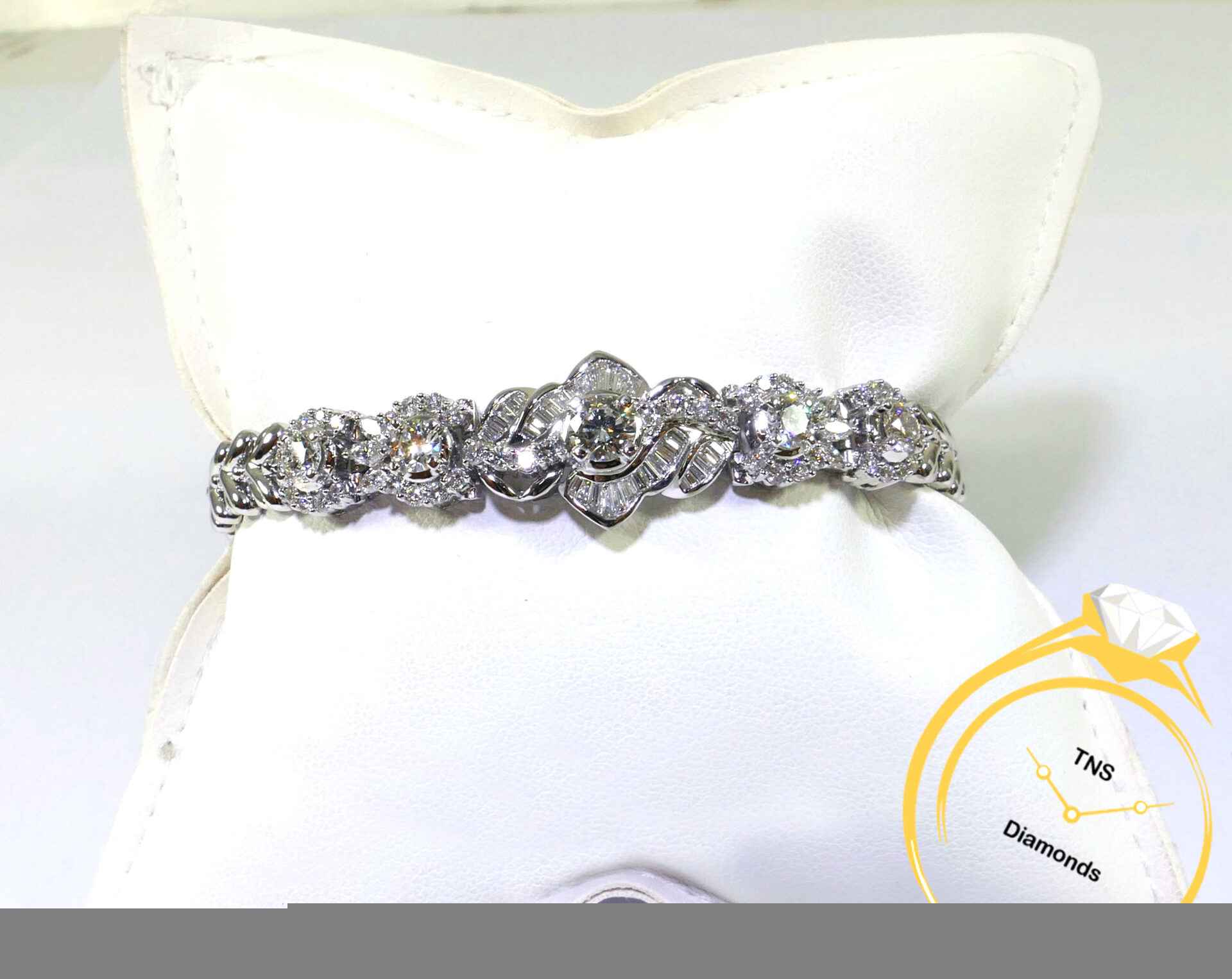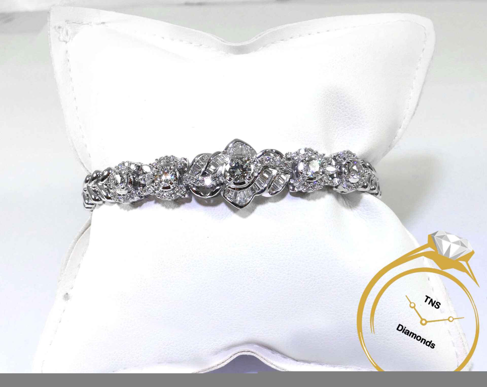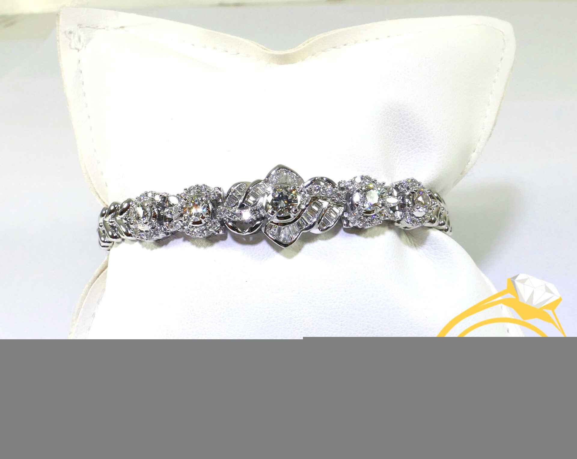 Read Morethis is a bracelet with a wow-factor. These beautiful blinging diamonds are colorless and bright! this bracelet holds round diamonds surrounded by baguettes to create a flower-like look. The main center stone is .5 carat and the 4 other main stones are .25ct each. In rounds, marquise and baguettes there’s 1.25 carats total.