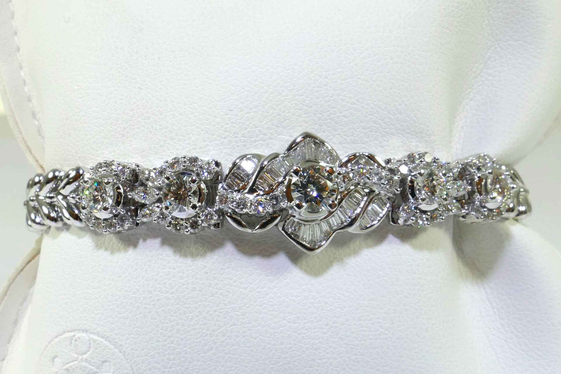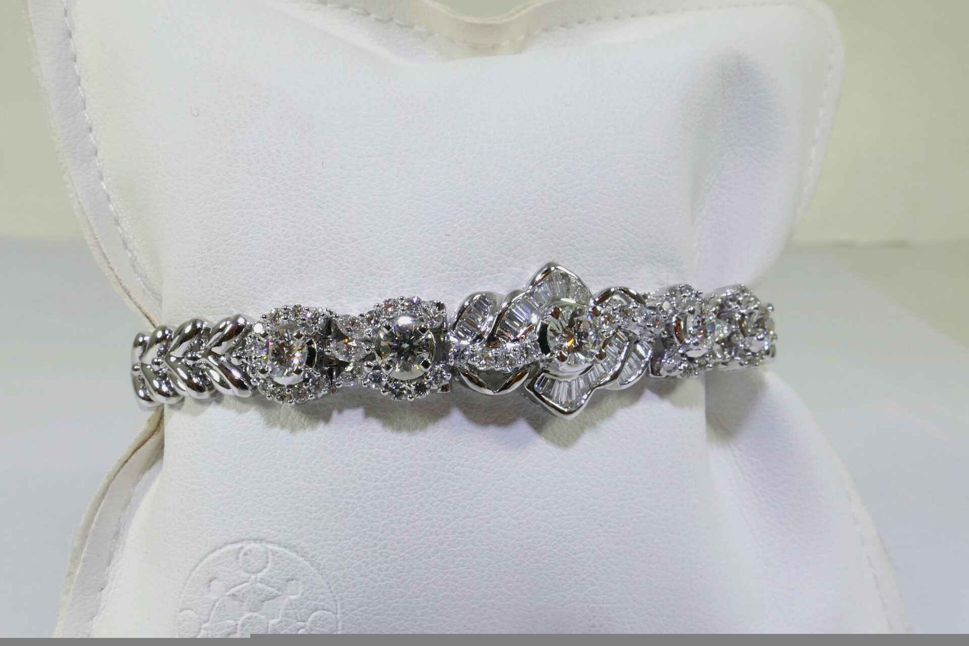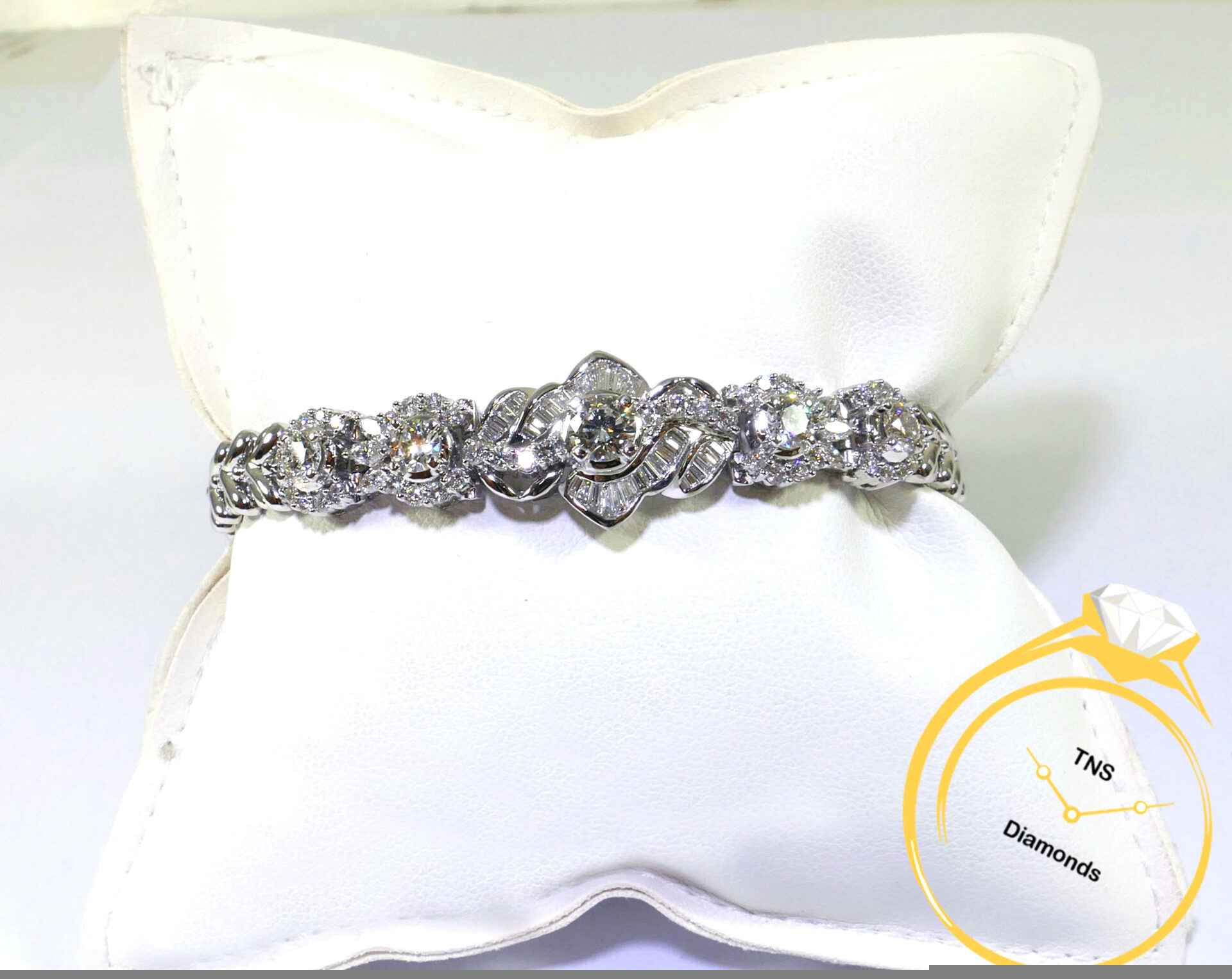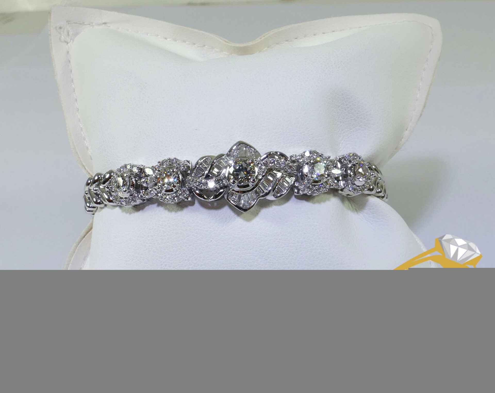 Read Morethis is a bracelet with a wow-factor. These beautiful blinging diamonds are colorless and bright! this bracelet holds round diamonds surrounded by baguettes to create a flower-like look. The main center stone is .5 carat and the 4 other main stones are .25ct each. In rounds, marquise and baguettes there’s 1.25 carats total.