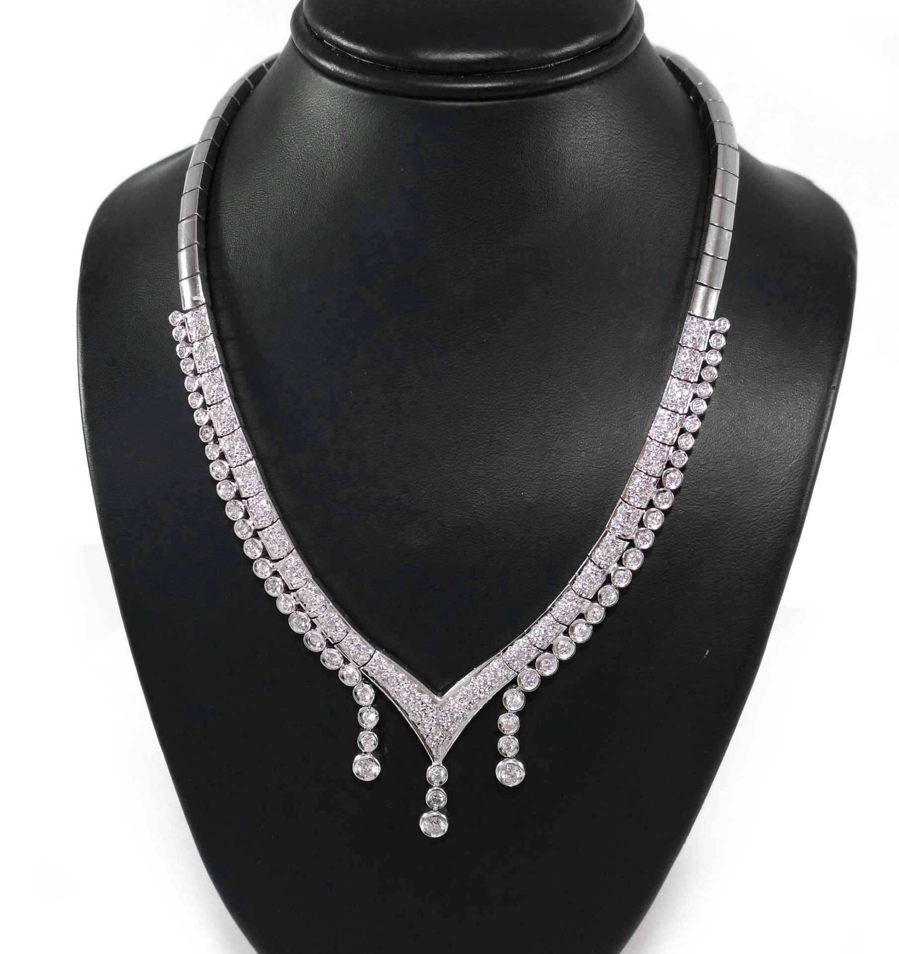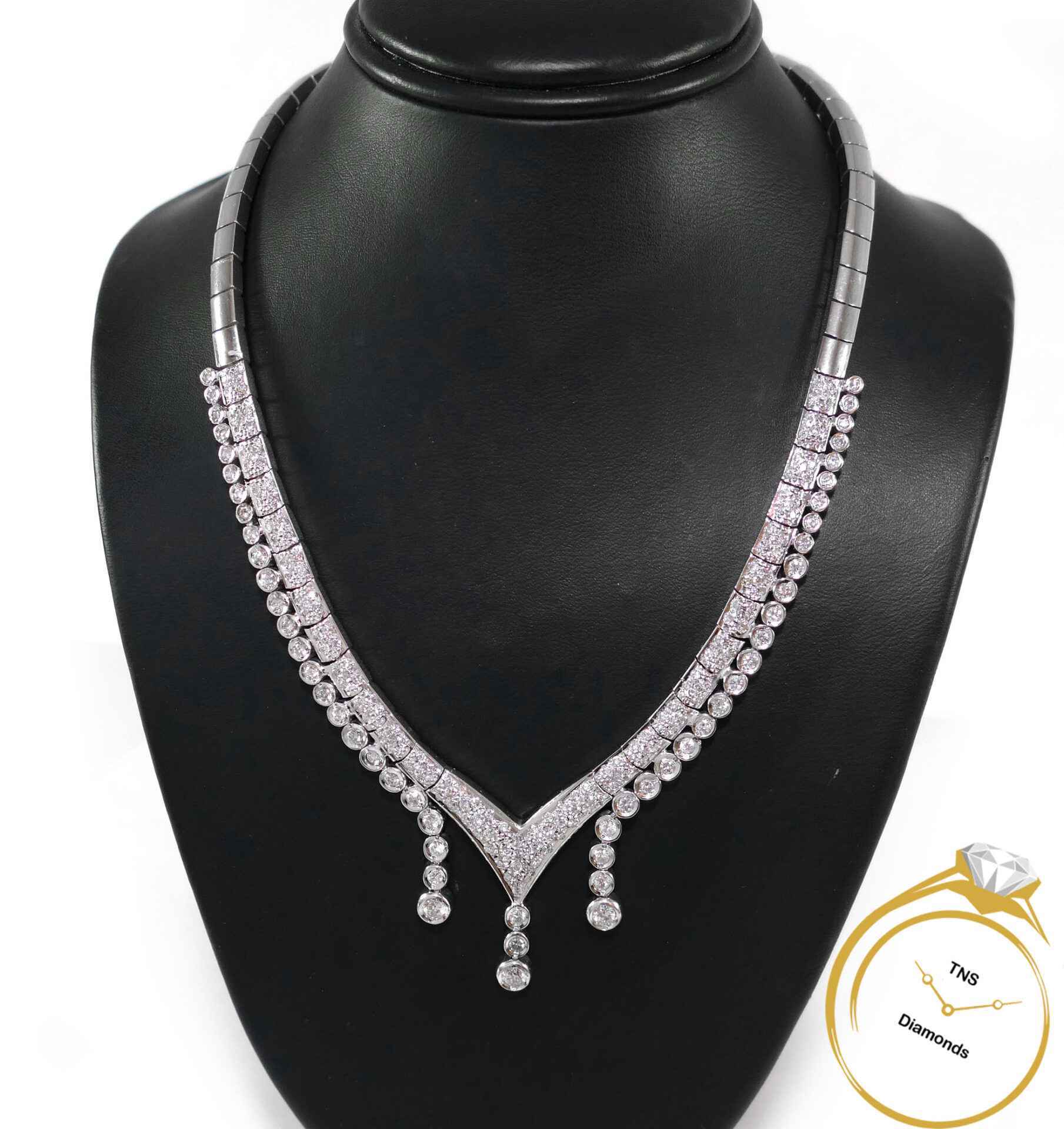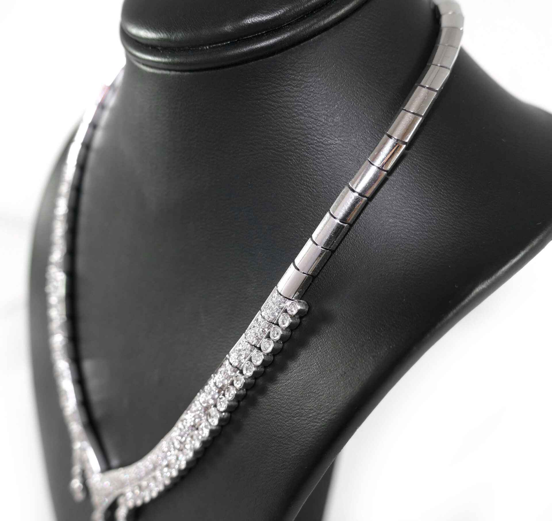 this absolutely stunning diamond necklace holds 3 carats of diamonds, set into solid 18k white gold. This necklace is a beautiful look blinging with diamonds, and the lock holds sturdy and safe with a lock to hold the two ends together. This necklace lays elegantly flat and comfortable on the neck.
