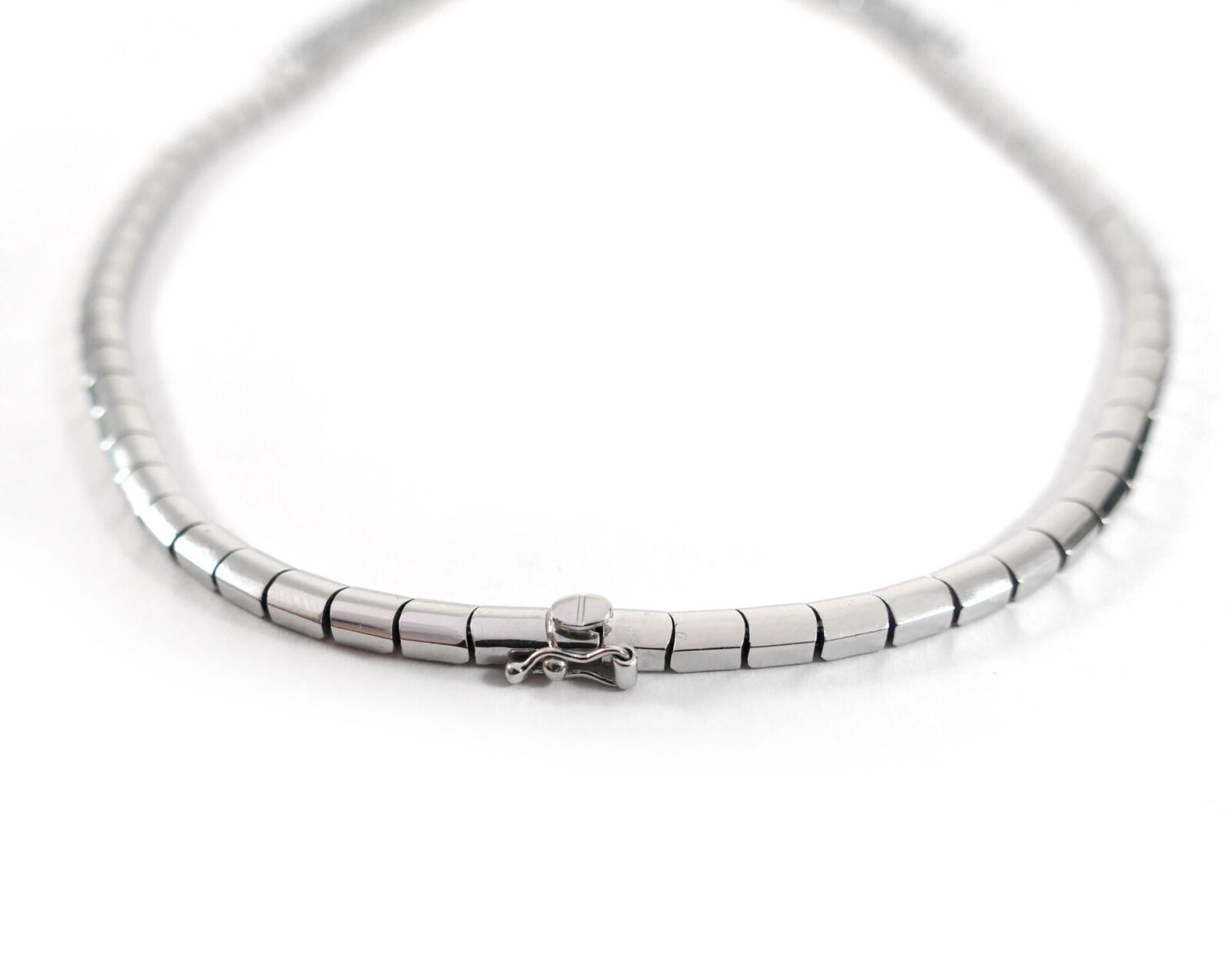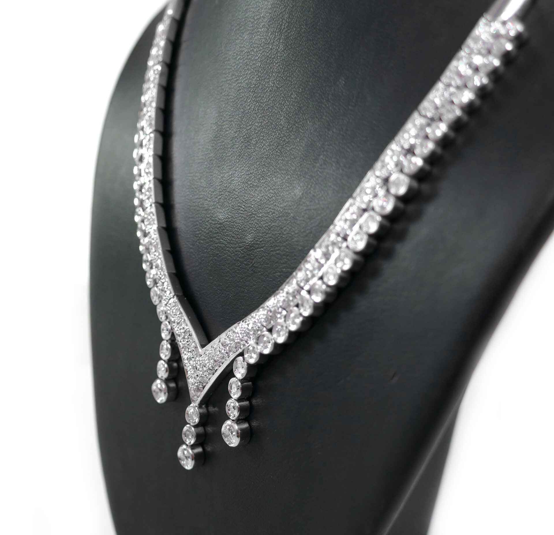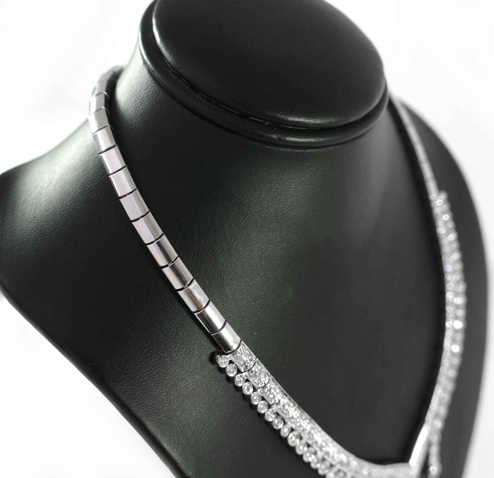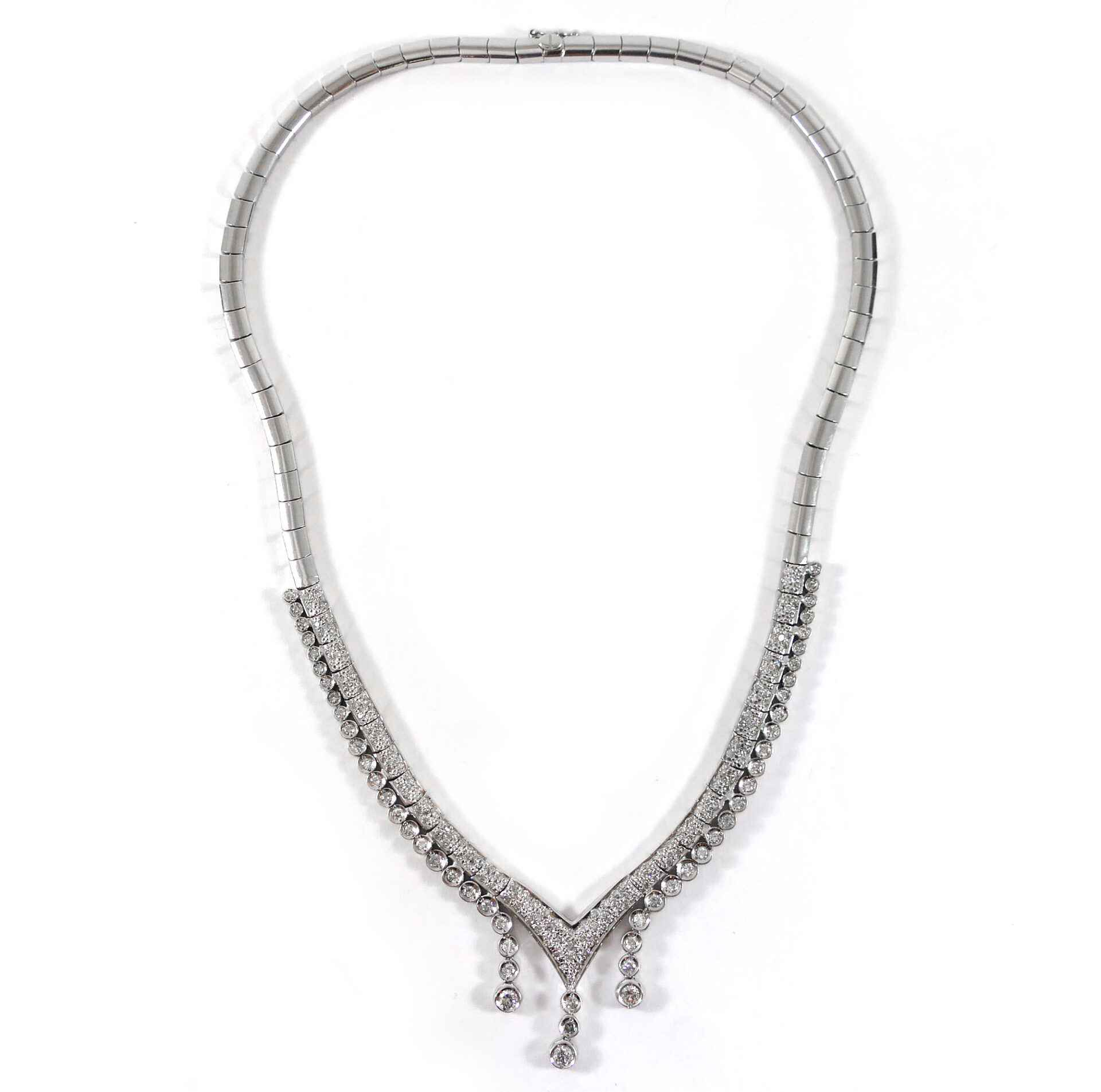 this absolutely stunning diamond necklace holds 3 carats of diamonds, set into solid 18k white gold. This necklace is a beautiful look blinging with diamonds, and the lock holds sturdy and safe with a lock to hold the two ends together. This necklace lays elegantly flat and comfortable on the neck.