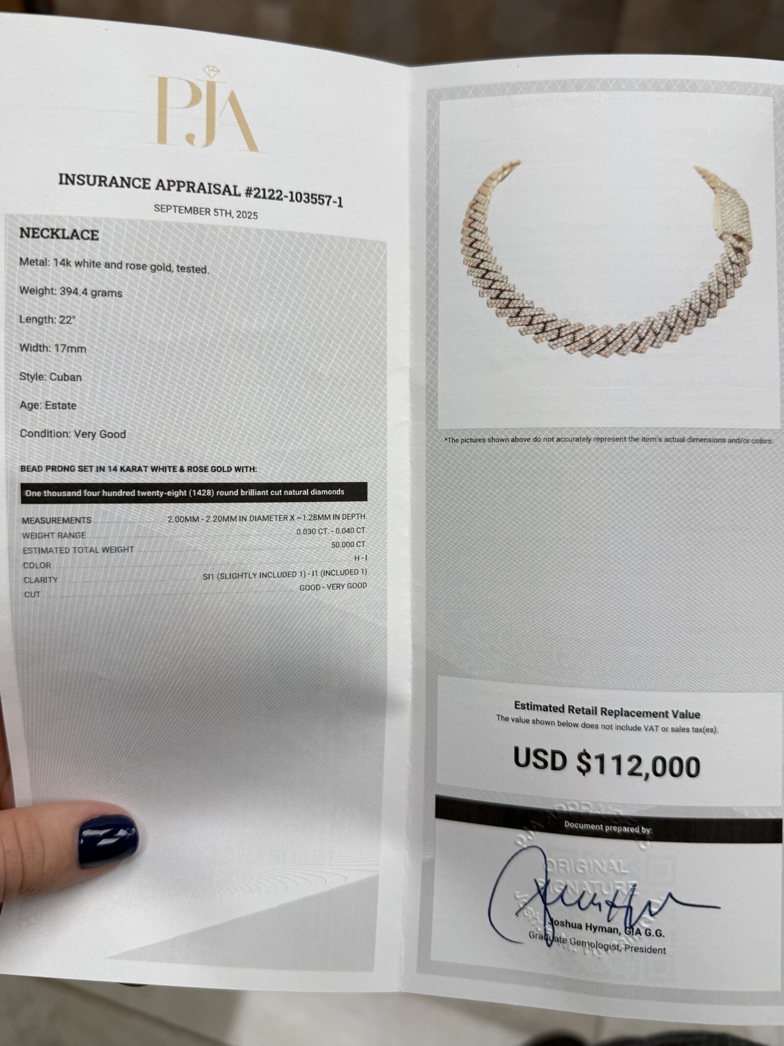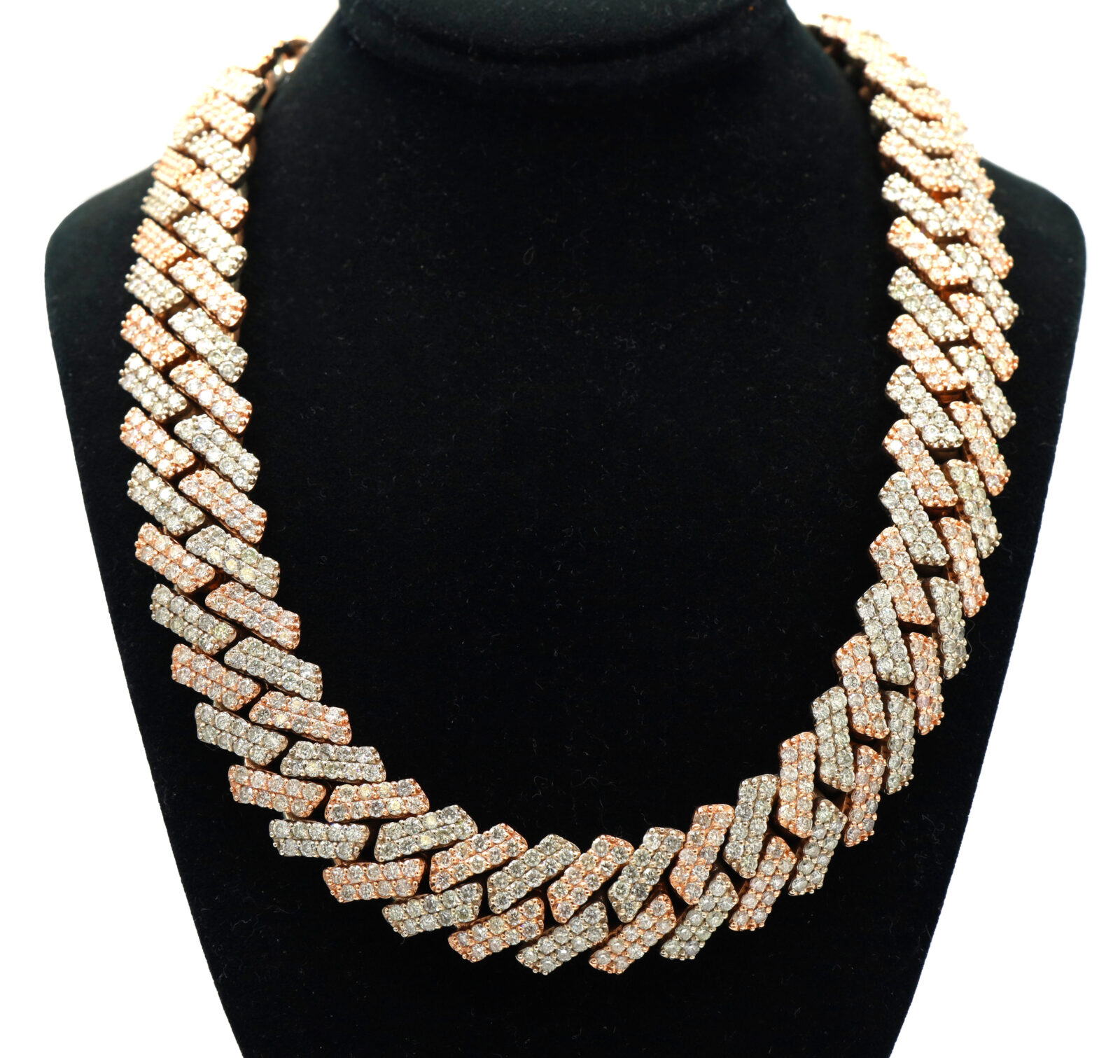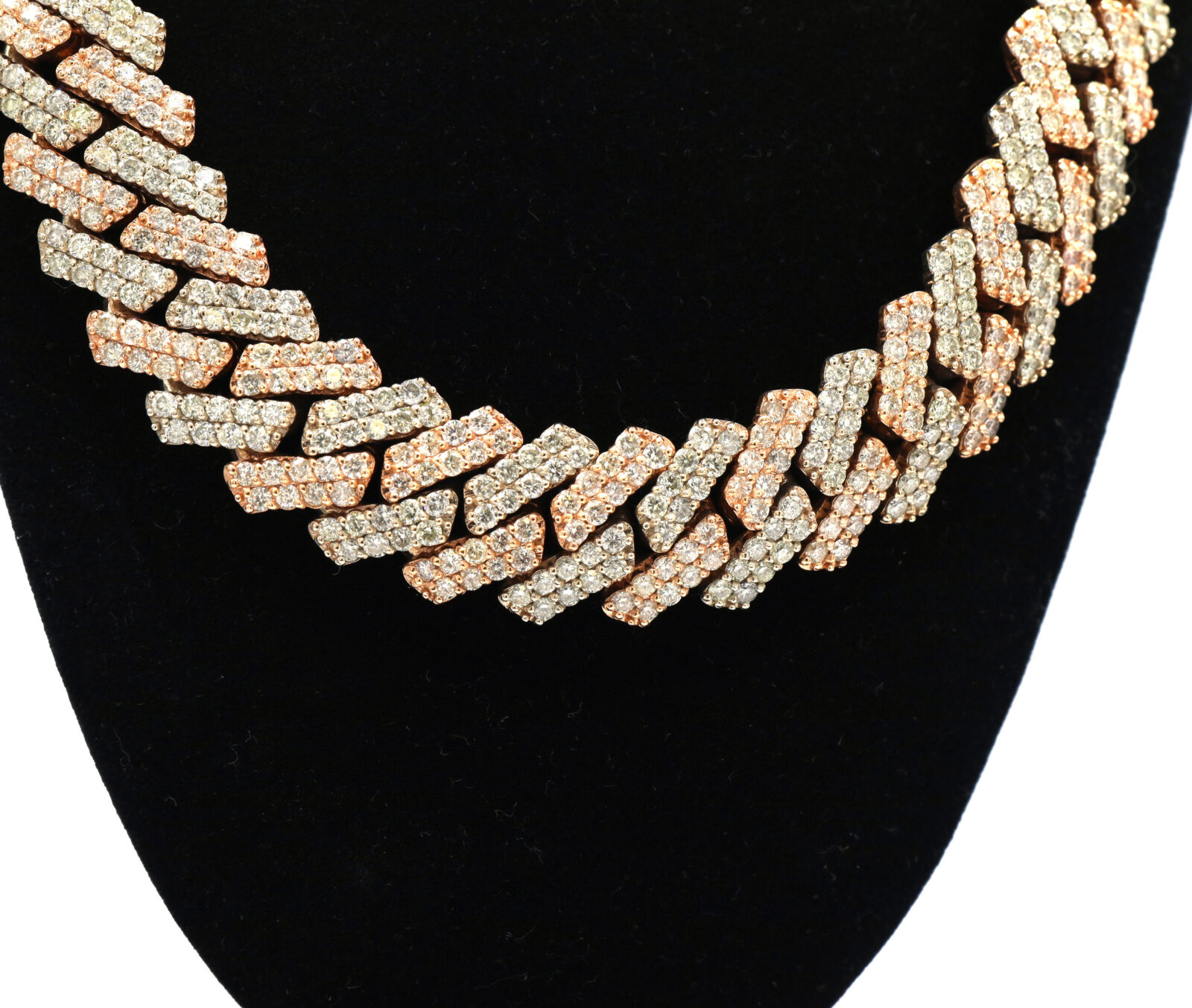 This necklace is third-party appraised. Material: 14k Rose and White Gold Gemstone: Natural Diamond Carat Weight: 50.00 Carat Clarity: SI1 Color: H/I Cut: Round Brilliant Type: Solid Cuban Link Length: 22 Inches Width: 17mm Weight: 394.4 Grams