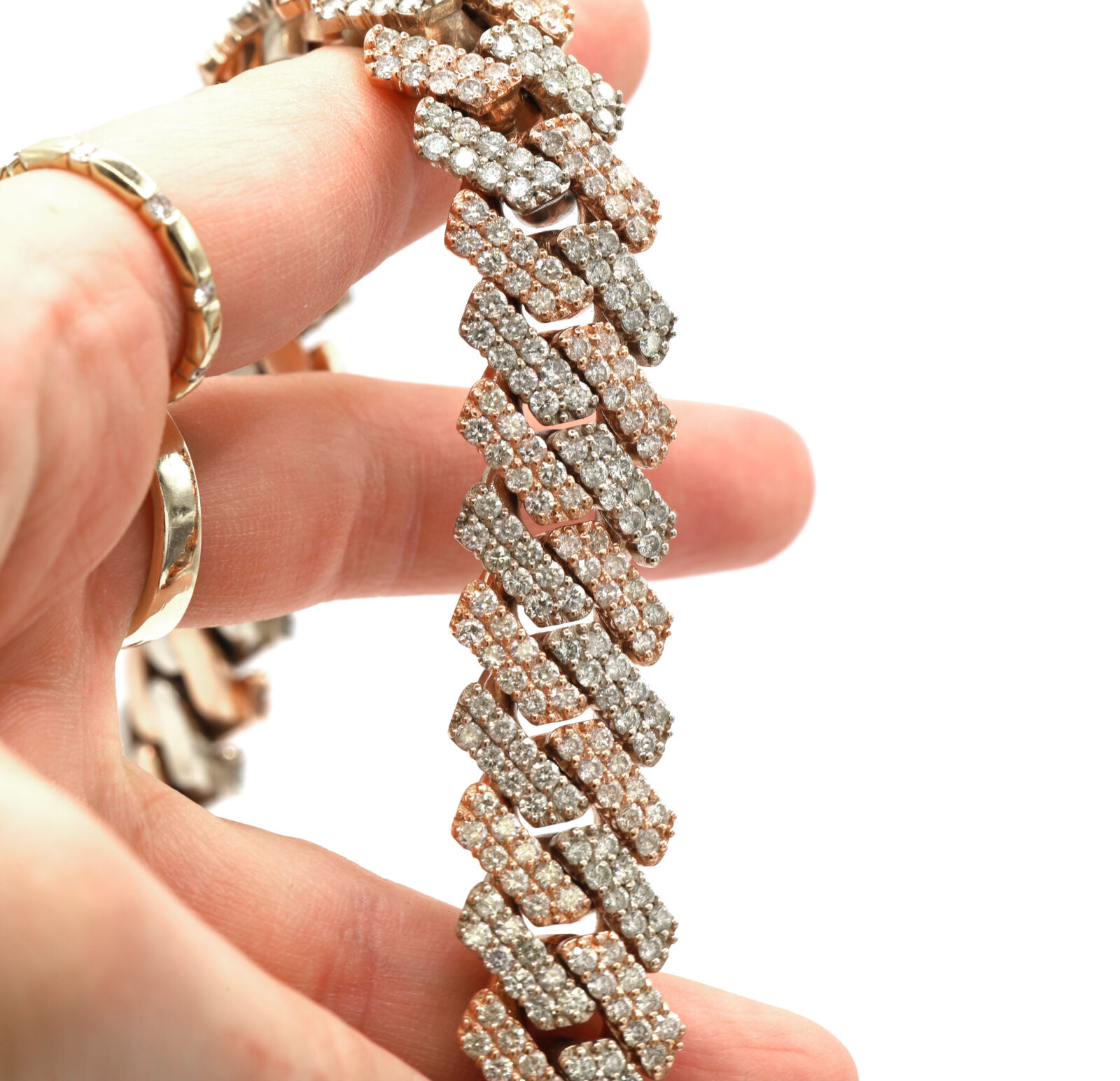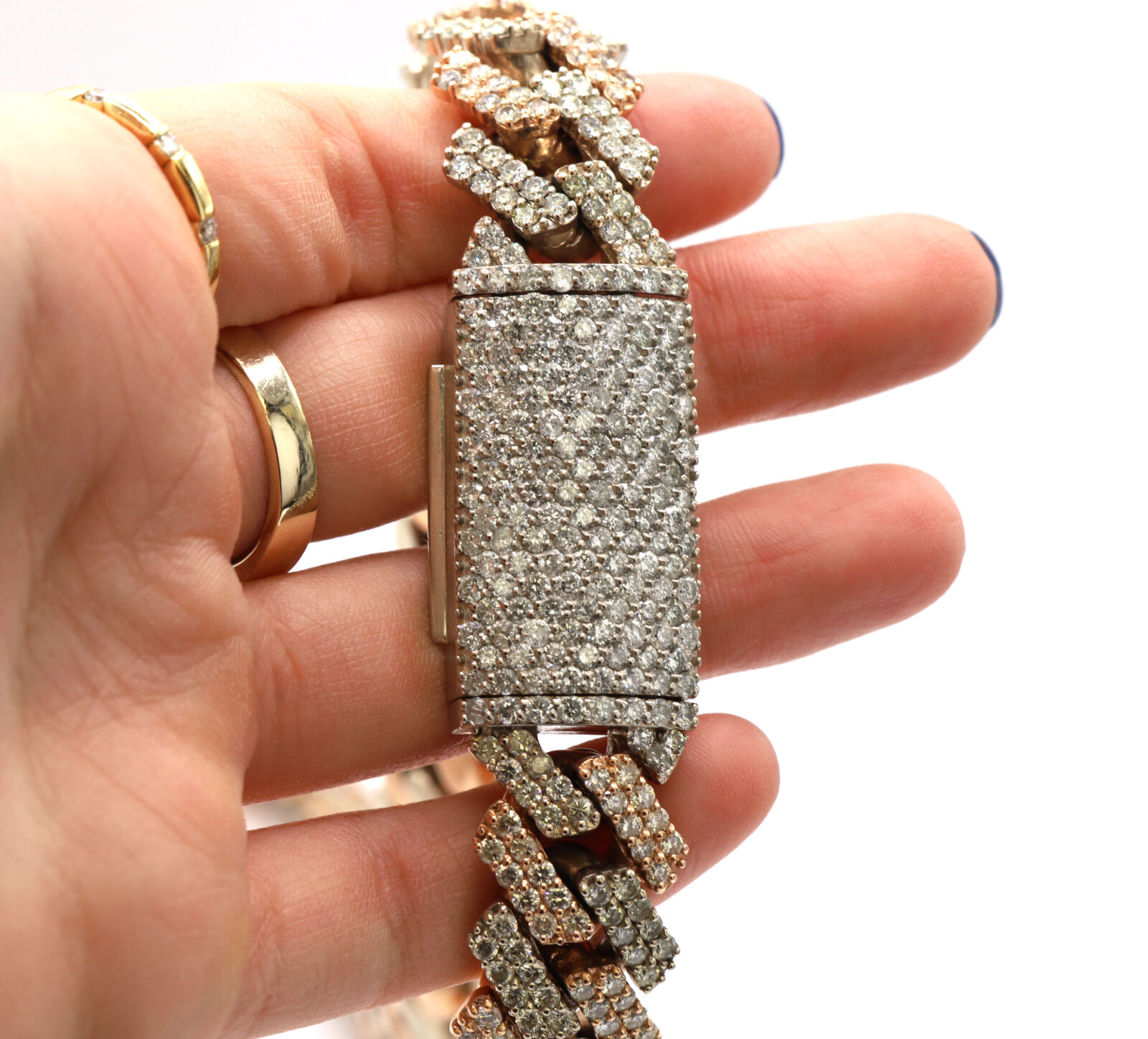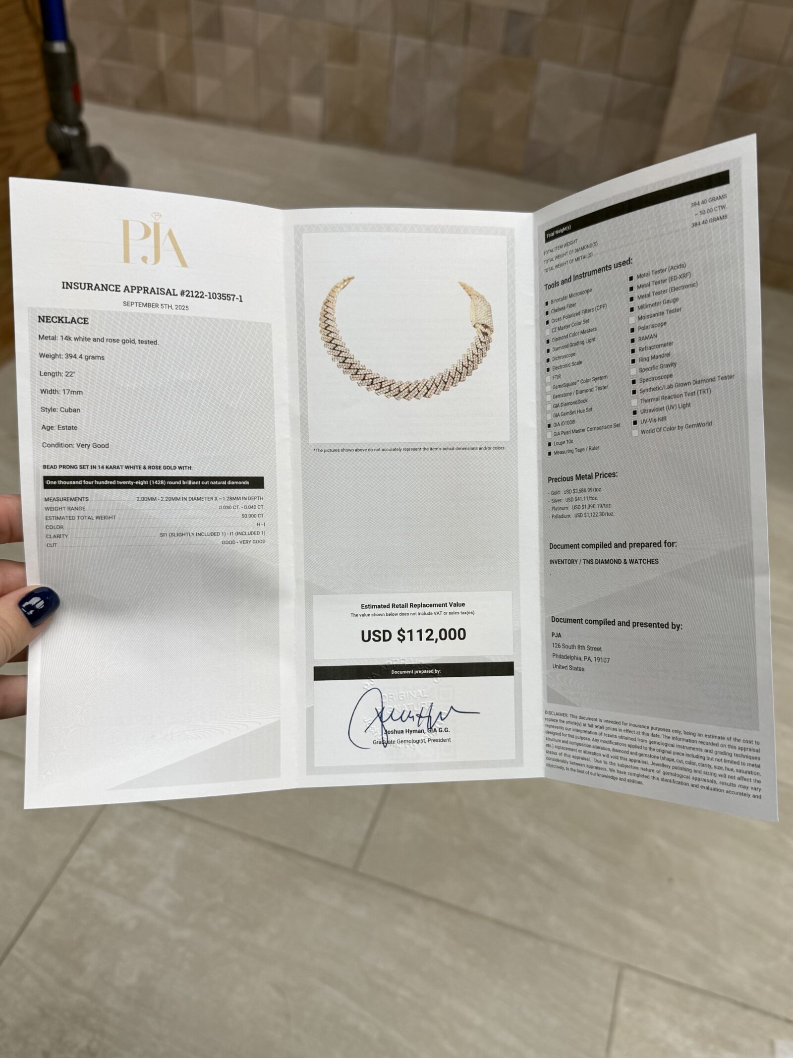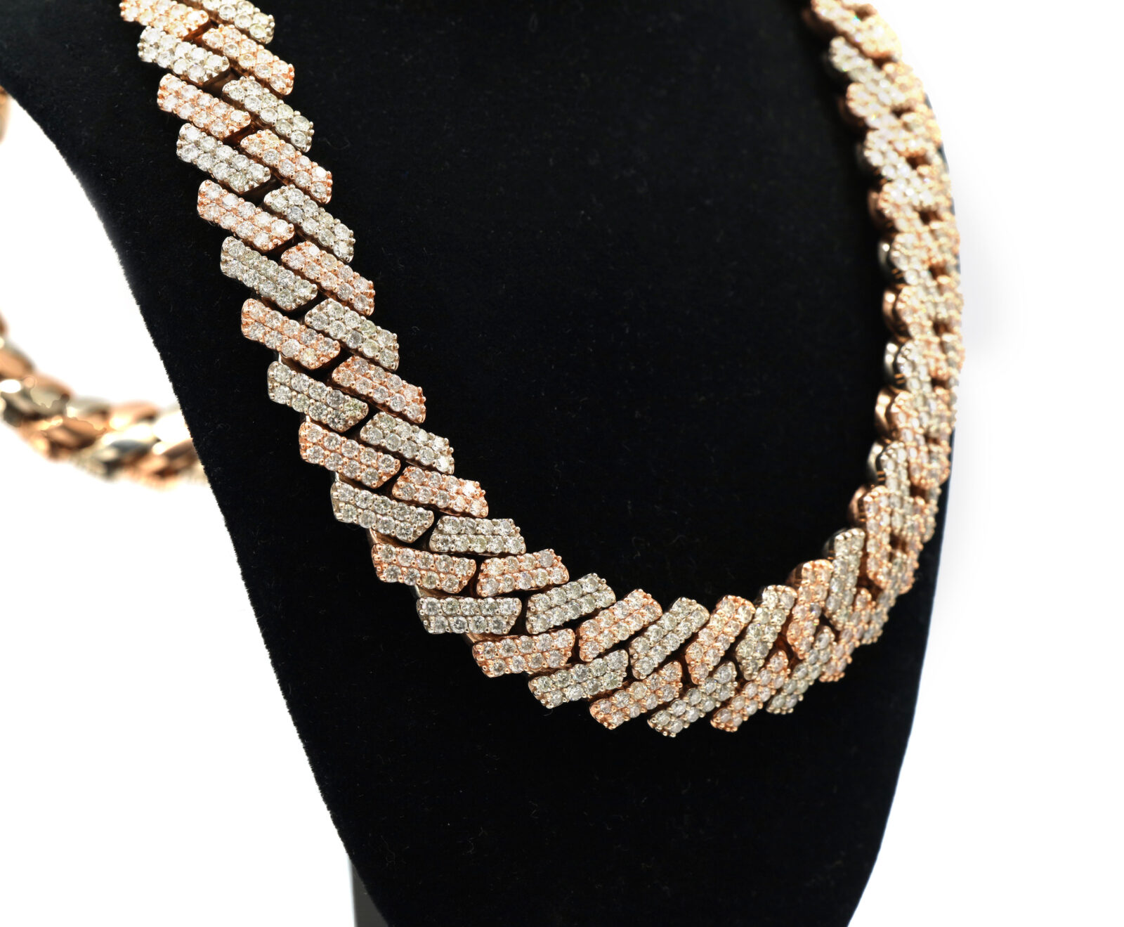 This necklace is third-party appraised. Material: 14k Rose and White Gold Gemstone: Natural Diamond Carat Weight: 50.00 Carat Clarity: SI1 Color: H/I Cut: Round Brilliant Type: Solid Cuban Link Length: 22 Inches Width: 17mm Weight: 394.4 Grams