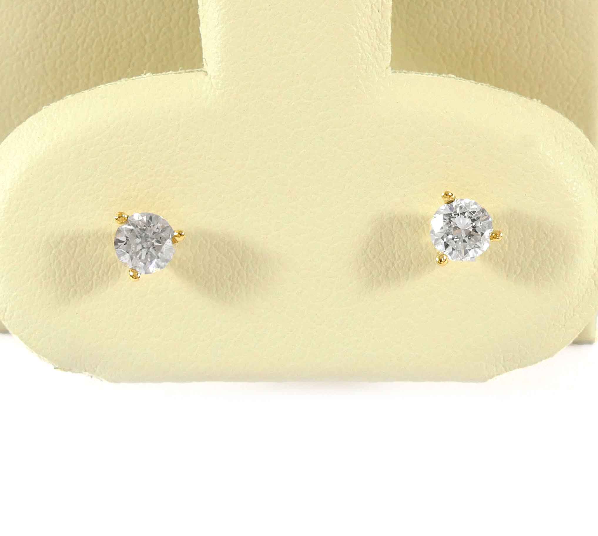 Product Description: These round cut diamond earrings are crafted in 14k yellow gold, and hold a total of .72 carats of diamonds. The diamonds have a quality of I color, and I1 clarity. They feature push backin...