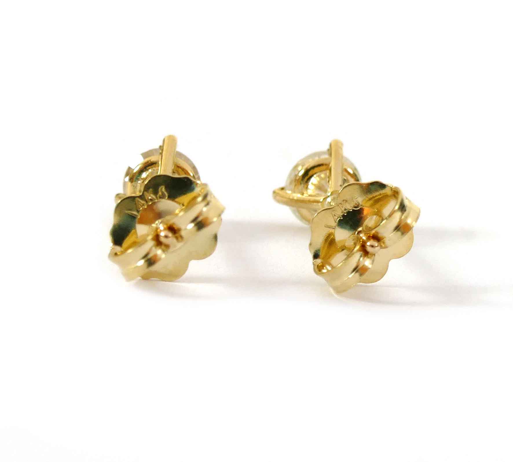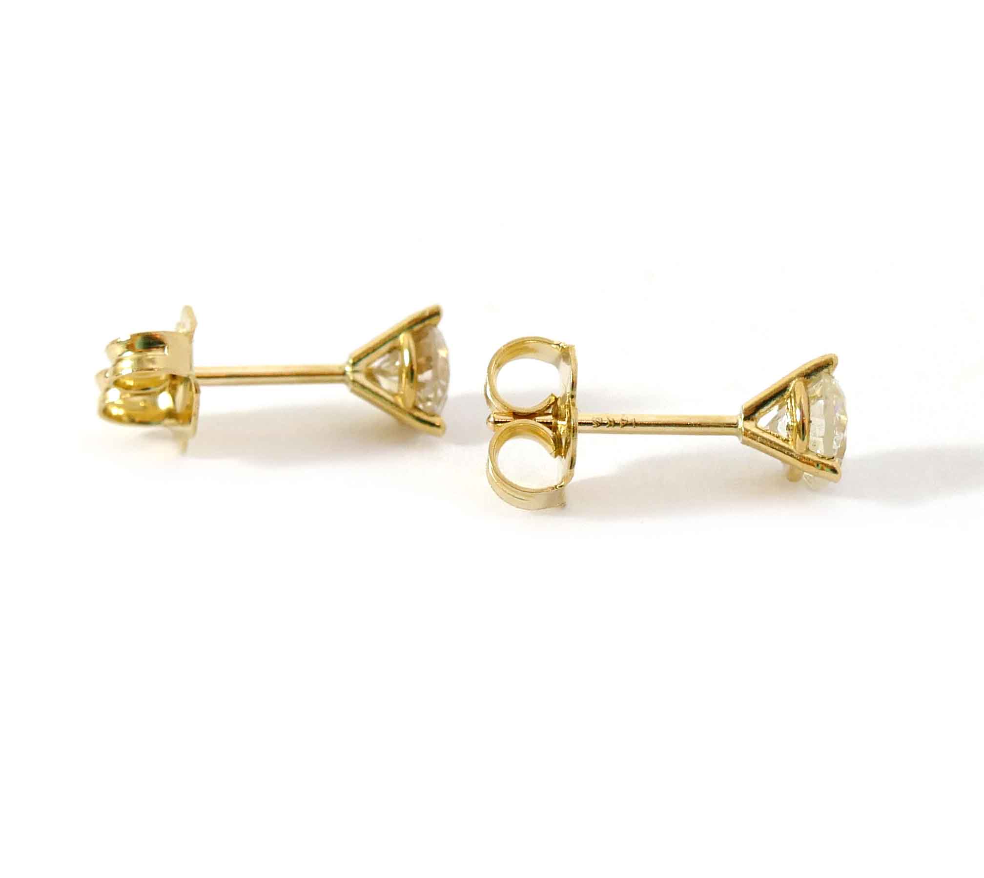 these round cut diamond earrings are crafted in 14k yellow gold, and hold a total of .72 carats of diamonds. The diamonds have a quality of i color, and i1 clarity. They feature push backings to ensure security and safety on the ear.