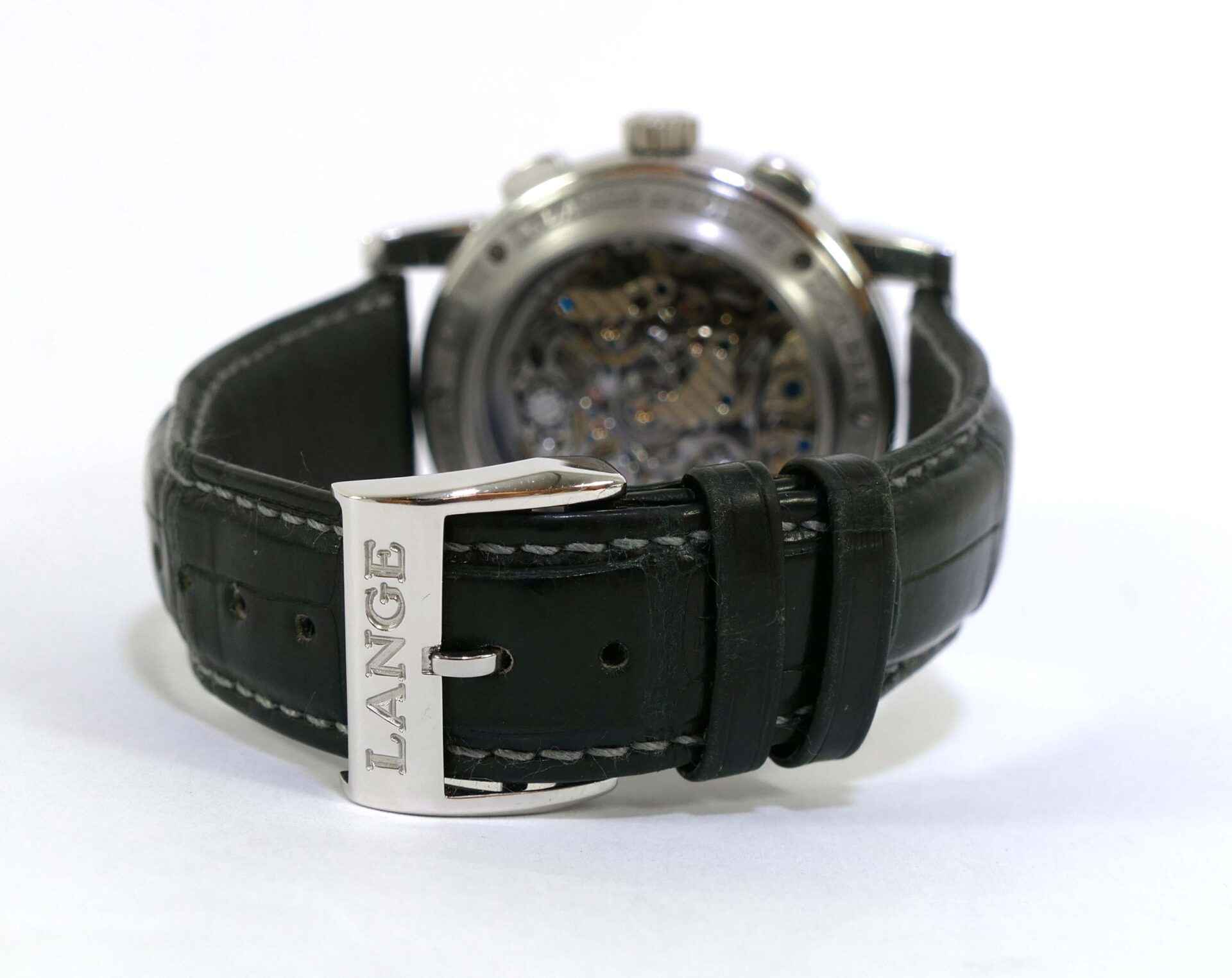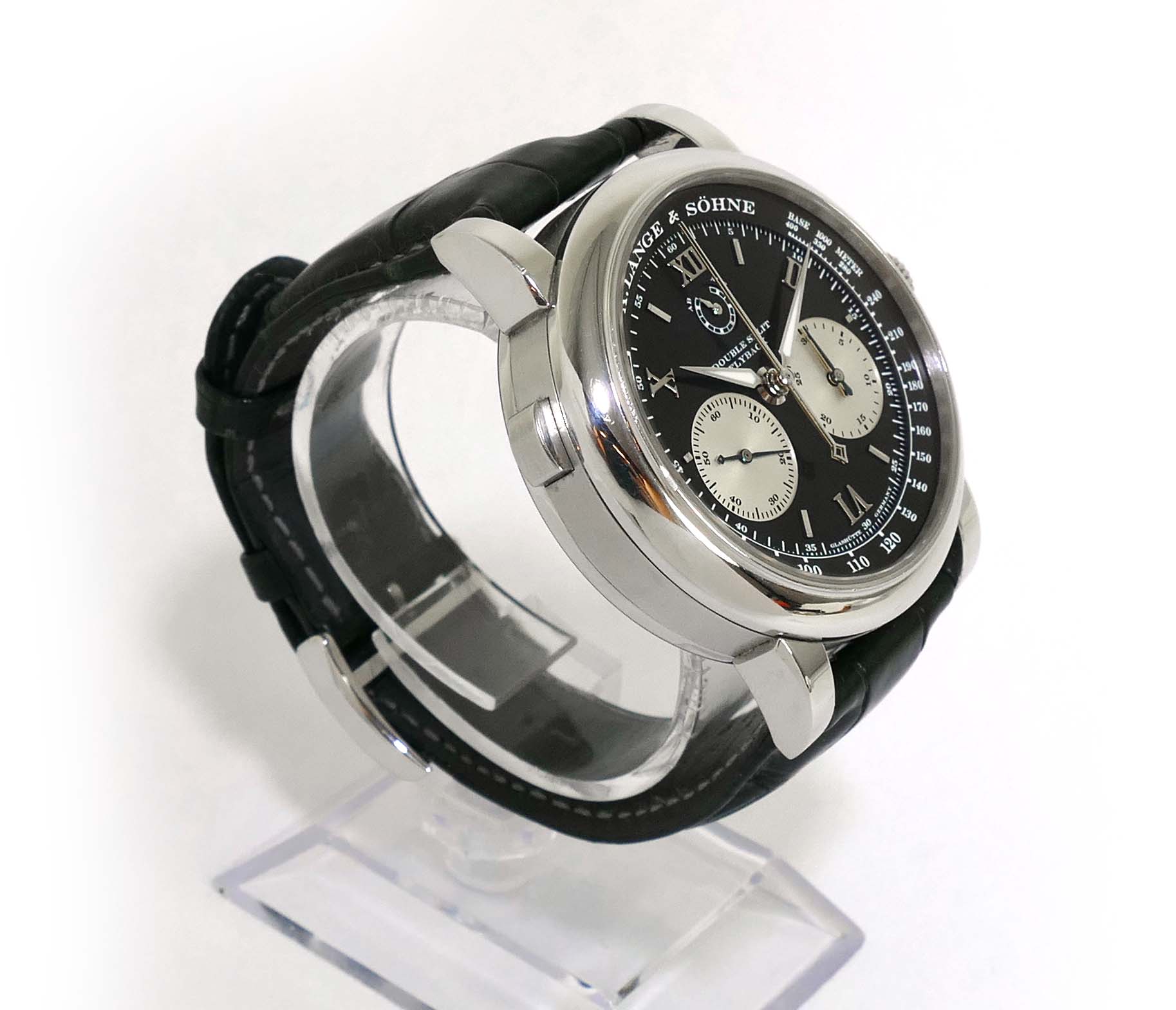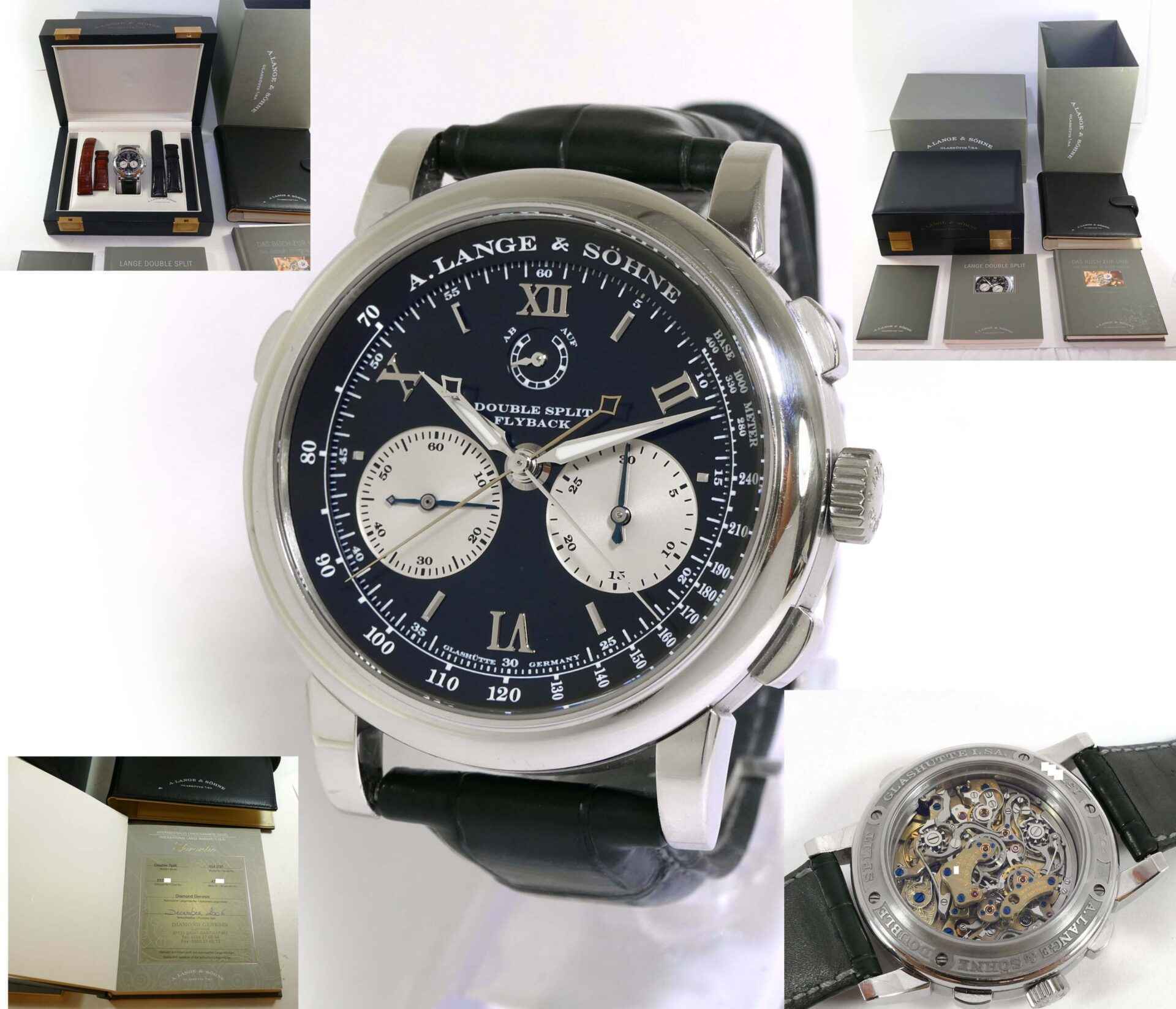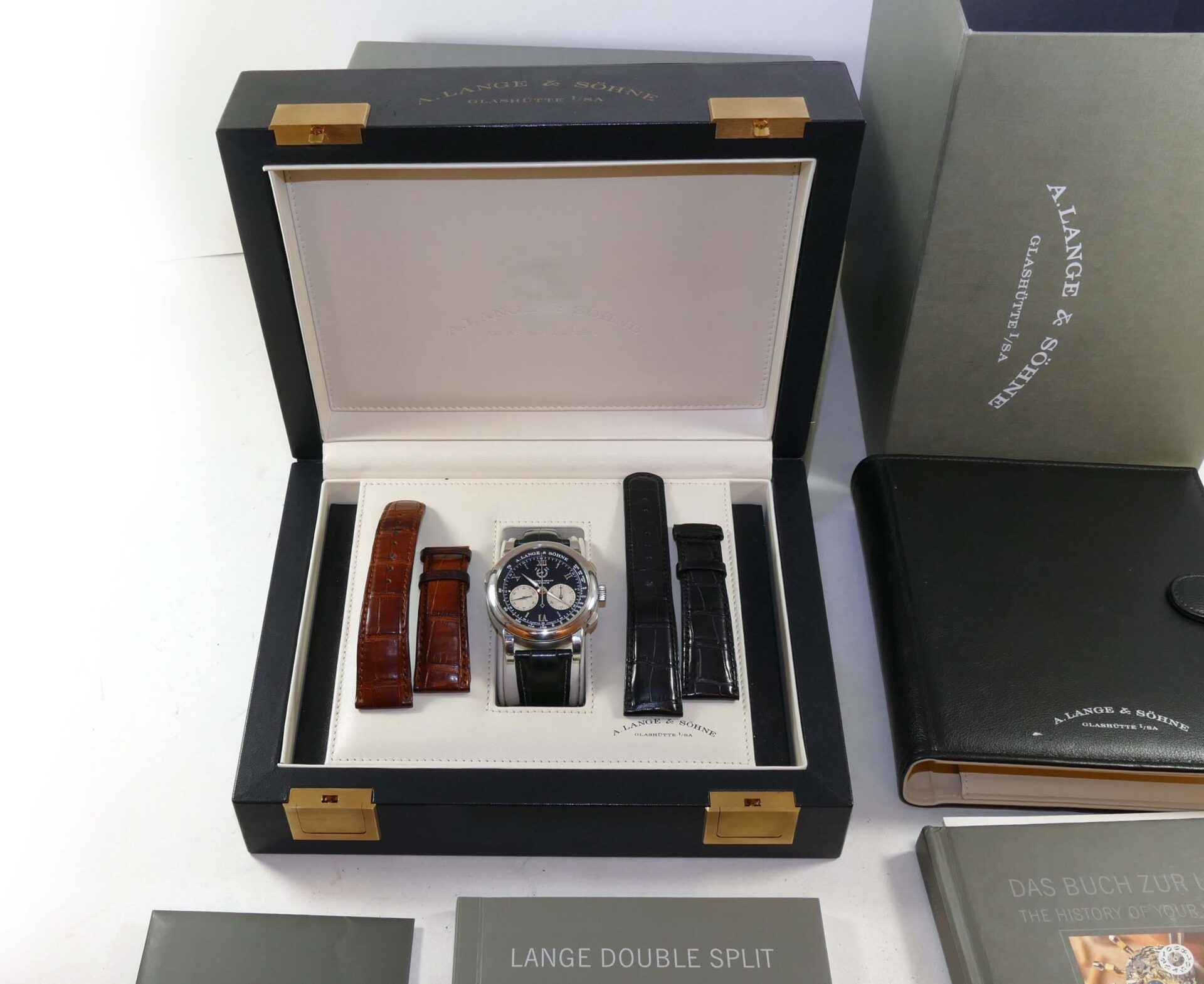 Read Morethis a lange & sohne watch is in very nice condition, showing just some minor wear from regular use. It comes with its complete set of box, booklets, original microfiber cloth, and original paperwork dated december 2006. It comes with 3 original a lange straps, all are in excellent condition with very little use shown, the black leather strap shown on the left side is a long size, the other 2 are regular size.