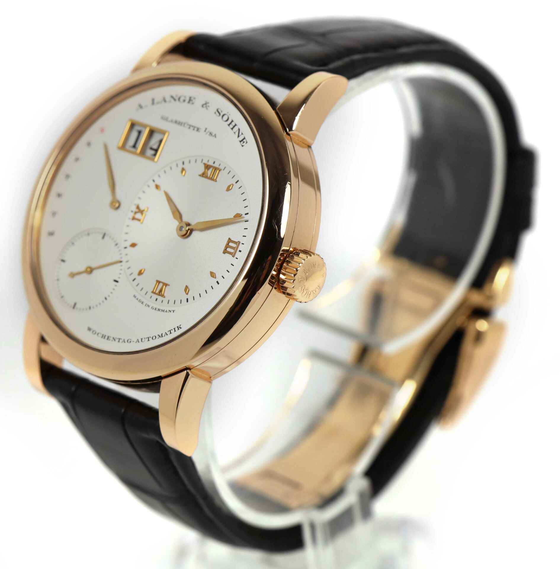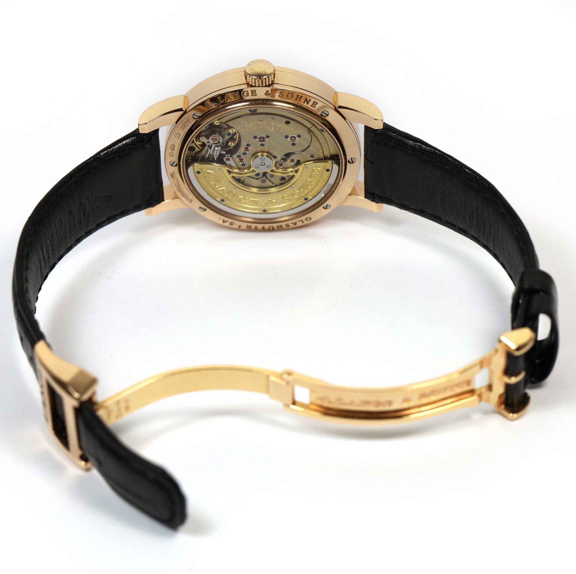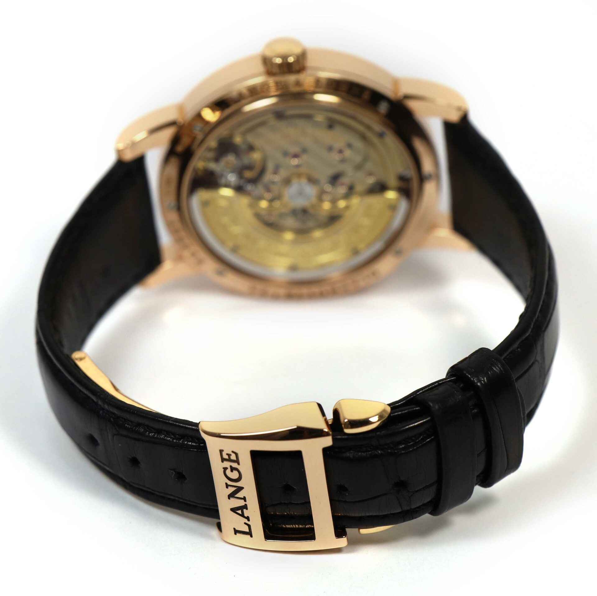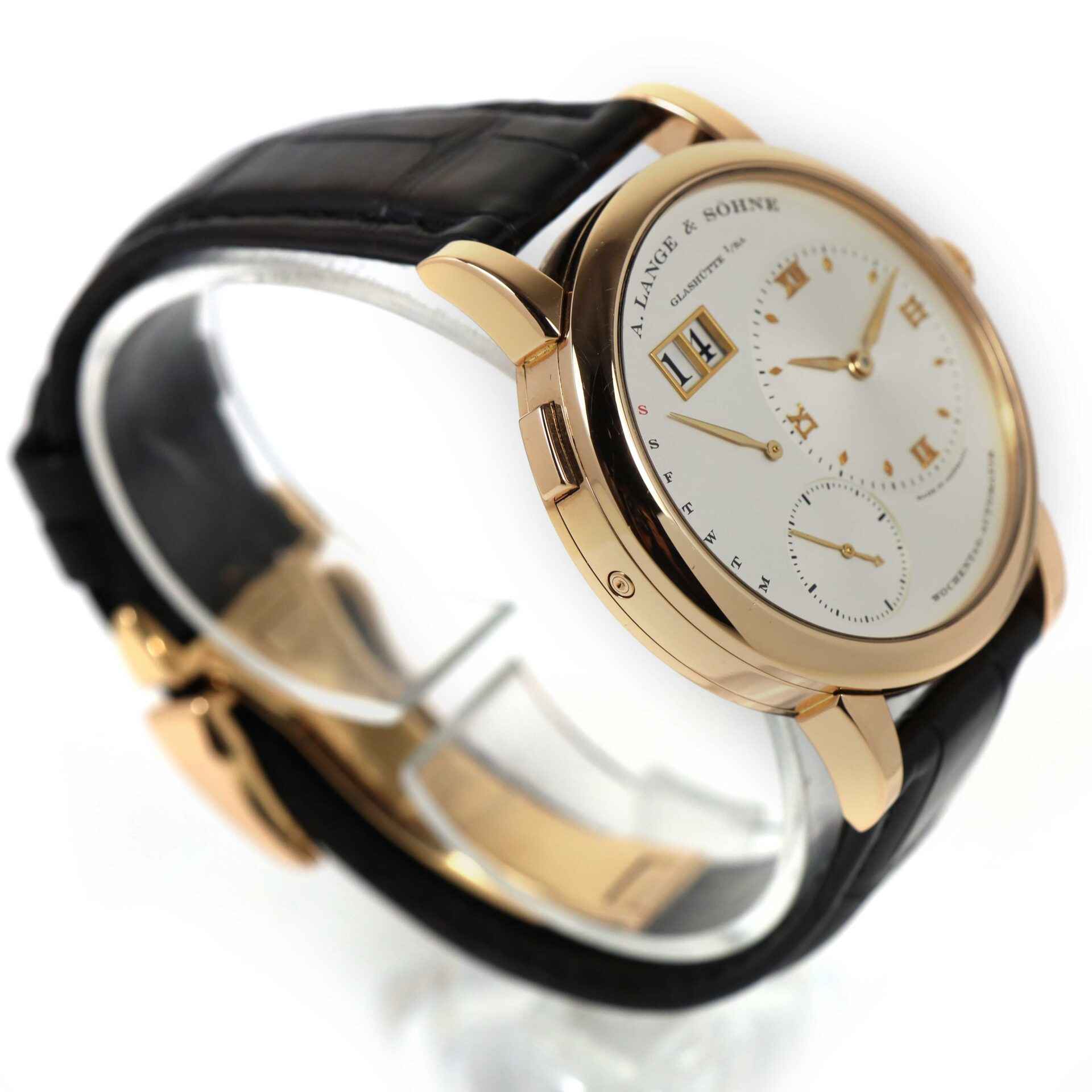 Read Morethis a. Lange & sohne watch is in excellent condition and comes as watch only as shown in the pictures attached. This watch features a 39.5mm 18k rose gold case that surrounds a silver dial and comes on a black leather strap with a rose gold deployant clasp. The functions include hours, minutes, small seconds, day and date. This watch is in stock and available to ship immediately!