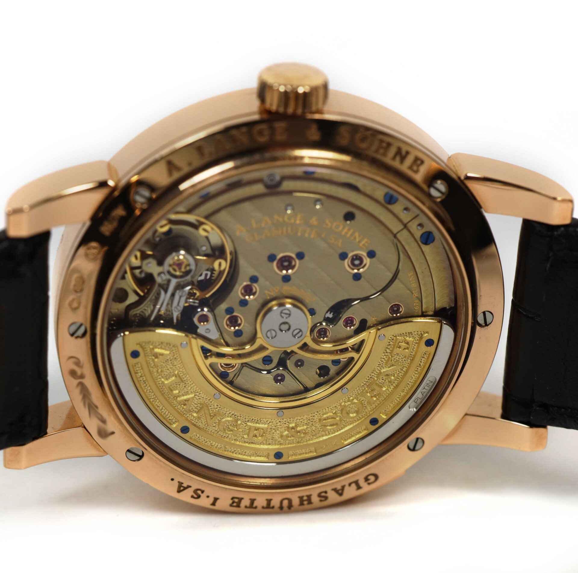 This A. Lange & Sohne watch is in excellent condition and comes as watch only as shown in the pictures attached. This watch features a 39.5mm 18k rose gold case that surrounds a silver dial and comes on a black leath...