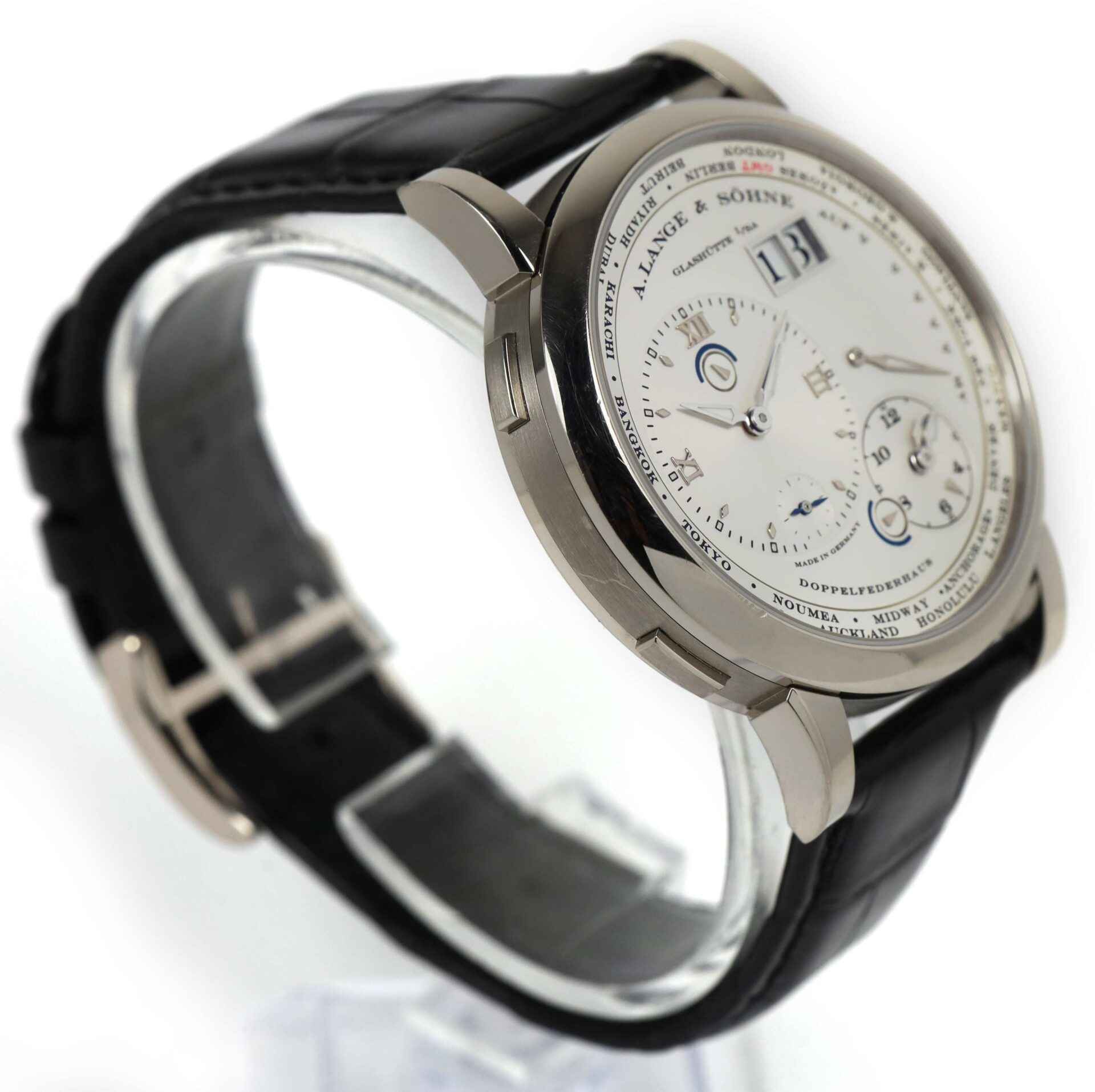 this a. Lange & söhne is in excellent condition and comes with its 2023 a. Lange service papers as shown in the pictures attached. This watch features a white gold case that surrounds a silver dial and comes on a black leather strap. The functions of this watch include the world time on the outer rim, big date, gmt, second time zone, hour, minute, small second, power reserve indicator, and day/night indicator. This watch is in stock and available to ship immediately!