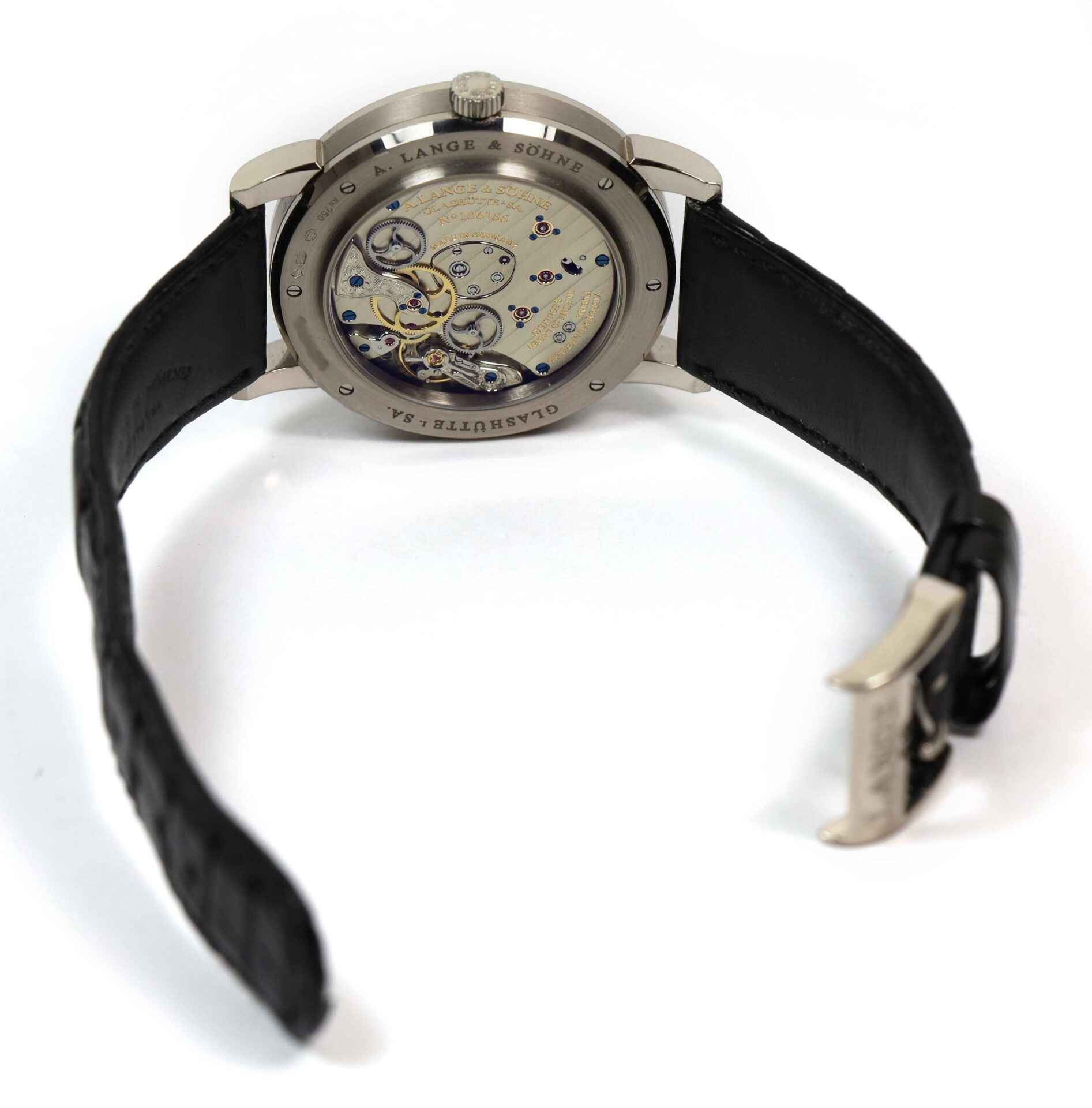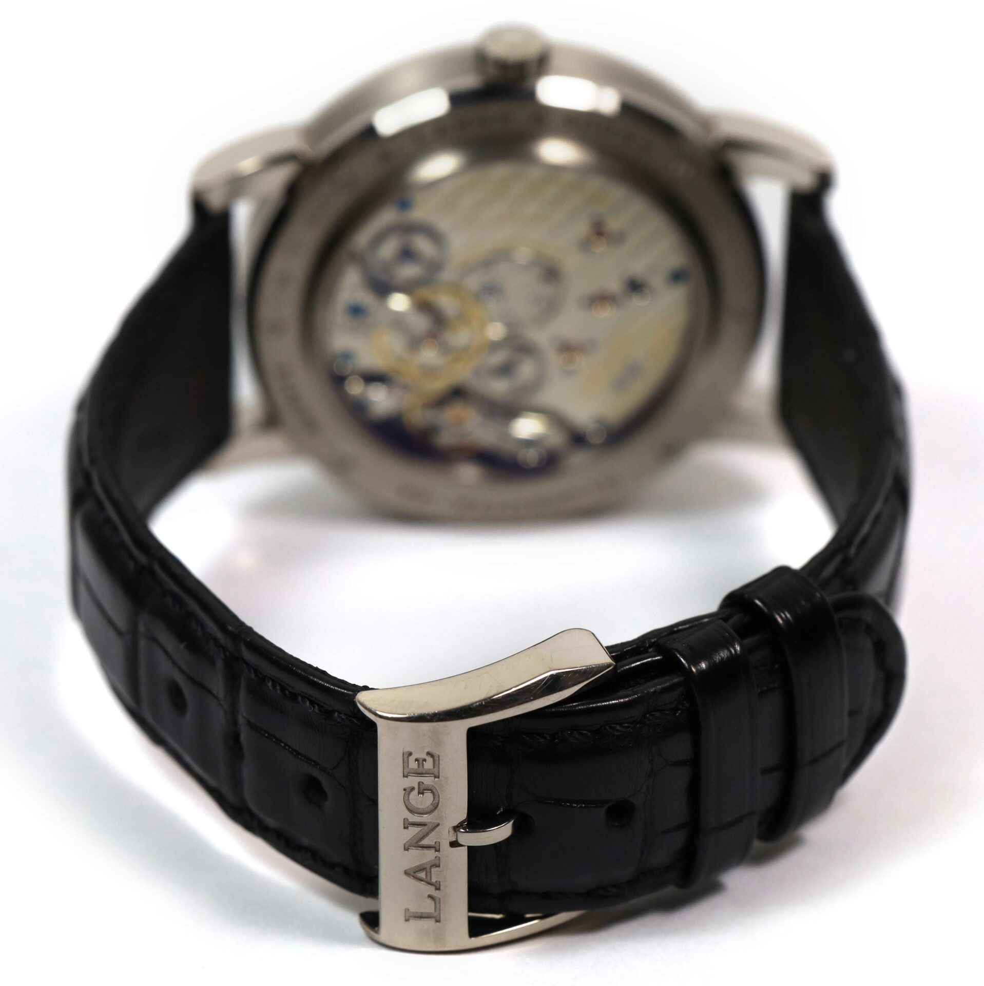 This A. Lange & Söhne is in excellent condition and comes with its 2023 A. Lange service papers as shown in the pictures attached. This watch features a white gold case that surrounds a silver dial and comes on a bla...