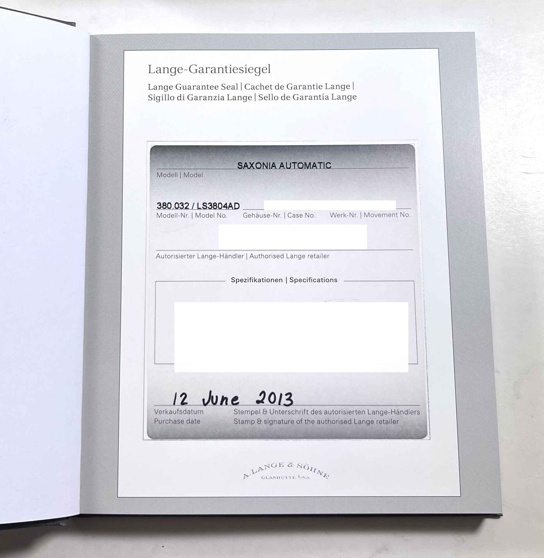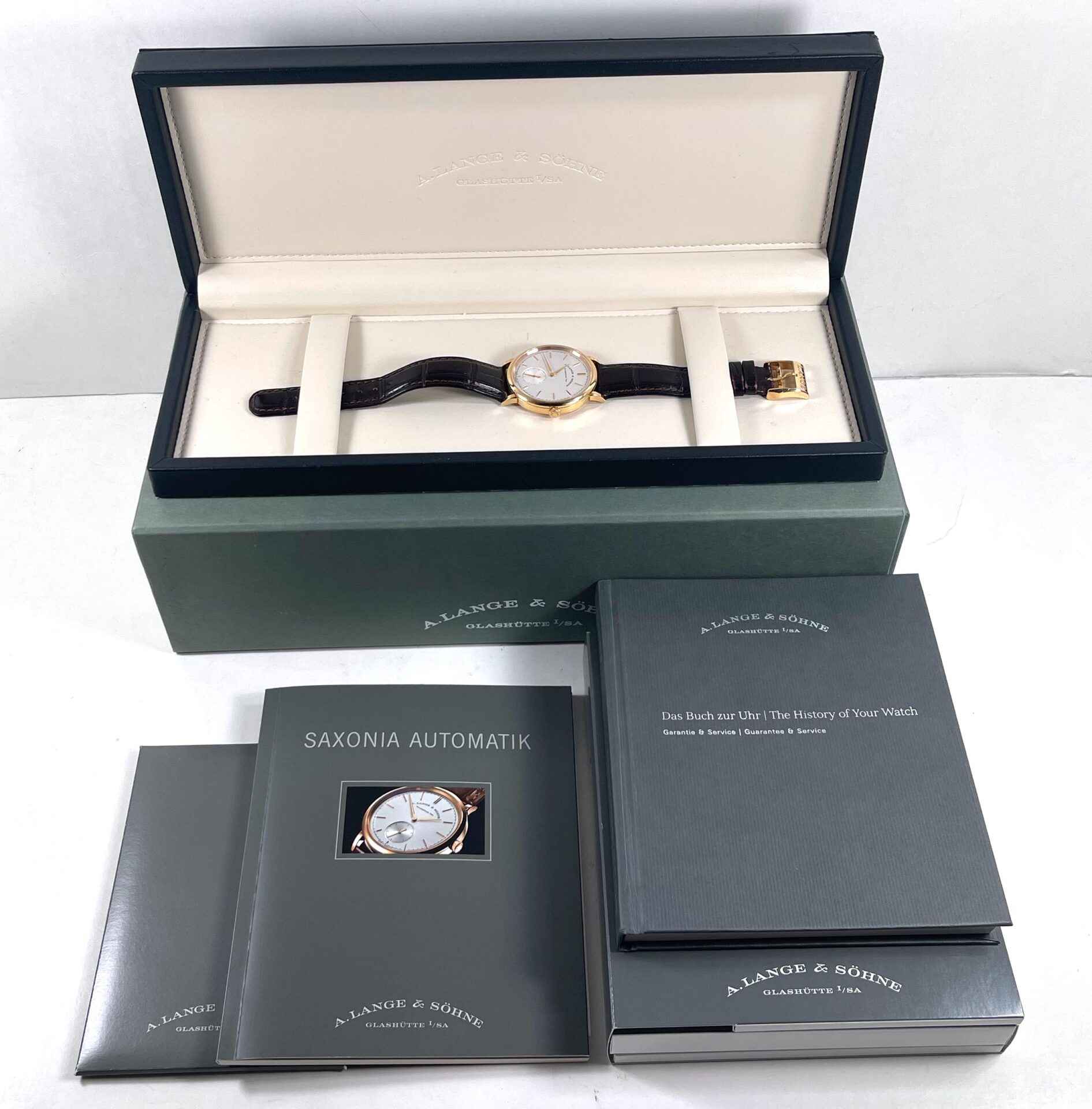 Read Morethis a. Lange saxonia is in excellent overall condition and comes with its box, papers, and warranty booklet dated june 12th, 2013 as shown in the photos attached. This watch is in stock and available to ship immediately!