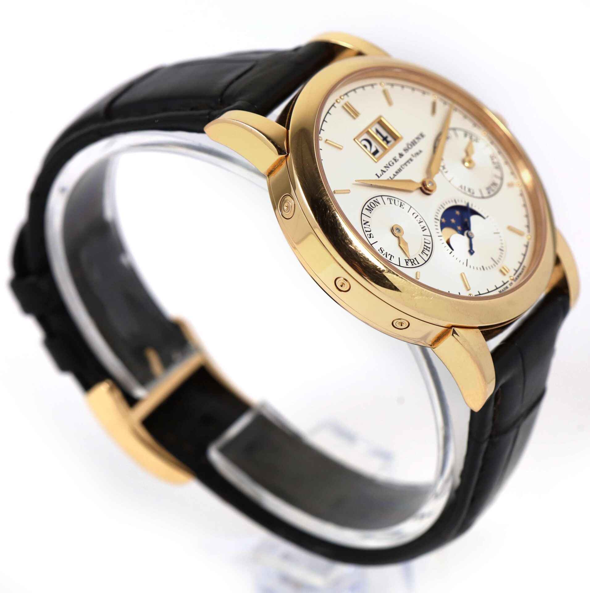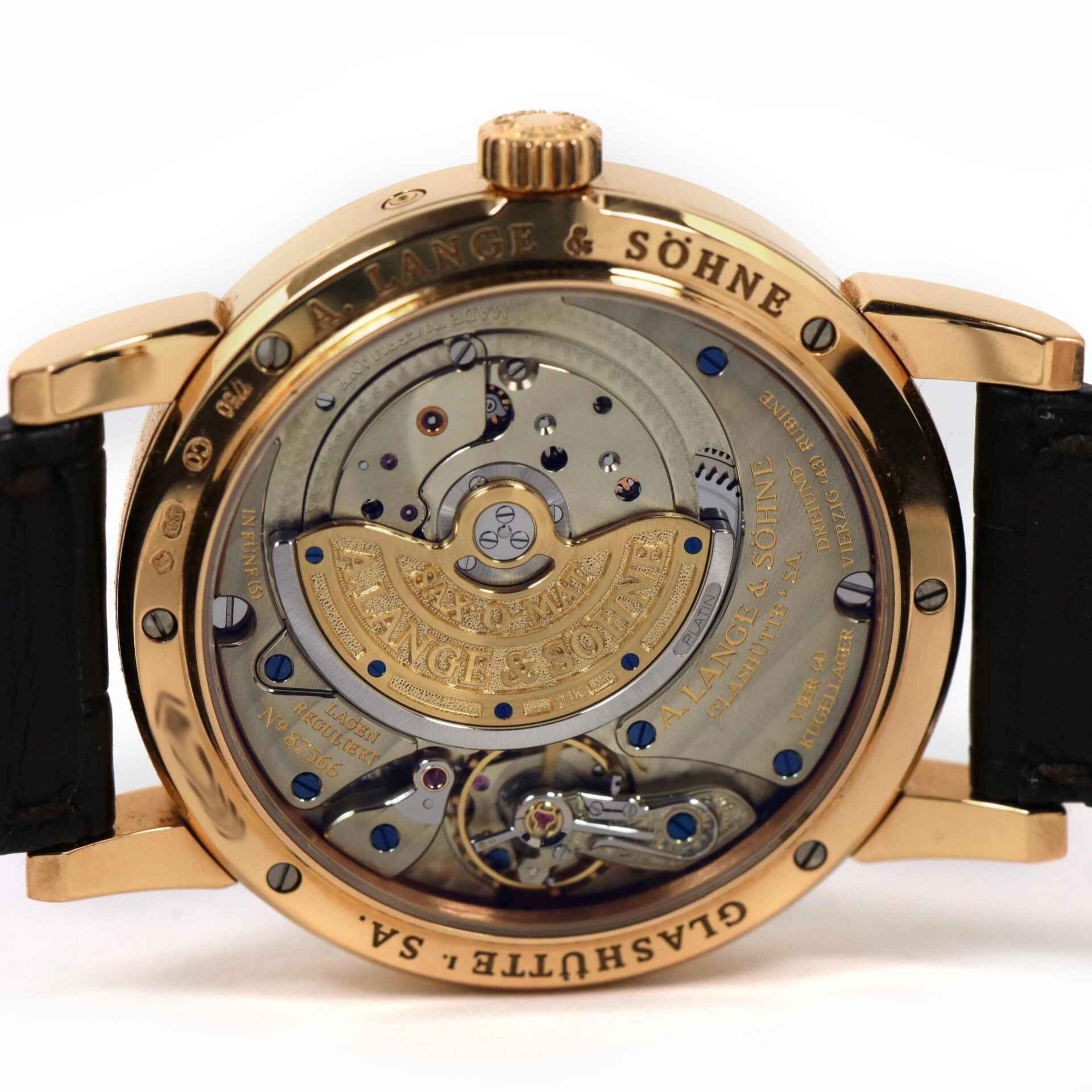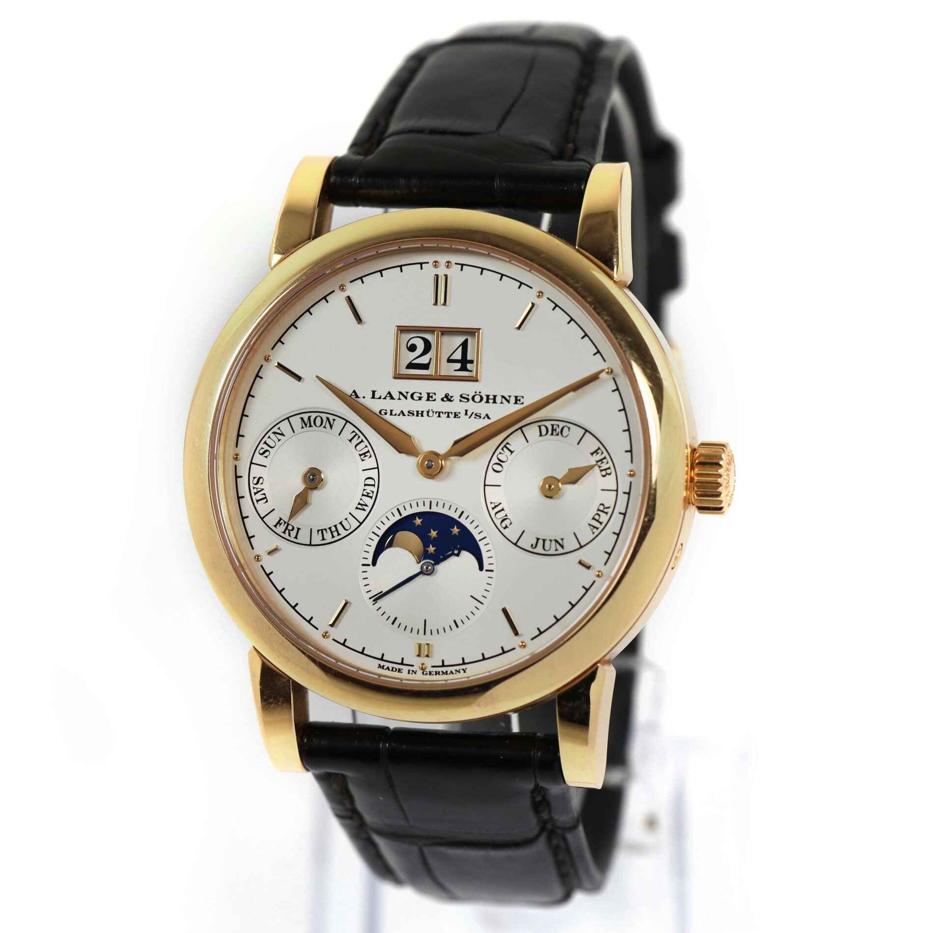 Read Morethis a. Lange & sohne is in excellent condition and comes as watch only as shown in the pictures attached. This watch features a 38.5mm 18k rose gold case surrounding a silver dial on a brown alligator strap with an 18k rose gold tang buckle. The functions include hours, minutes, day, date, month, annual calendar and moon phase. This watch is in stock and available to ship immediately!