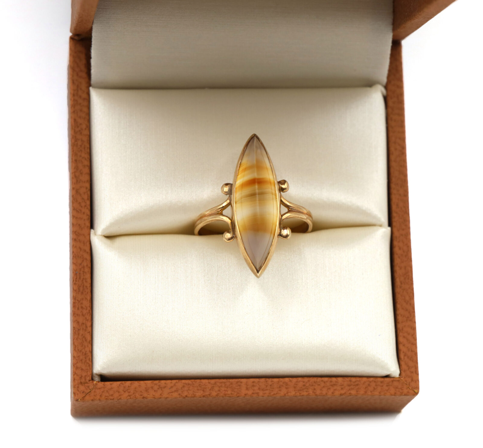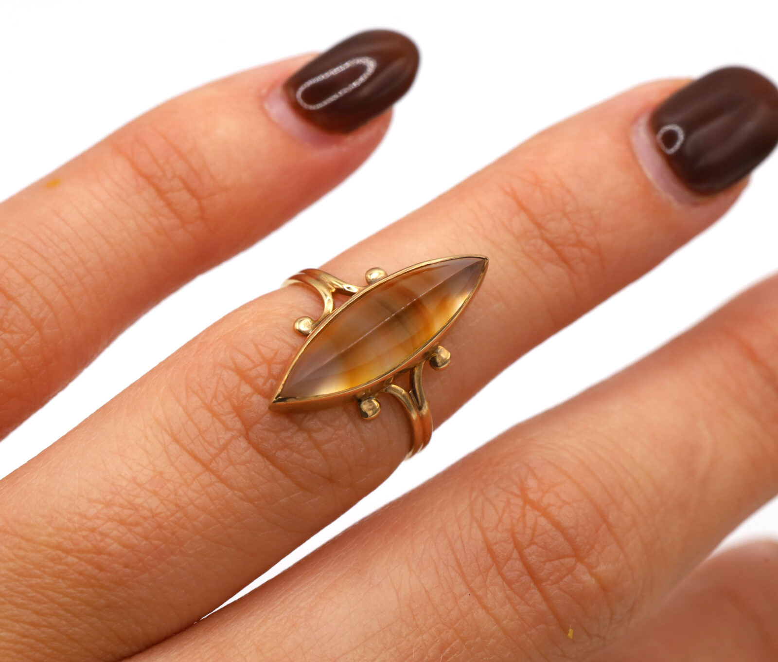 Ring Size: 4.5 Material: 14k Yellow Gold Width of Front: 20mm Width of Back: 1.7mm Weight: 1.8 Grams Stone: Agate Cut: Marquise Cabochon Knife-Edge