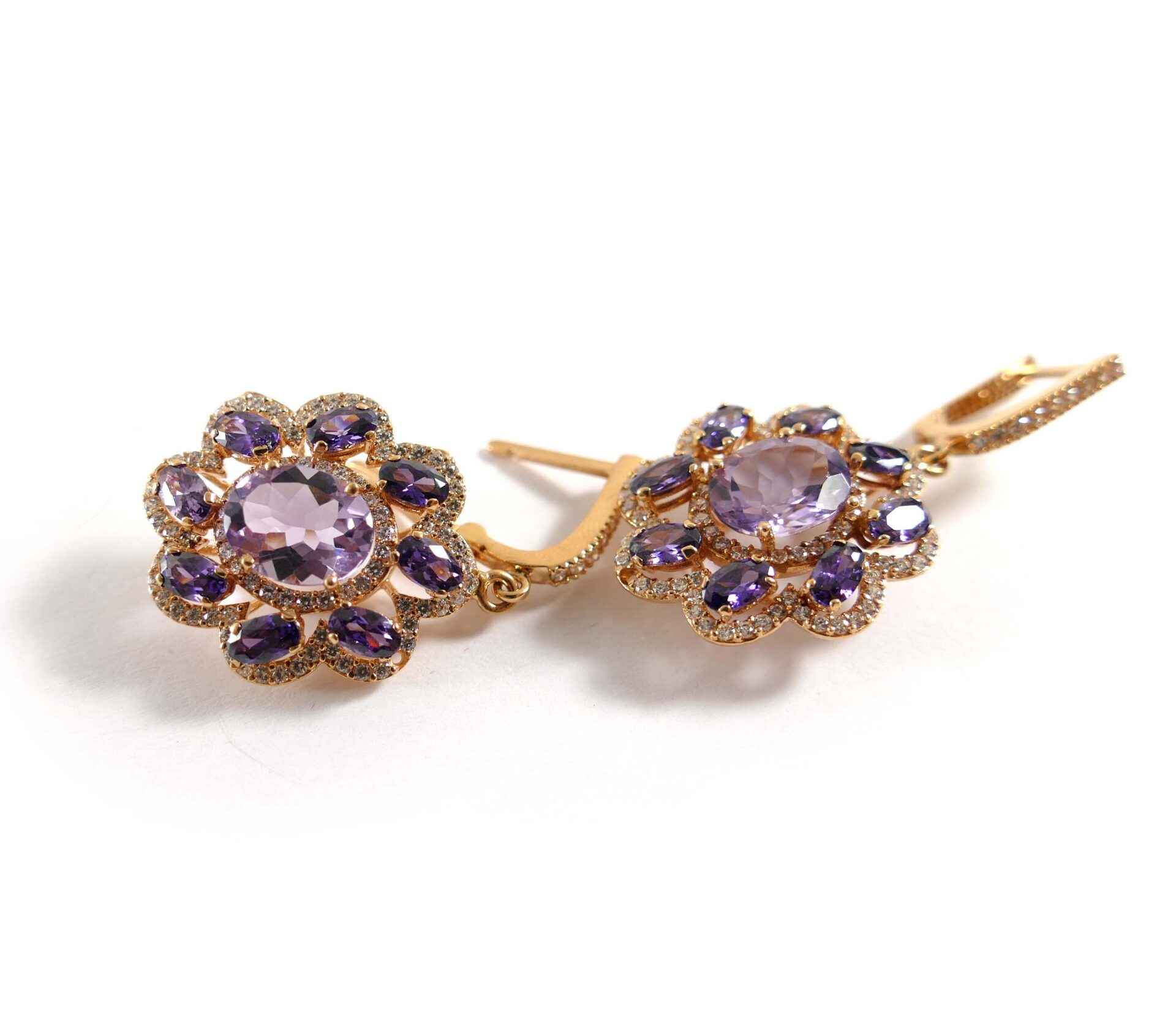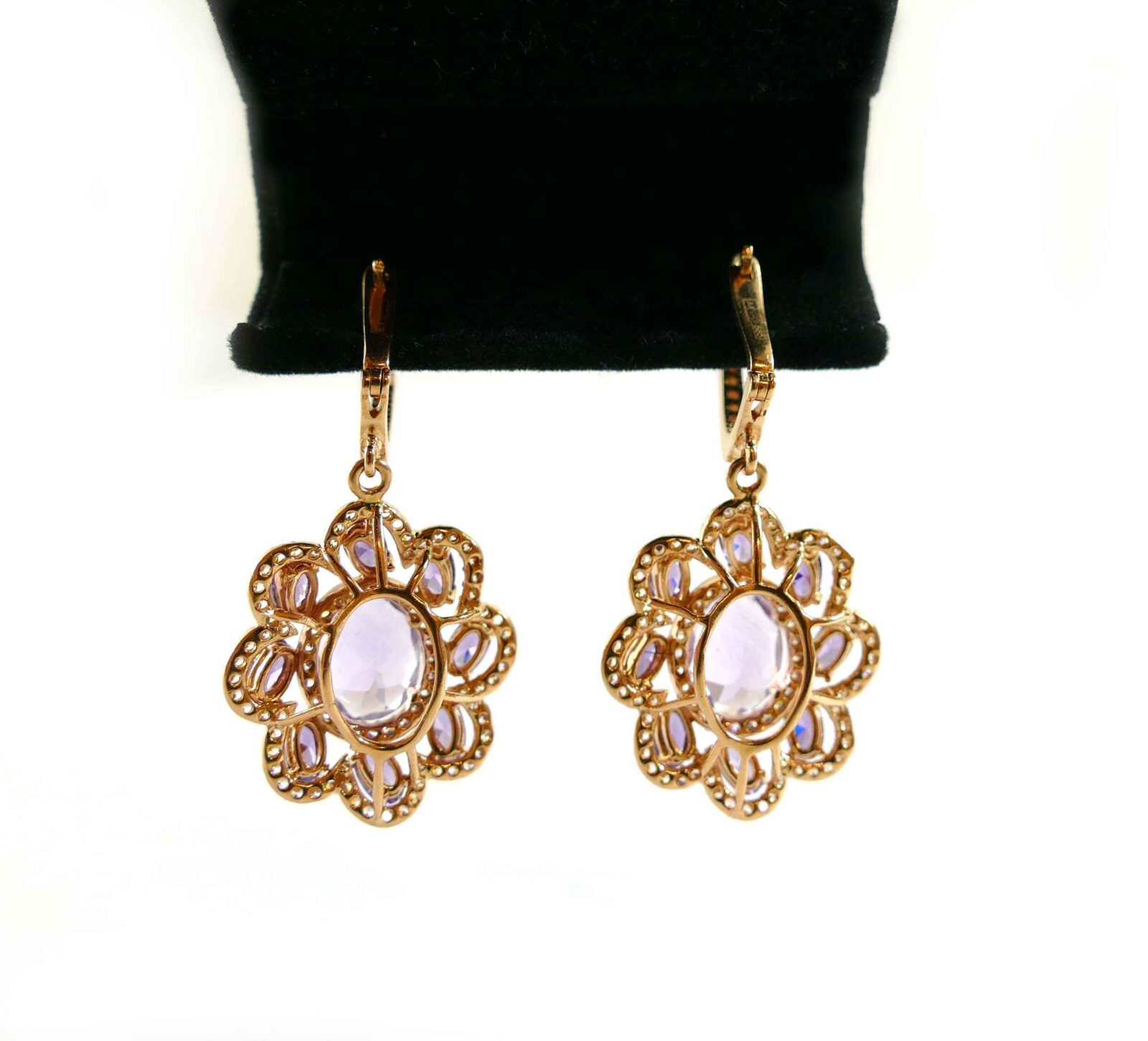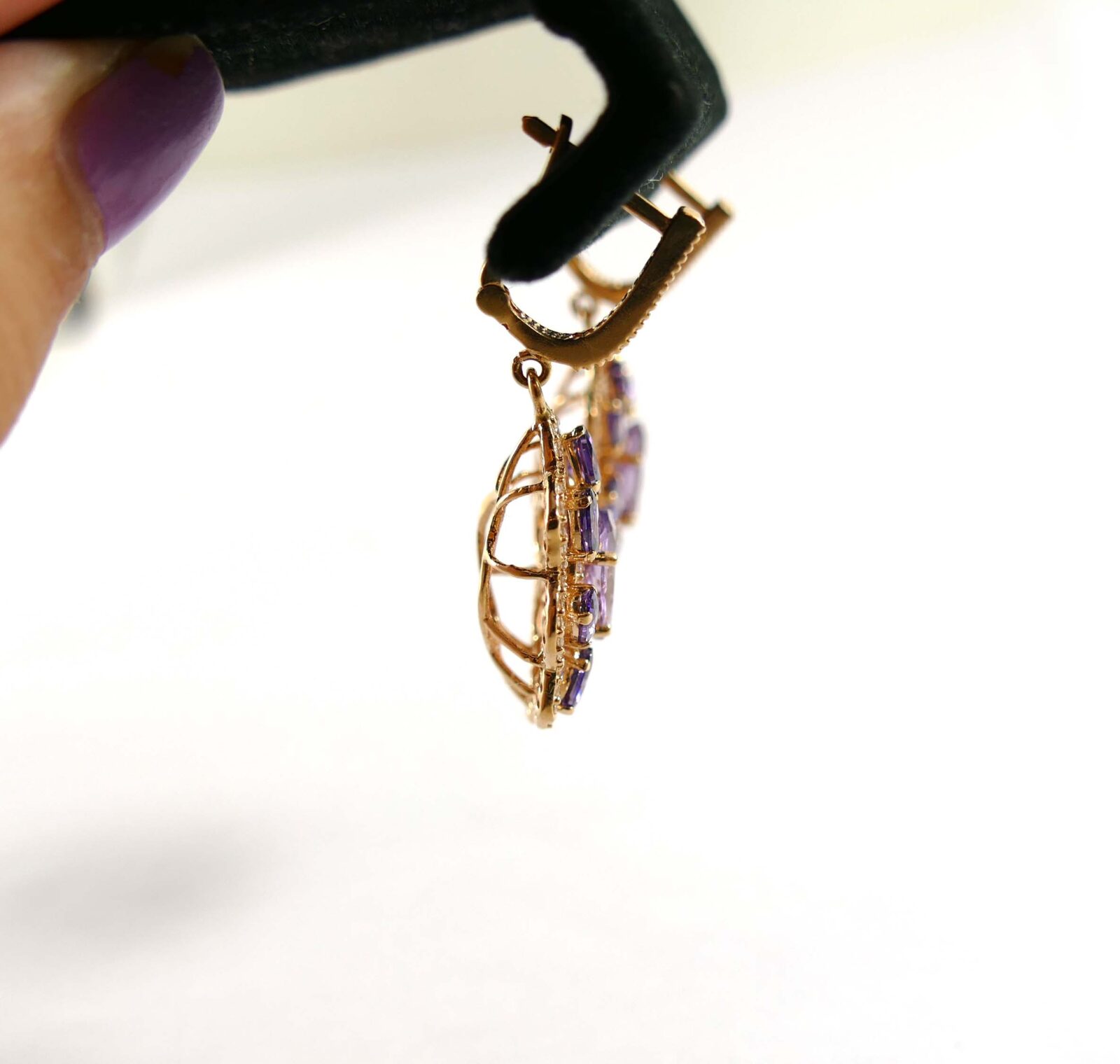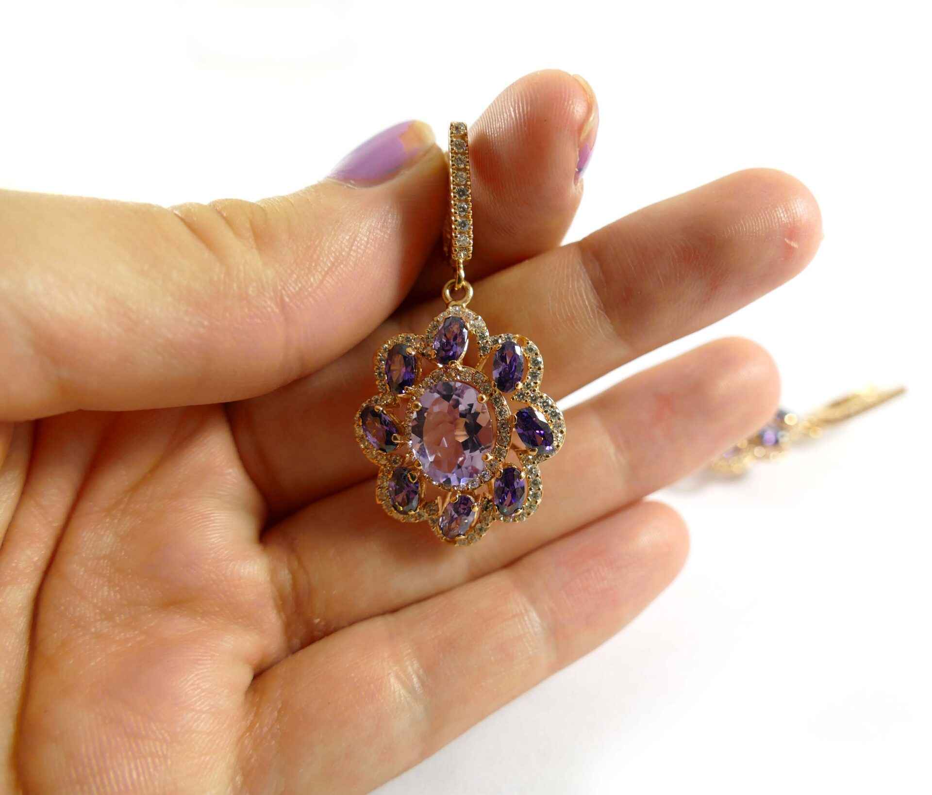 these absolutely stunning earrings are holding crisp purple amethyst stones and are set into 14k rose gold. There is one big amethyst stone surrounded by 8 smaller ones, on each earring. The design of these earrings are set into a flower shape, and dangle beautifully! the pair of purple and rose gold contrast perfectly, and really accent each other.