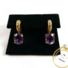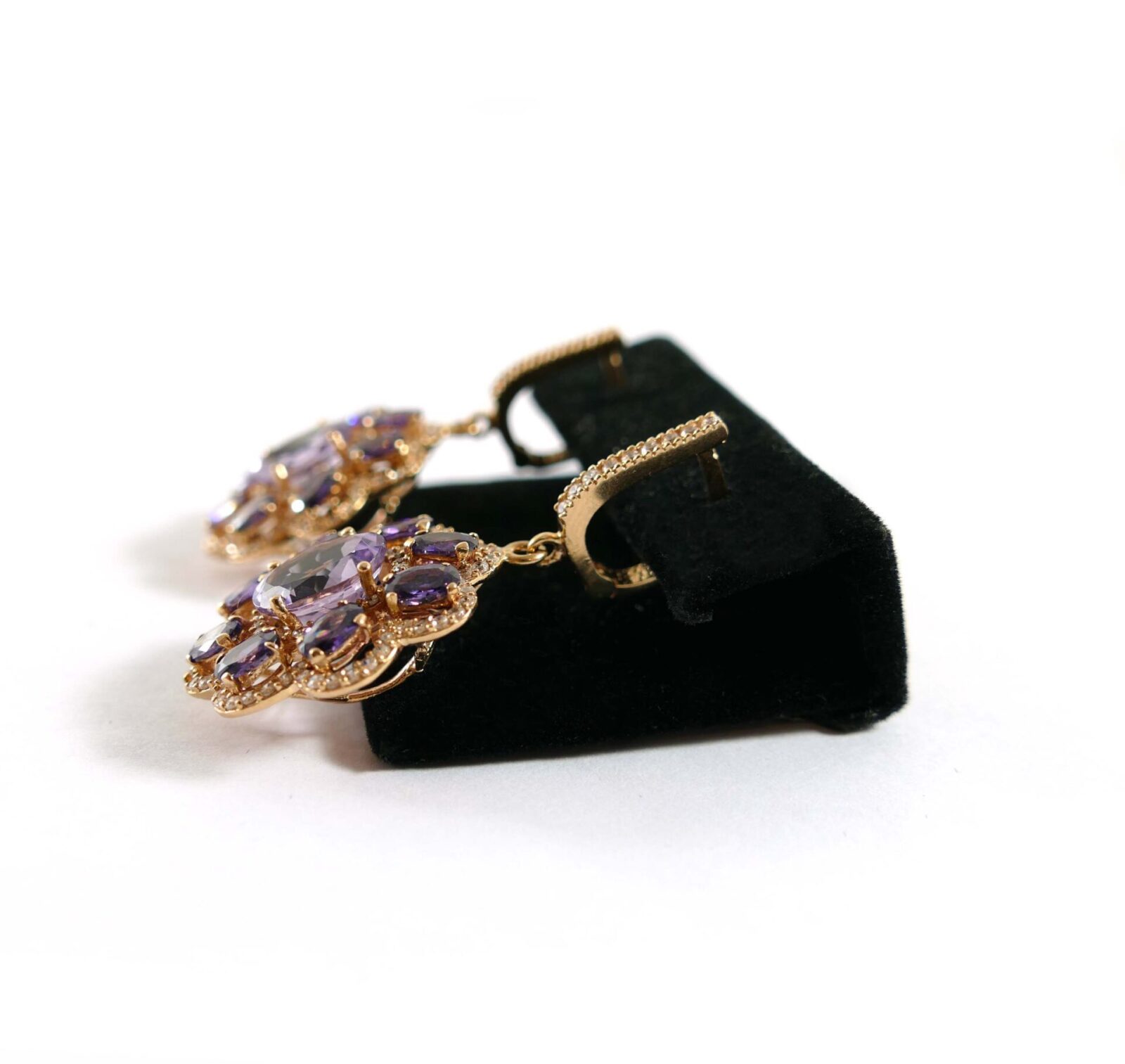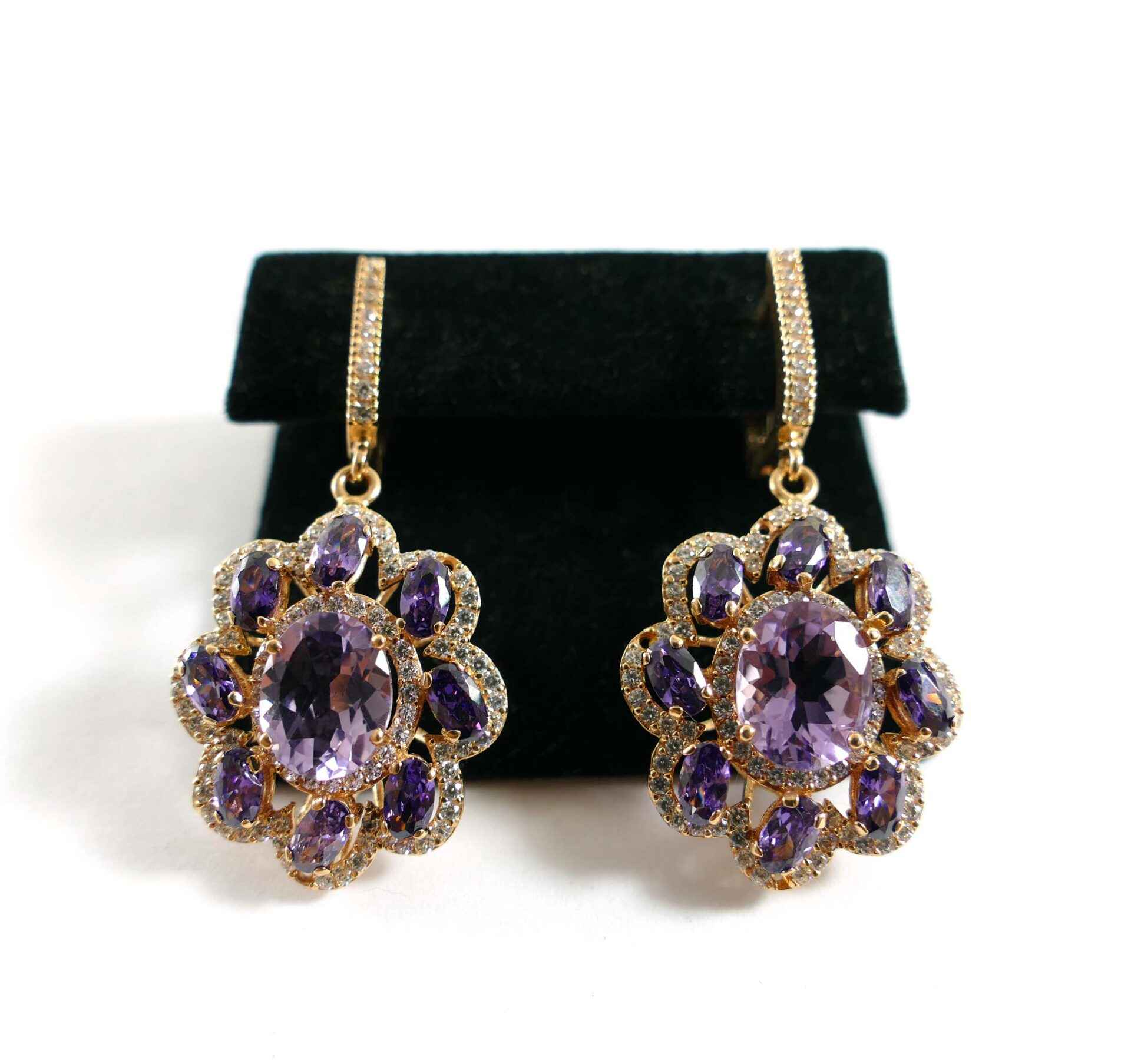 Product Description: These absolutely stunning earrings are holding crisp purple Amethyst stones and are set into 14k rose gold. There is one big amethyst stone surrounded by 8 sm...