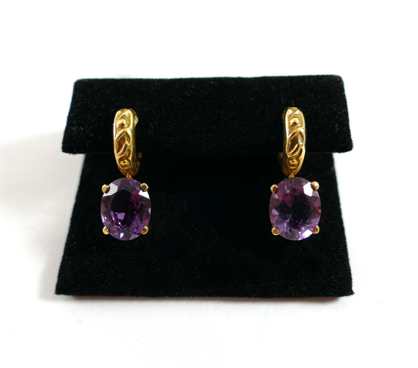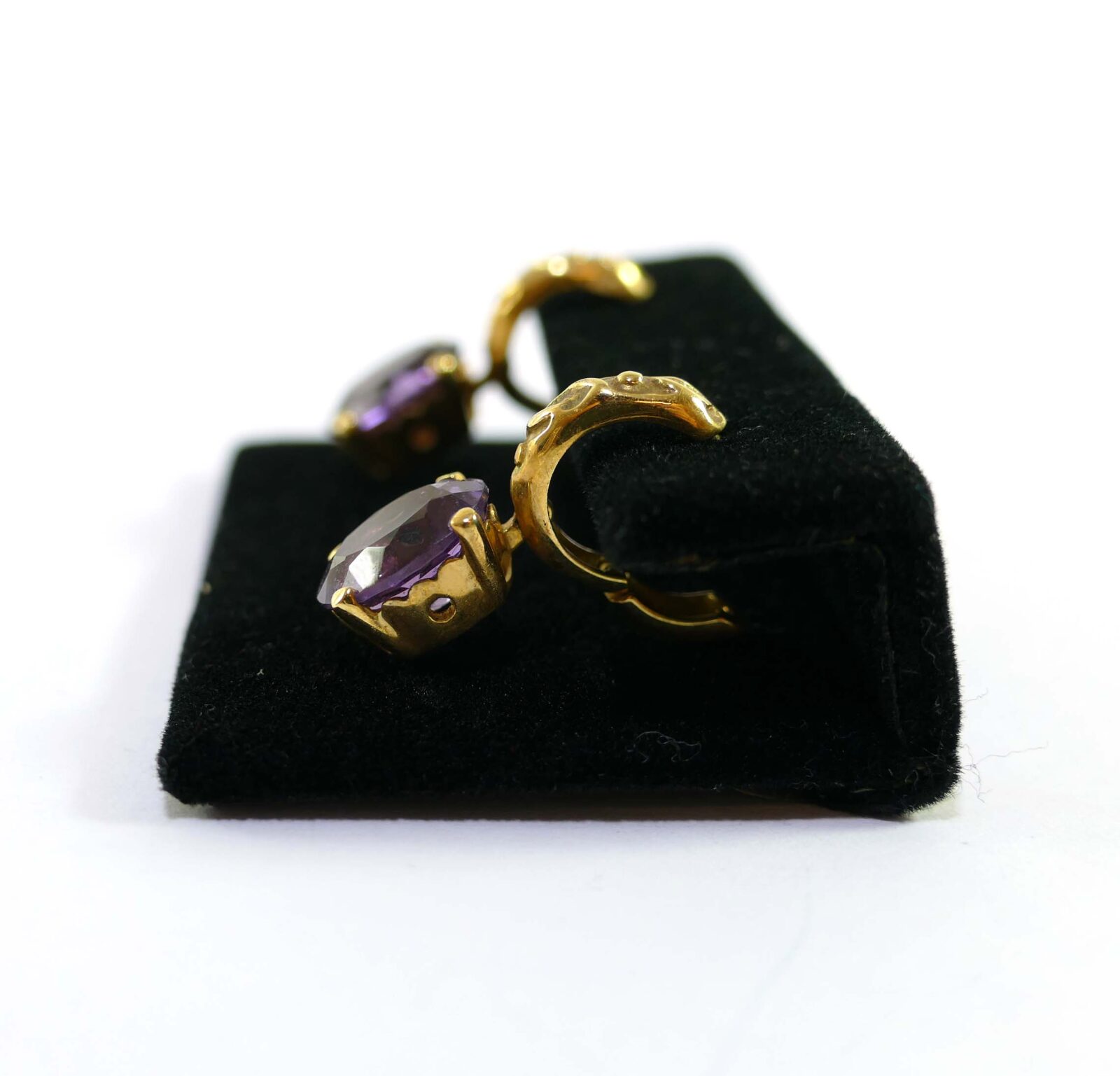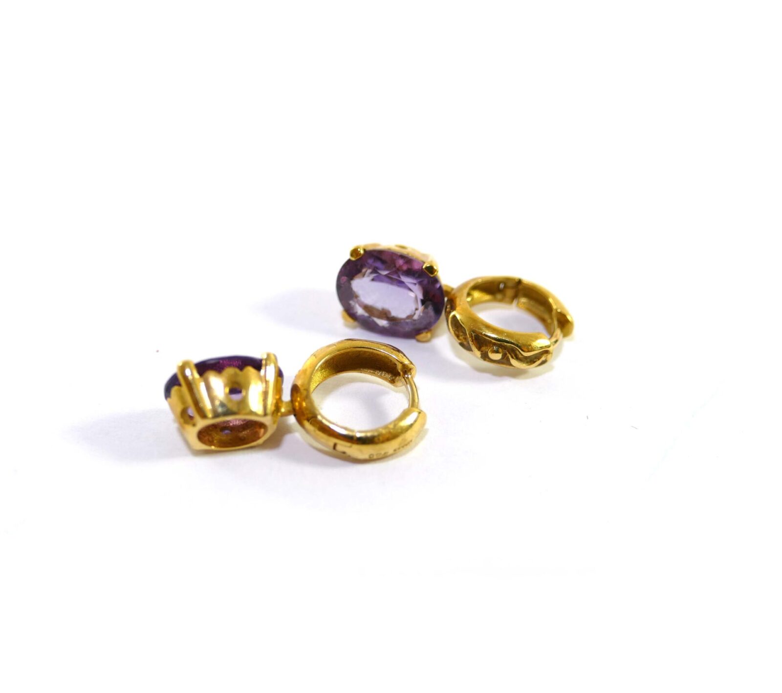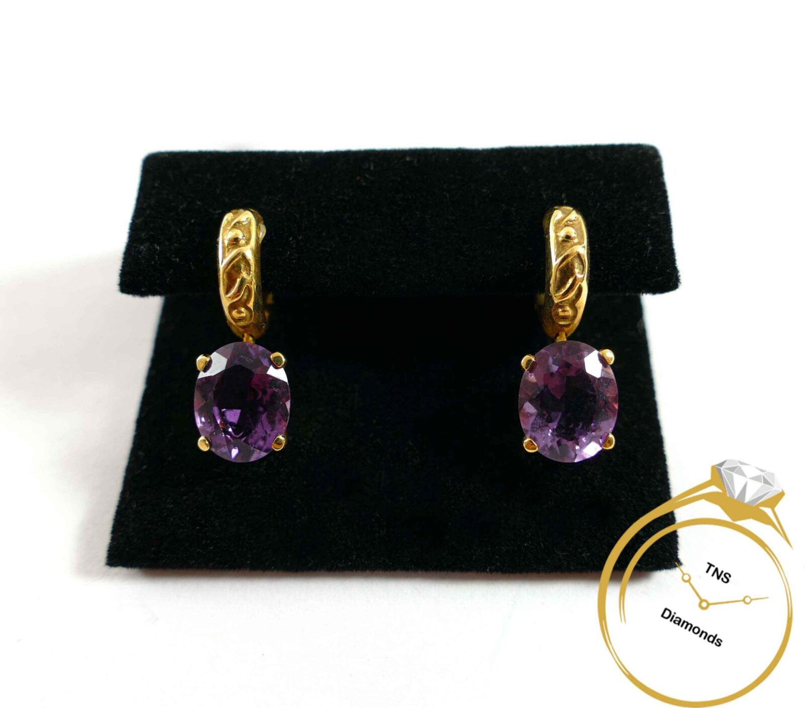 Product Description: These purple amethyst stones hold a bright color, set into solid 18k yellow gold to contrast beautifully. These earrings are a wonderful statement, and will p...