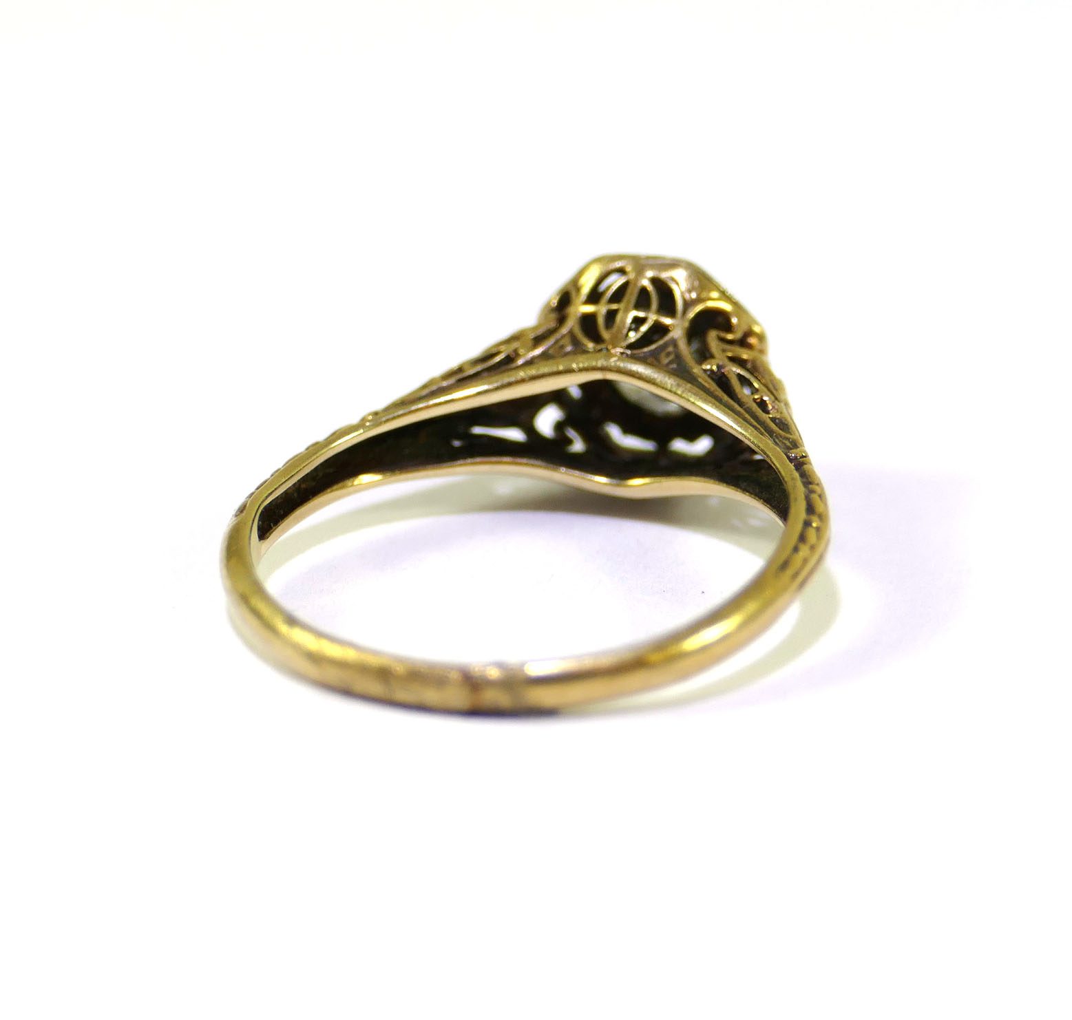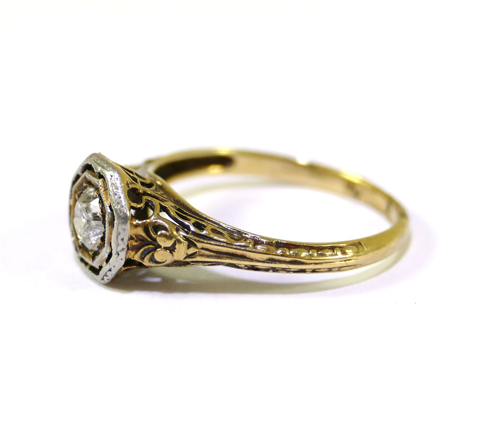 Product Description: This beautifully crafted and detailed ring is made up of 14k Yellow gold and platinum, with a diamond as the centerpiece. It's from the 1920-1930's, and classified as an antique. This ring is irreplac...