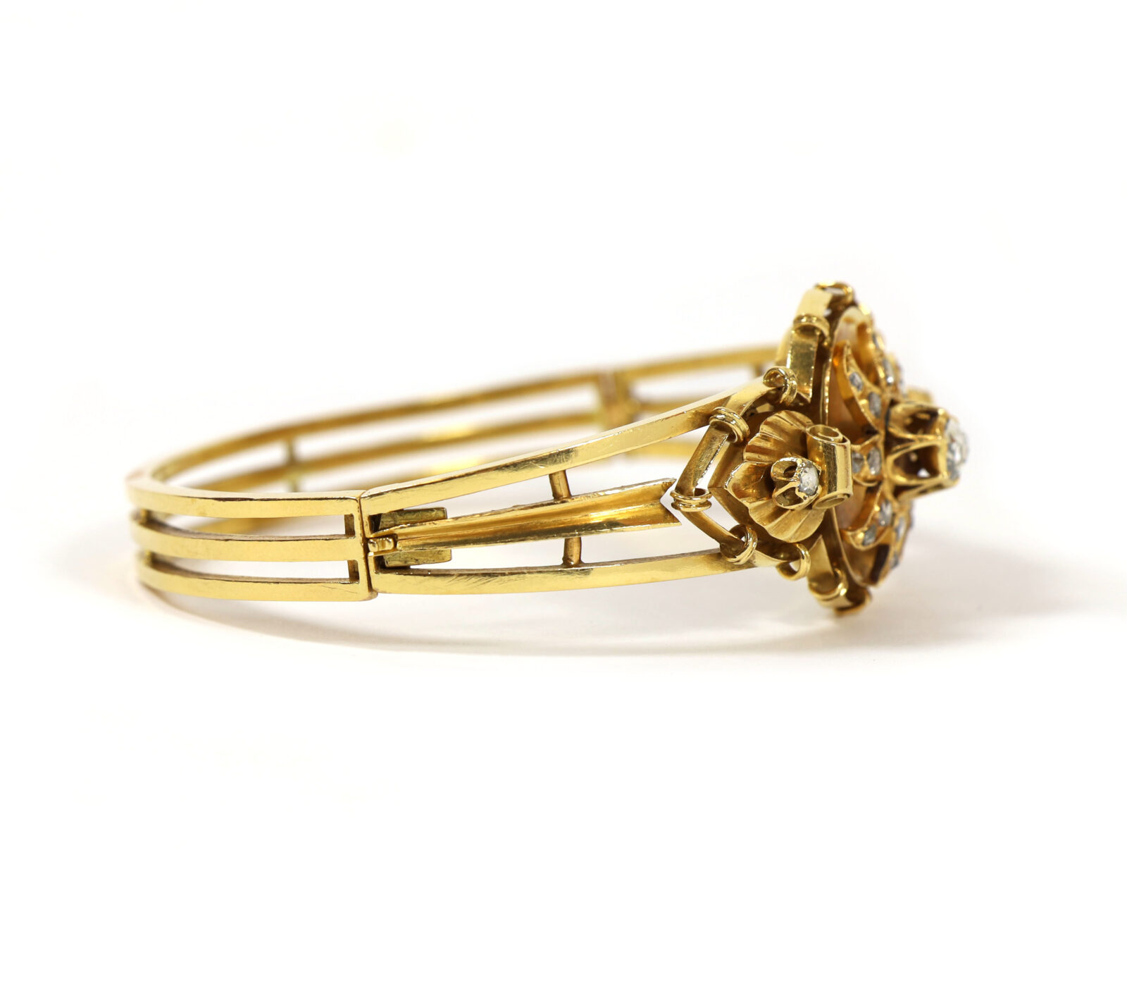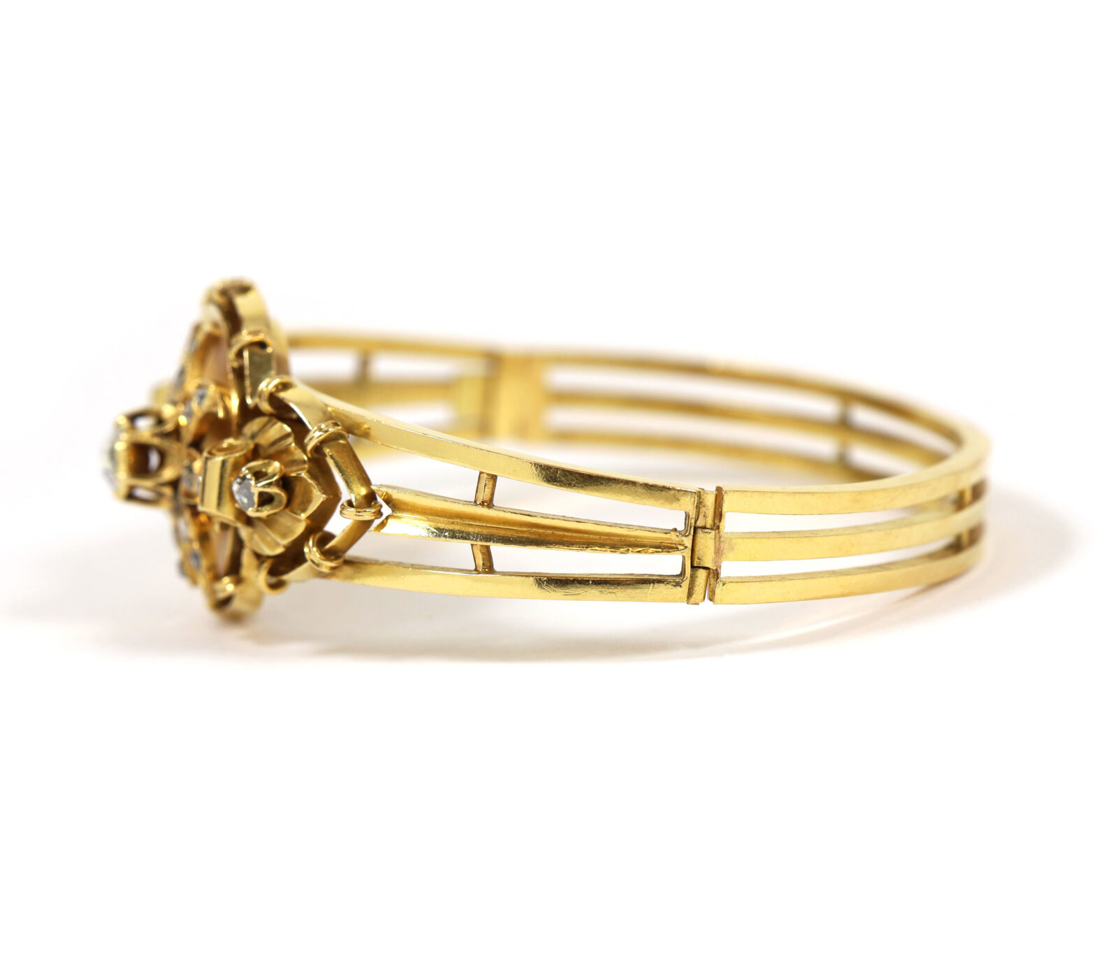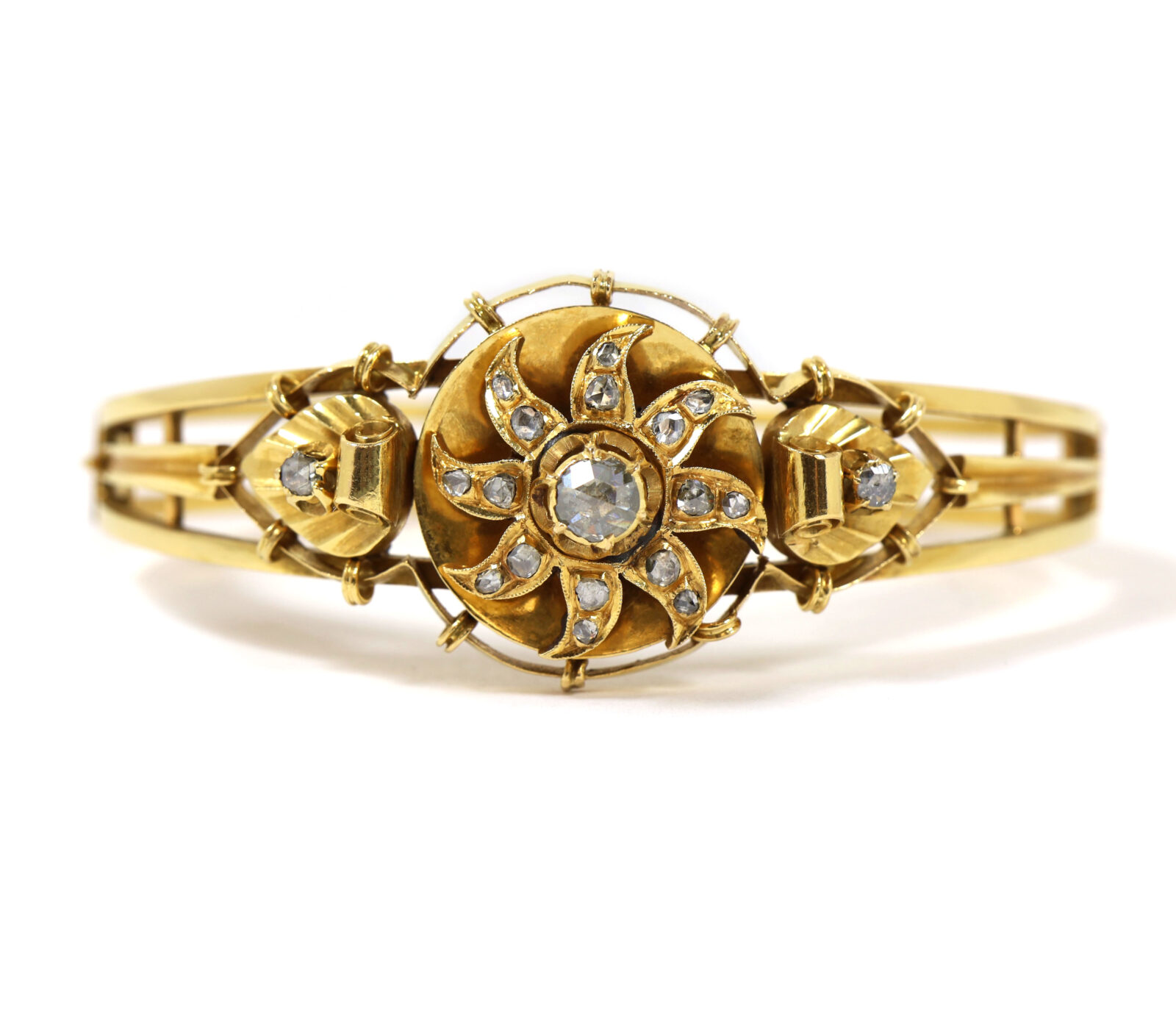 Read Moremetal: 18k yellow gold front width: 25mm back width: 8mm size: fits up to a 7” wrist gemstone: diamond carat weight total: approximately 0.75 carat cut: rose cut buy with confidence from tns diamonds, a trusted and established jeweler with a brick-and-mortar storefront and over 40 years of combined experience in the ethical watch and jewelry trade. At tns diamonds, we are proud to have trusted gia graduate gemologists on staff, ensuring that every piece of jewelry meets the highest standards of quality and craftsmanship. With our expertise and commitment to ethical practices, you can shop with peace of mind knowing you’re receiving a genuine product. If you have any questions or need further assistance, please don’t hesitate to reach out!