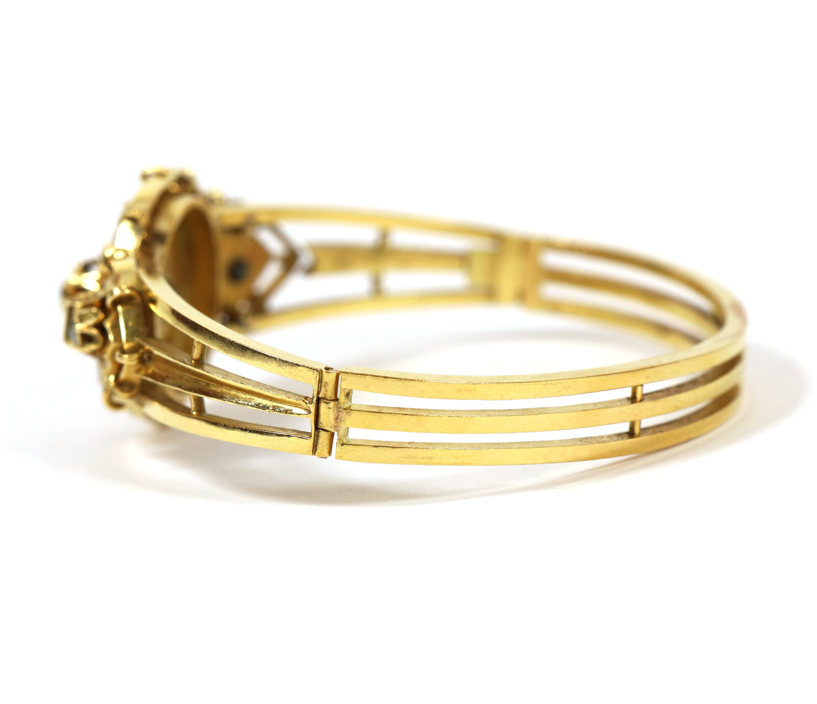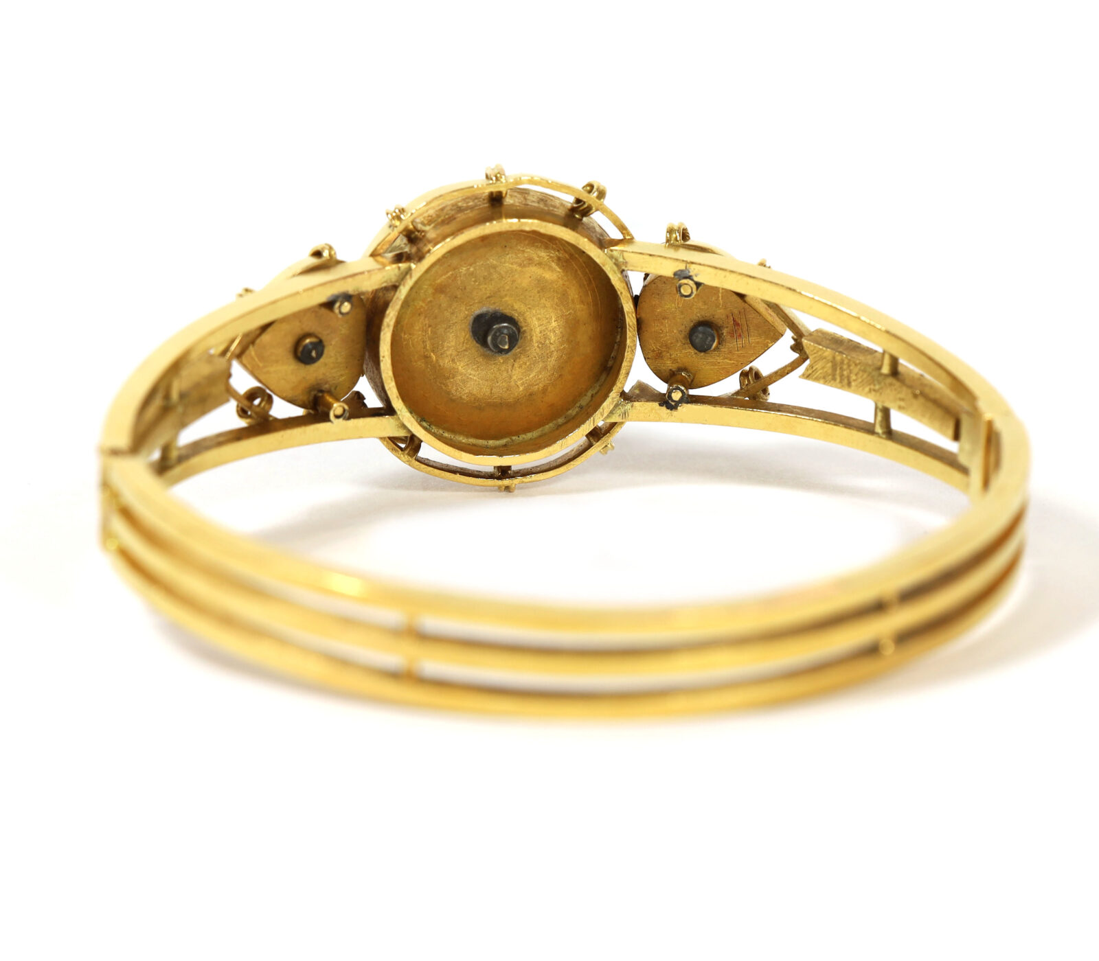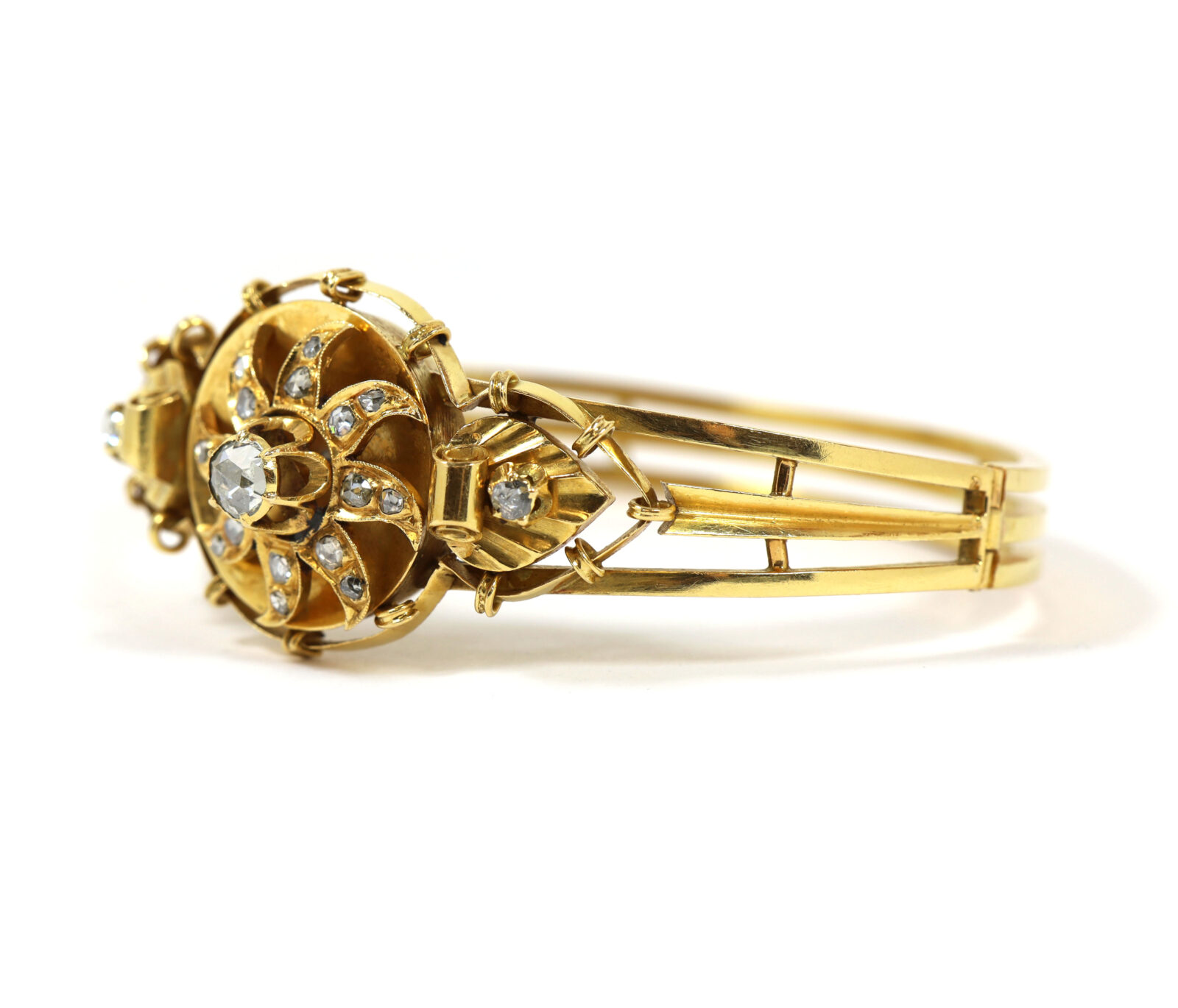 Read Moremetal: 18k yellow gold front width: 25mm back width: 8mm size: fits up to a 7” wrist gemstone: diamond carat weight total: approximately 0.75 carat cut: rose cut buy with confidence from tns diamonds, a trusted and established jeweler with a brick-and-mortar storefront and over 40 years of combined experience in the ethical watch and jewelry trade. At tns diamonds, we are proud to have trusted gia graduate gemologists on staff, ensuring that every piece of jewelry meets the highest standards of quality and craftsmanship. With our expertise and commitment to ethical practices, you can shop with peace of mind knowing you’re receiving a genuine product. If you have any questions or need further assistance, please don’t hesitate to reach out!