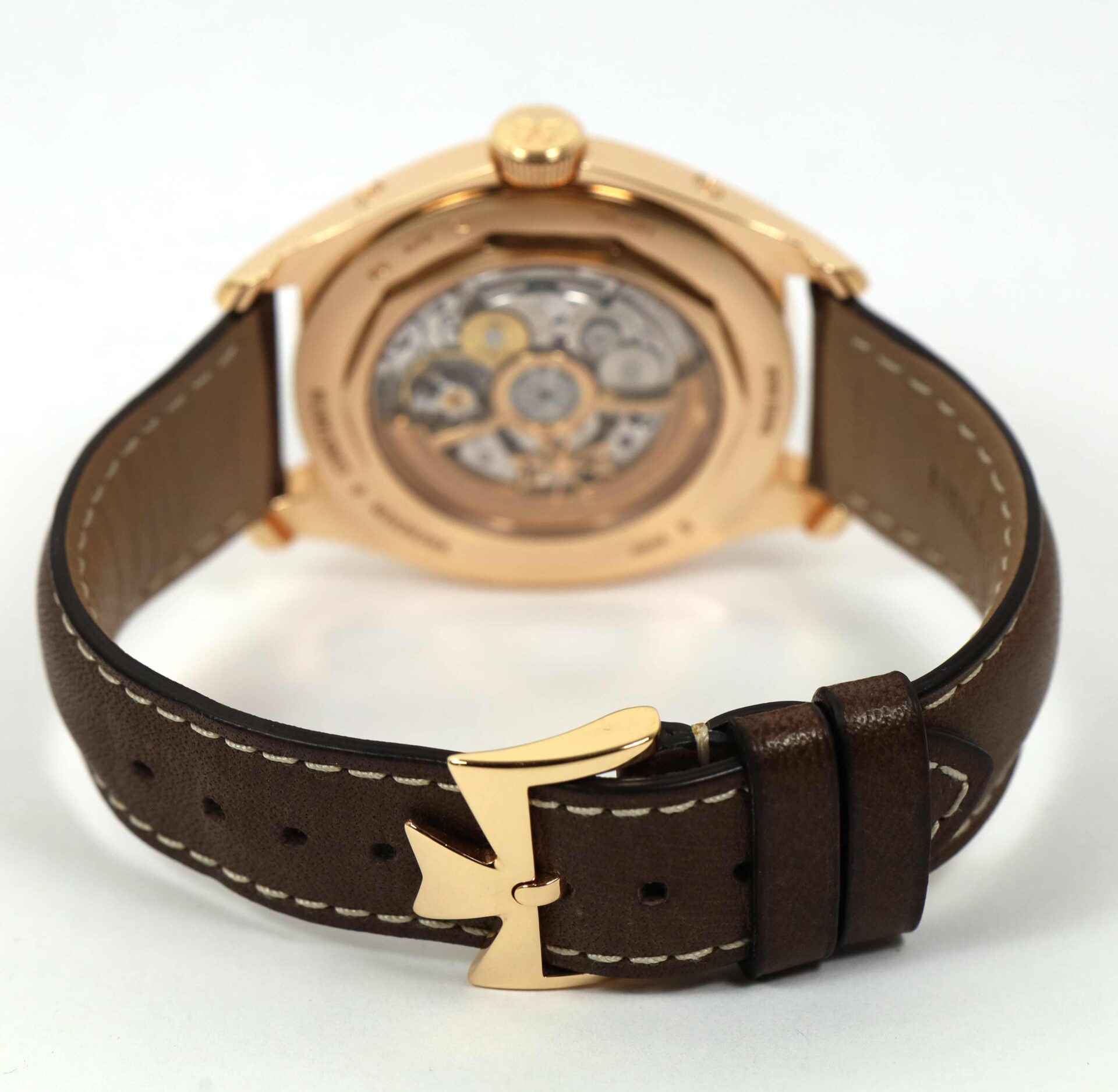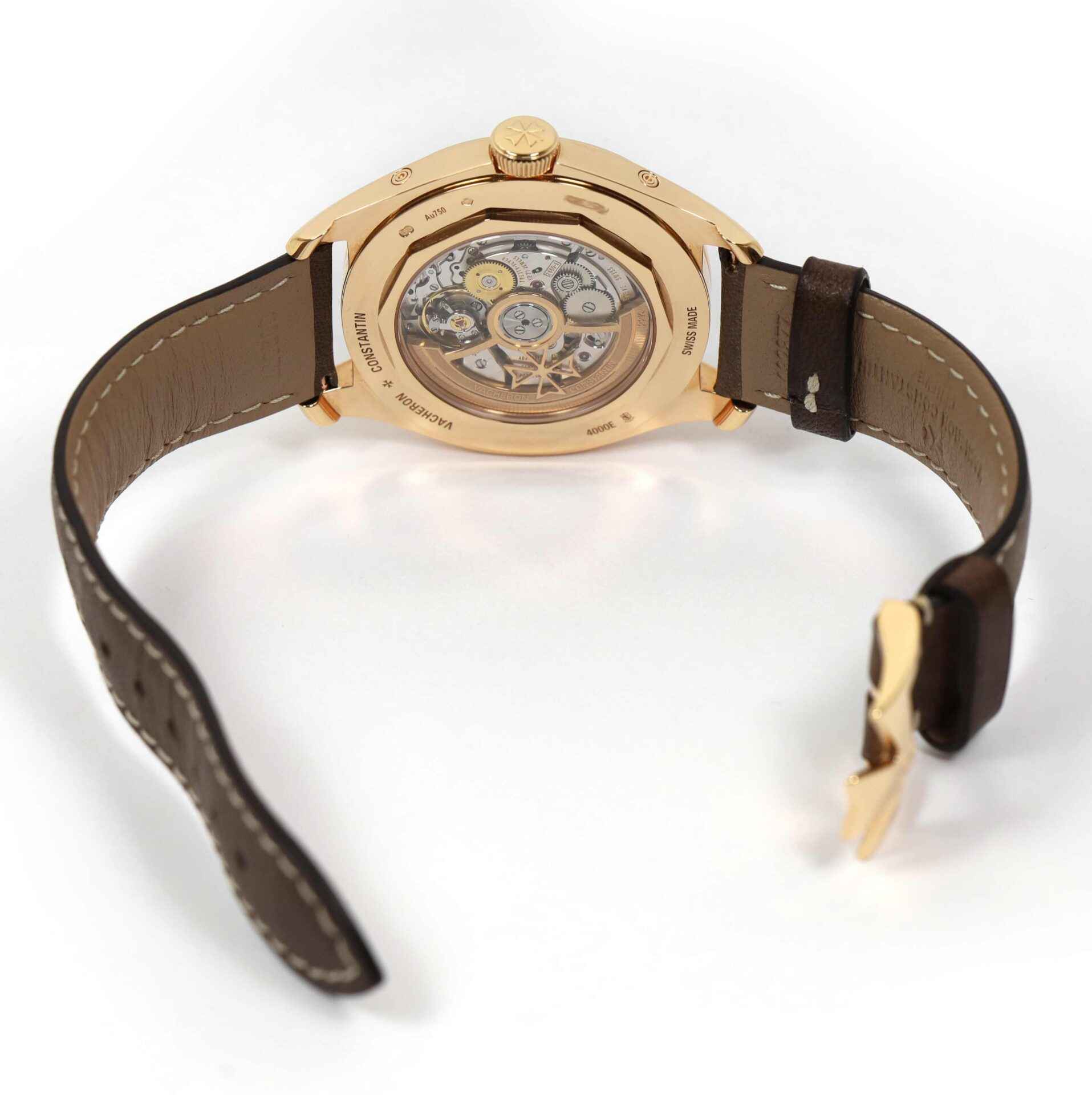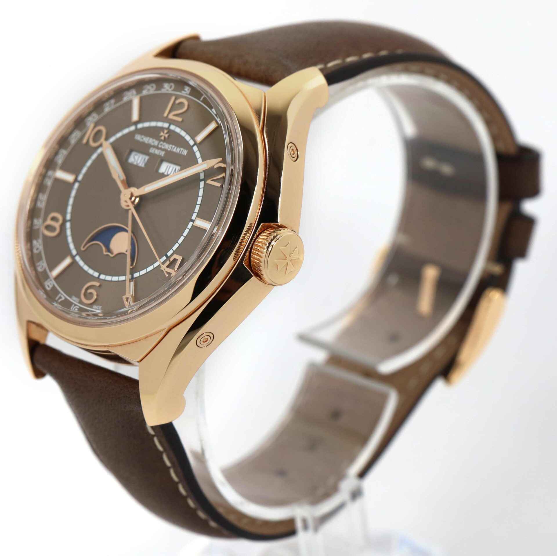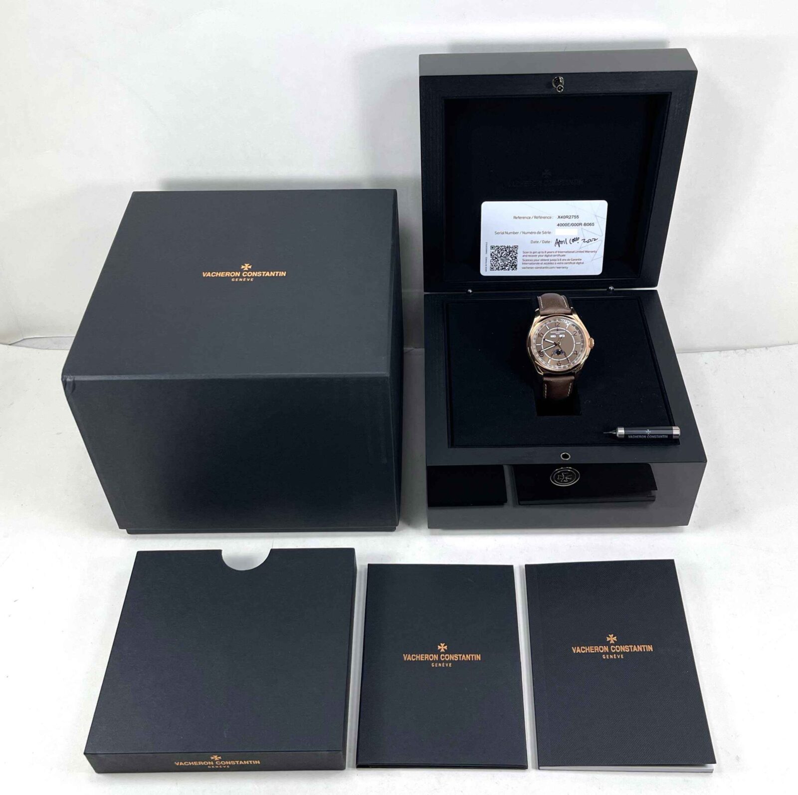 Read Morethis vacheron is in mint condition and comes with its box, papers, vc tool, and warranty card dated april 10th, 2022. This watch features an 18k rose gold case that surrounds a brown dial displaying a complete calendar with the annual moon phase and comes on a brown calfskin leather strap.