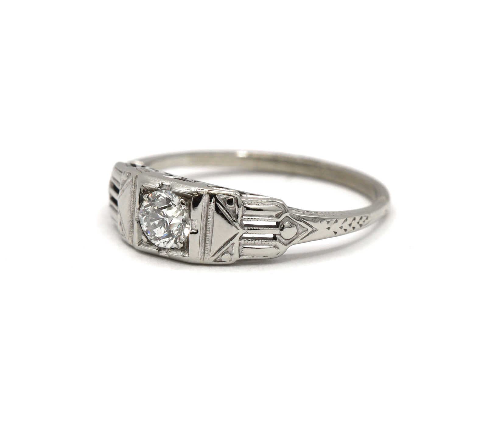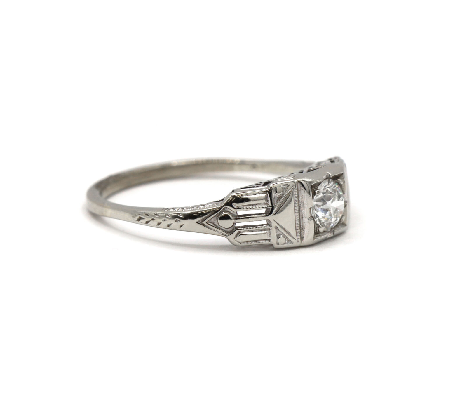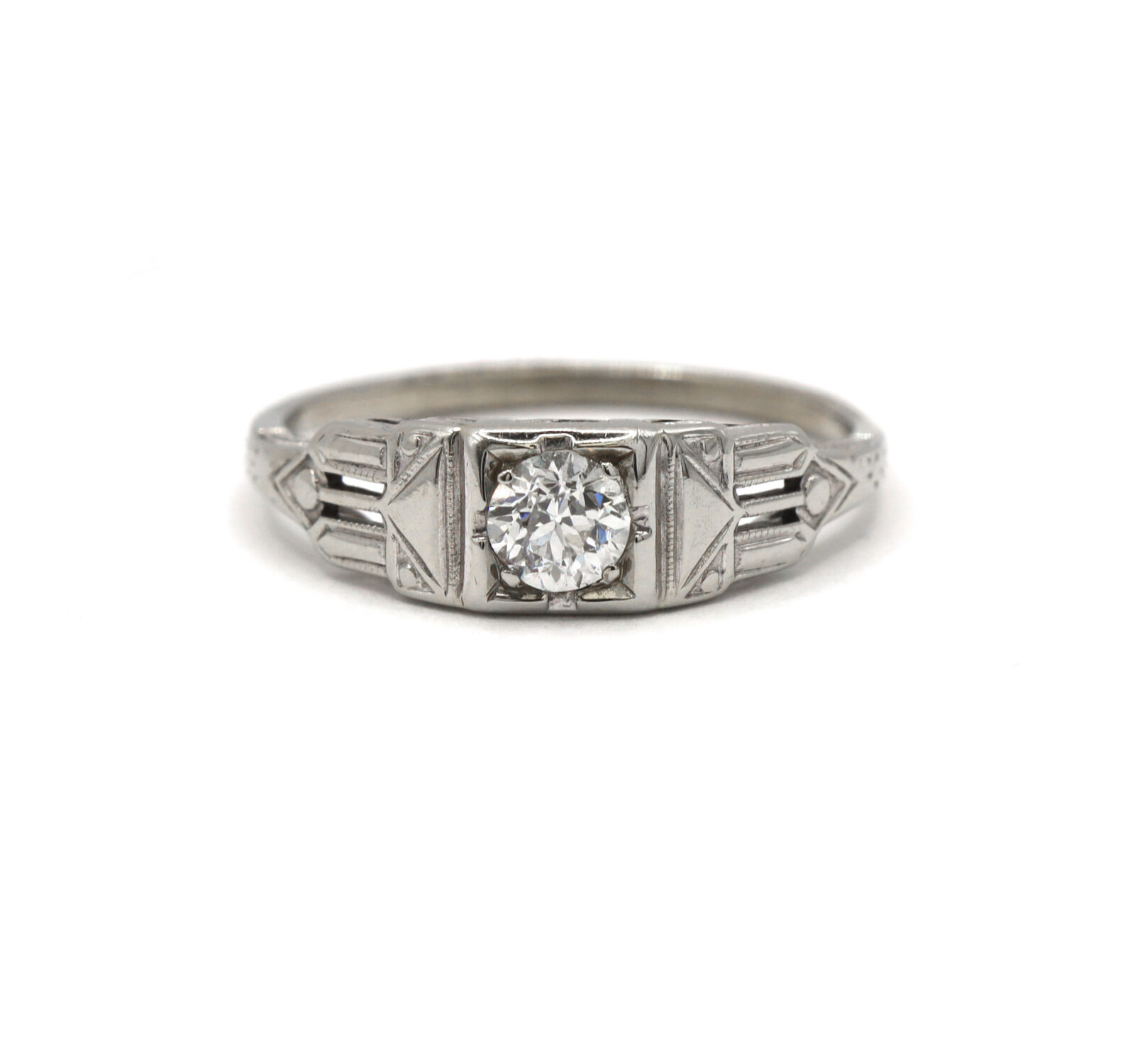 metal: 14k white gold – shank has been reinforced with 10k white gold gemstone: diamond center stone carat weight: approximately 0.41 carat clarity: vs2 color: g cut: old european cut weight: 2.5 grams band width: 1.5mm size: 9.25