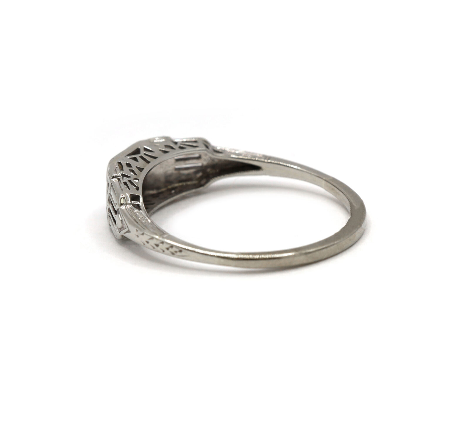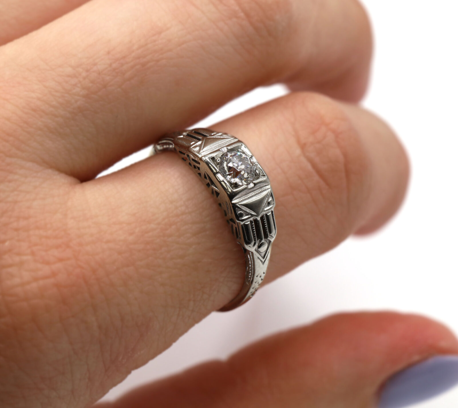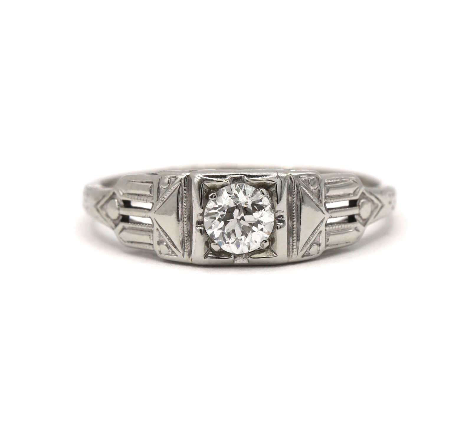metal: 14k white gold – shank has been reinforced with 10k white gold gemstone: diamond center stone carat weight: approximately 0.41 carat clarity: vs2 color: g cut: old european cut weight: 2.5 grams band width: 1.5mm size: 9.25