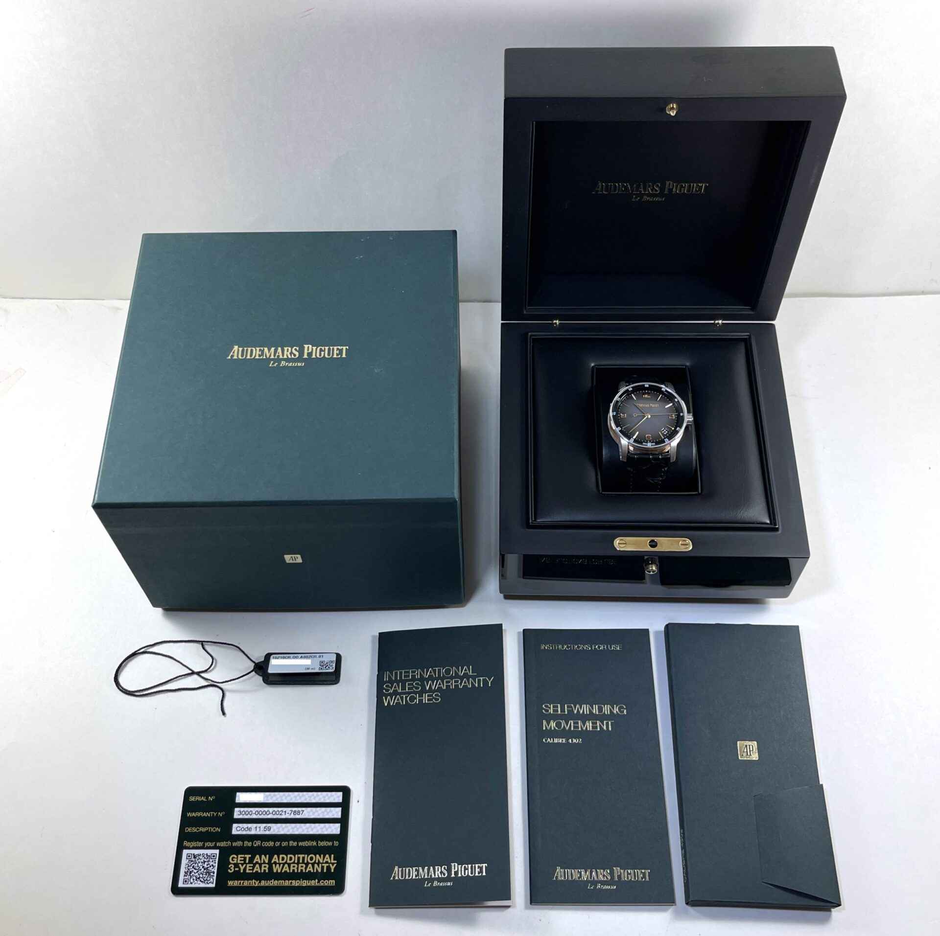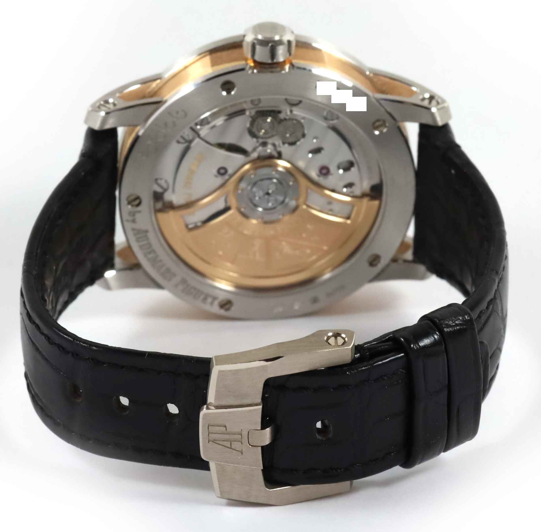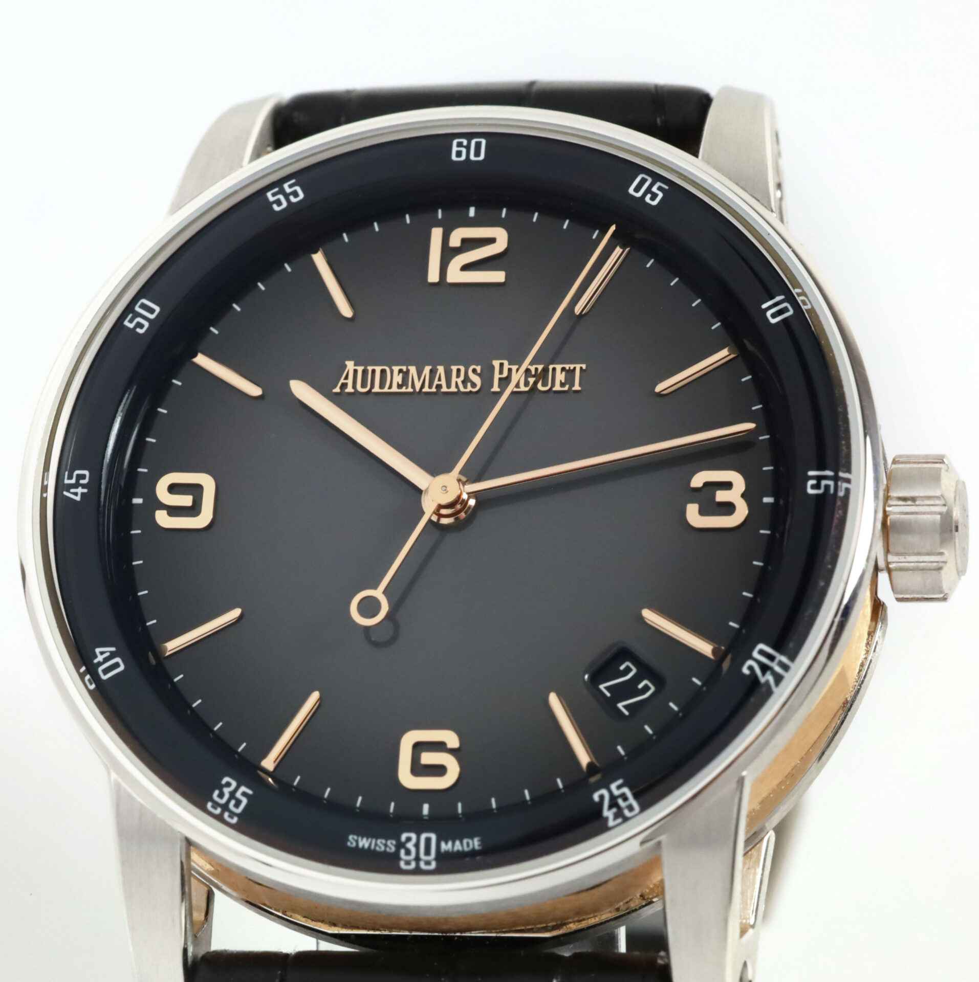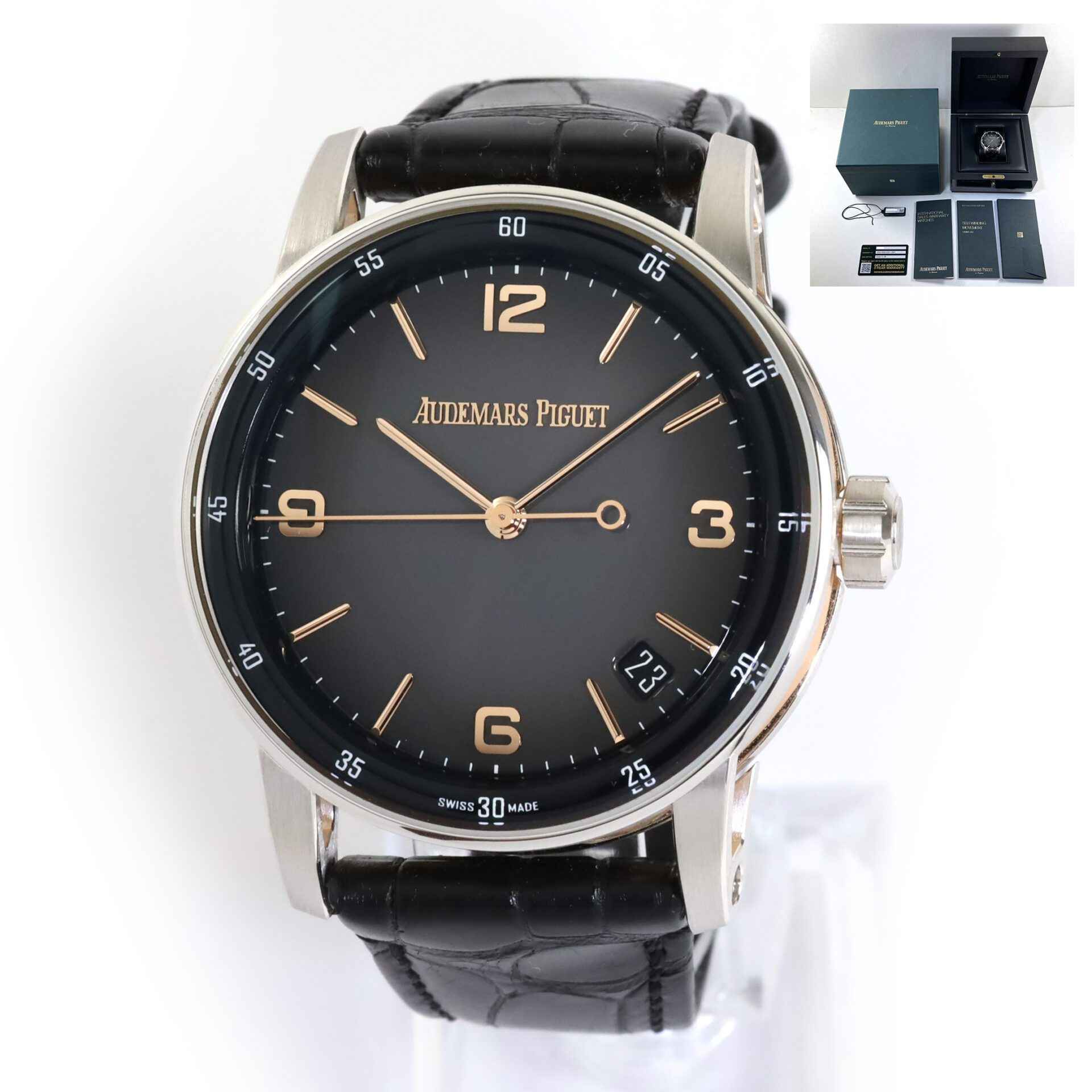 Read Morethis audemars piguet watch is in excellent condition and comes with its complete set of box, papers, hang tag, and warranty card. This watch features a rose gold case surrounding a smoked lacquered grey dial with a sunburst pattern throughout with rose gold hour marker and hands. This watch is in stock and available to ship immediately!