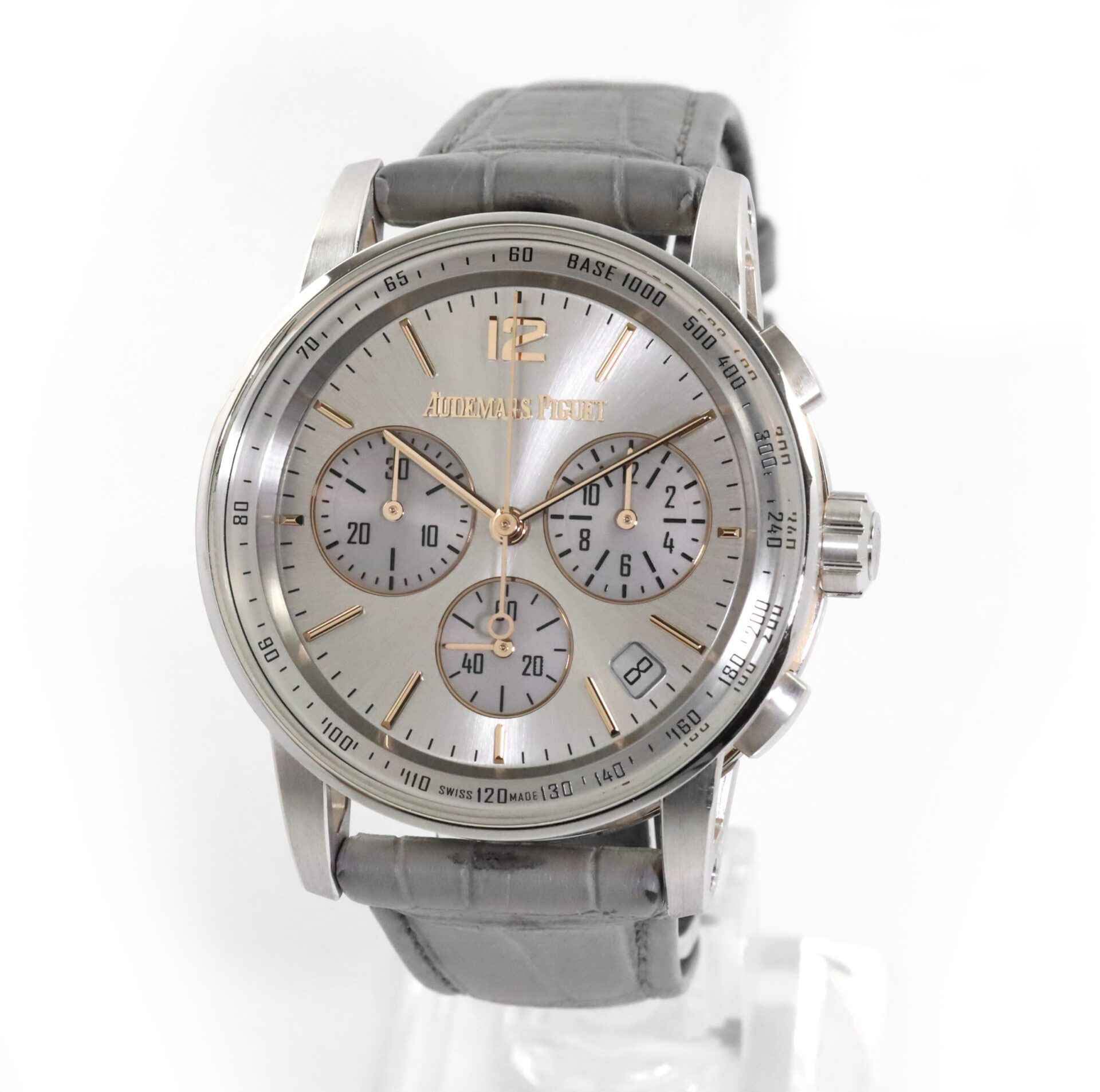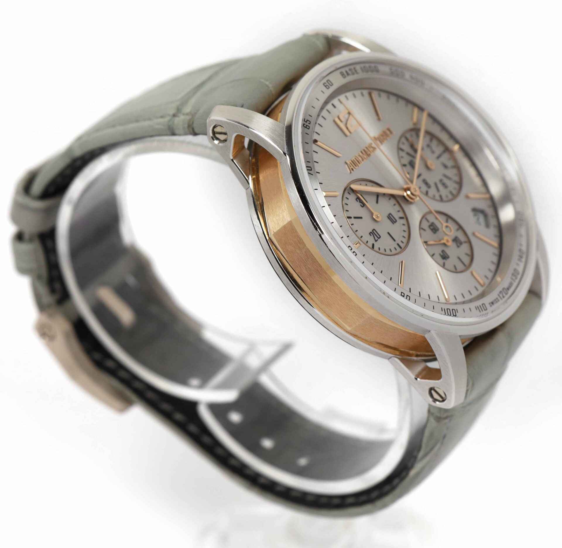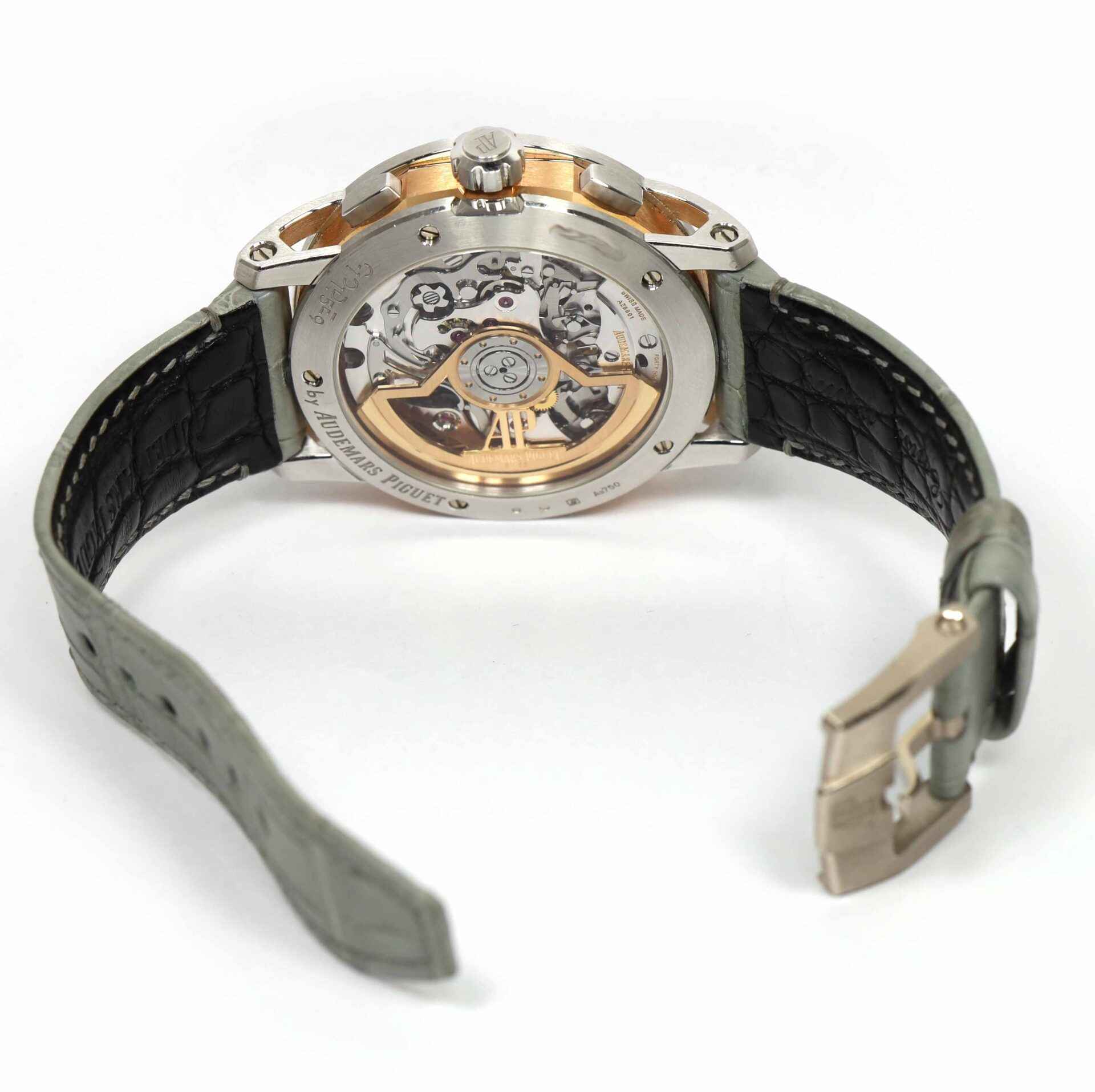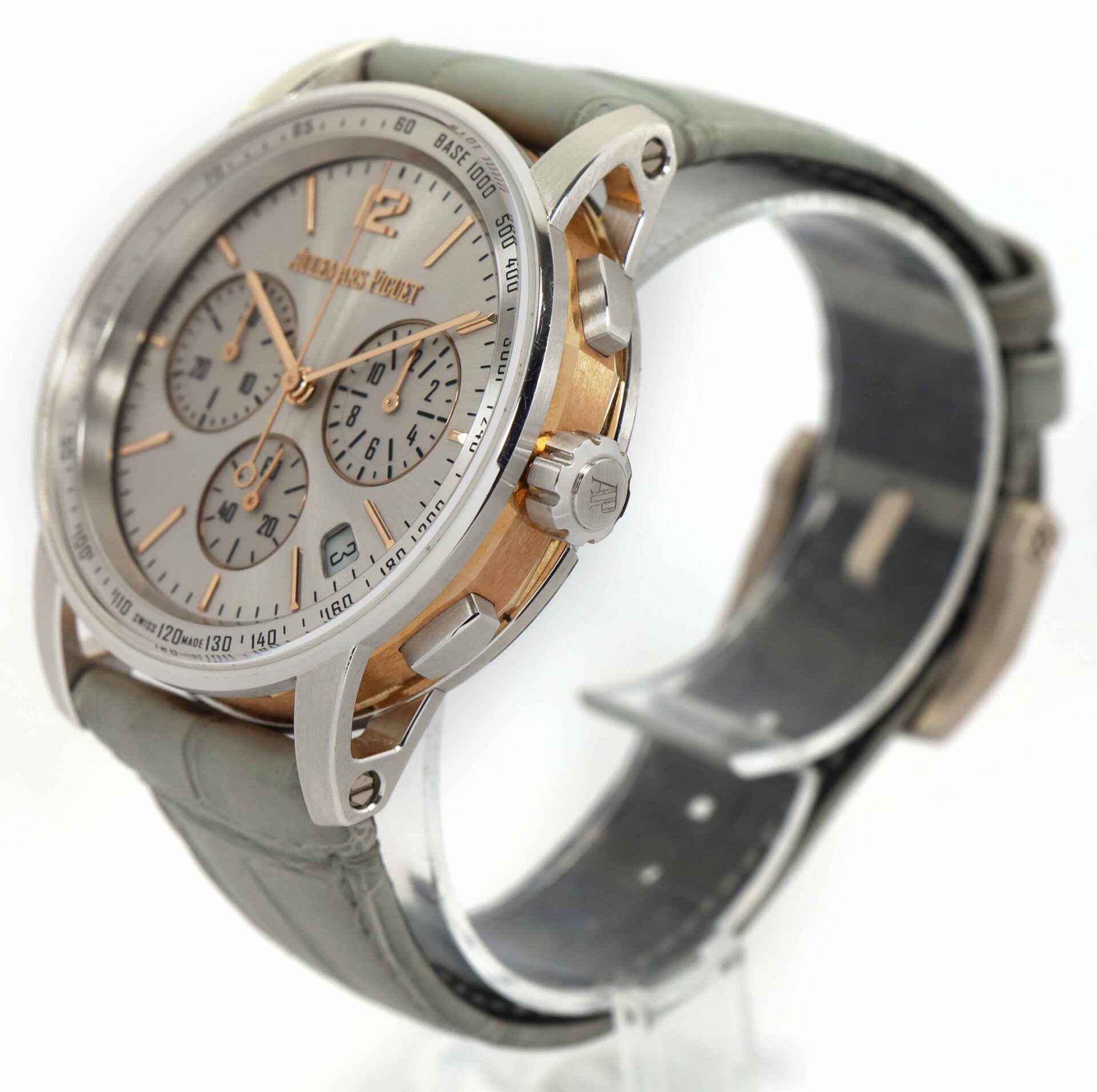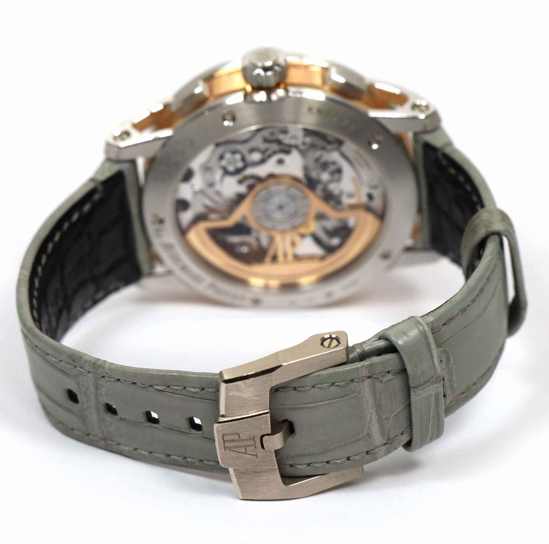 Read Morethis audemars piguet is in excellent condition and comes as watch only as shown in the pictures attached. this watch features a two-tone case blending 18k white and rose gold surrounding a sunburst grey lacquered dial. The strap on this watch is grey alligator leather and is sized to fit a smaller wrist.