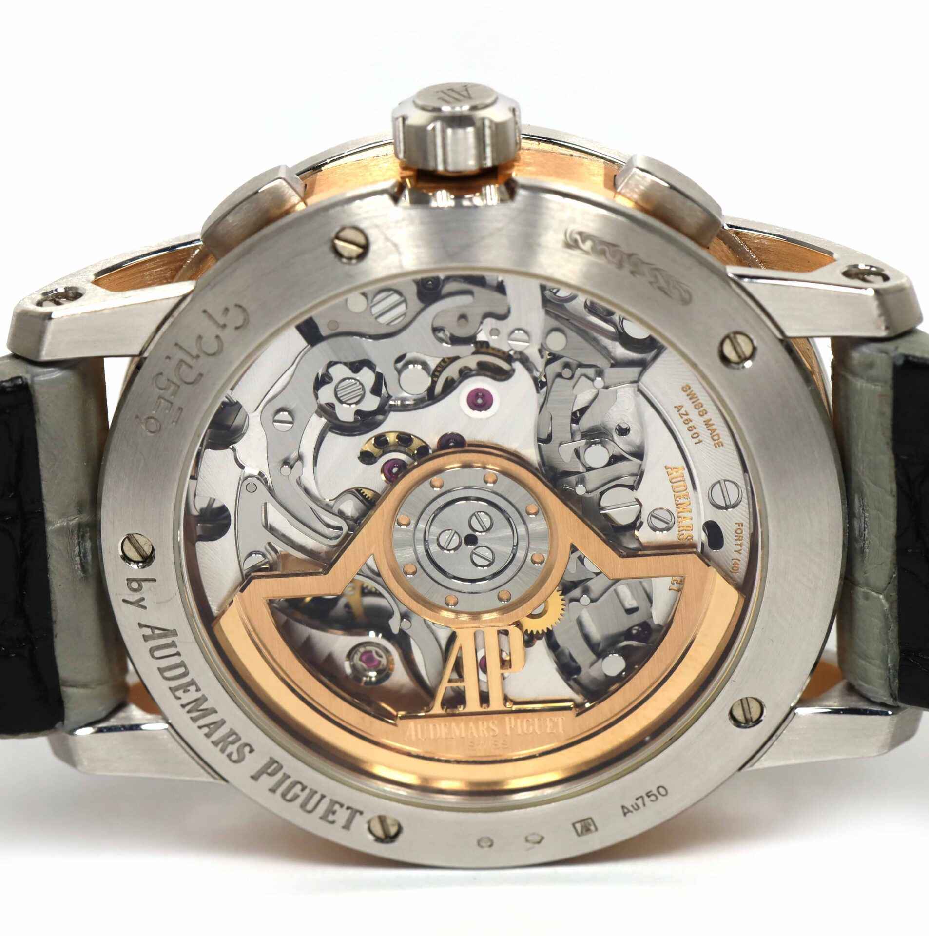 This Audemars Piguet is in excellent condition and comes as watch only as shown in the pictures attached. This watch features a two-tone case blending 18k white and rose gold surrounding a sunburst grey lacquered dial. T...
